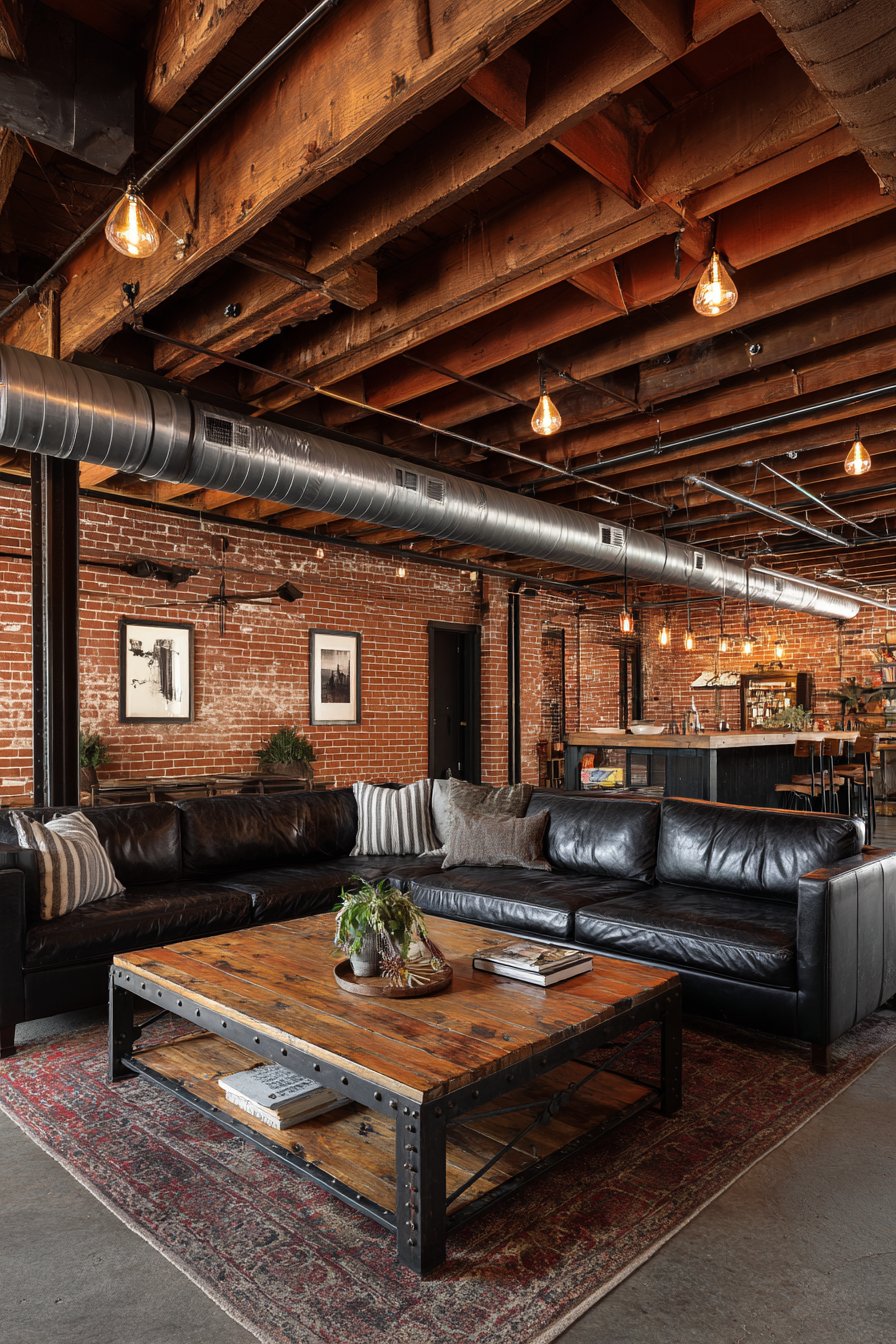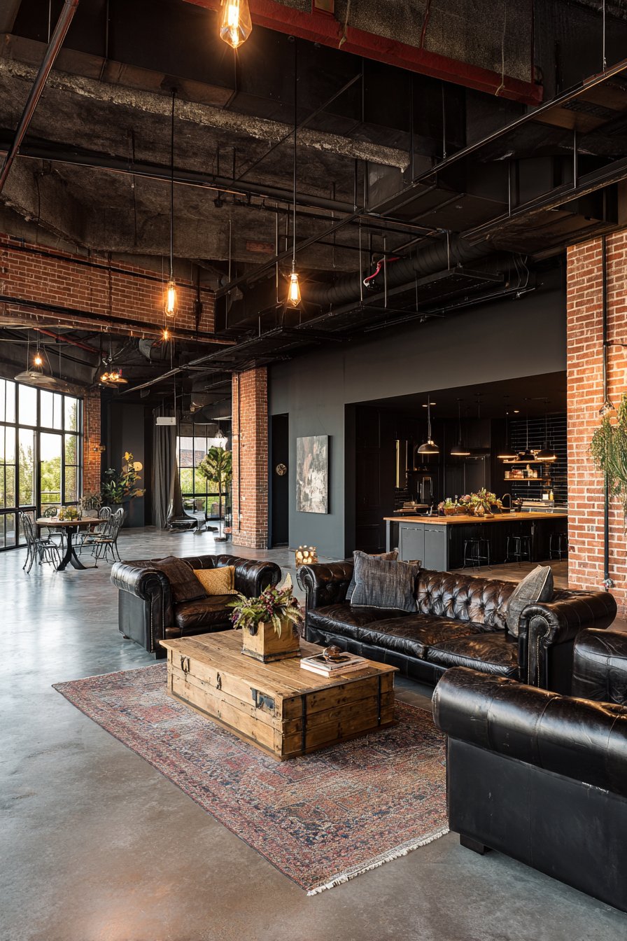 Edison bulb pendant lights hanging from exposed ductwork provide warm ambient lighting while showcasing the industrial appreciation for vintage technology and visible infrastructure. The exposed ductwork and structural elements that might be concealed in other design styles become decorative features here, painted or left raw depending on desired aesthetic. This sitting room proves that industrial doesn’t mean cold—when balanced with warm woods and comfortable textiles, it creates compelling urban character.