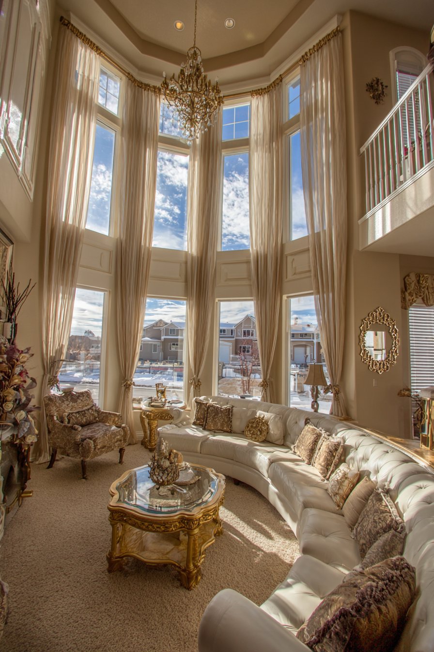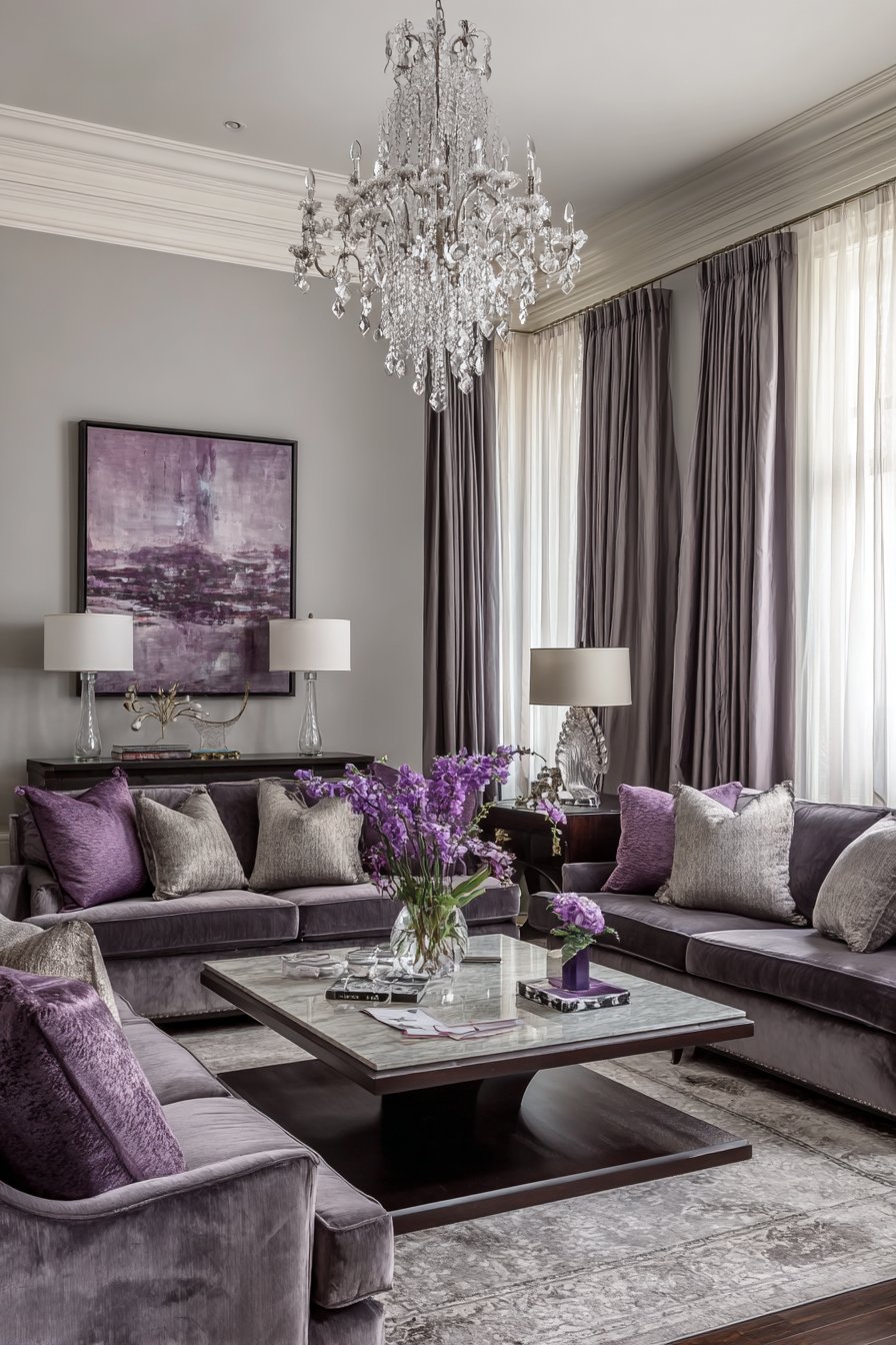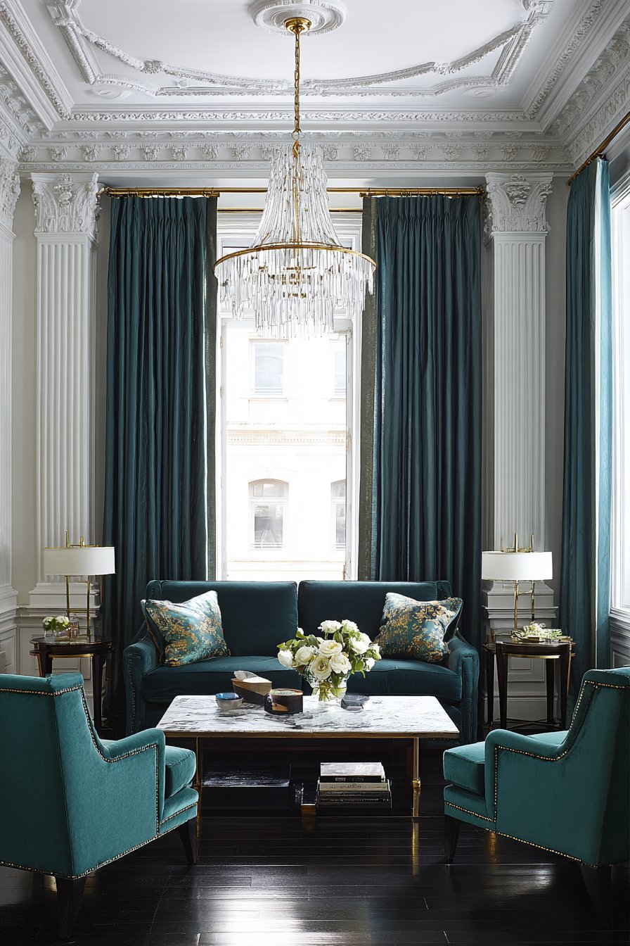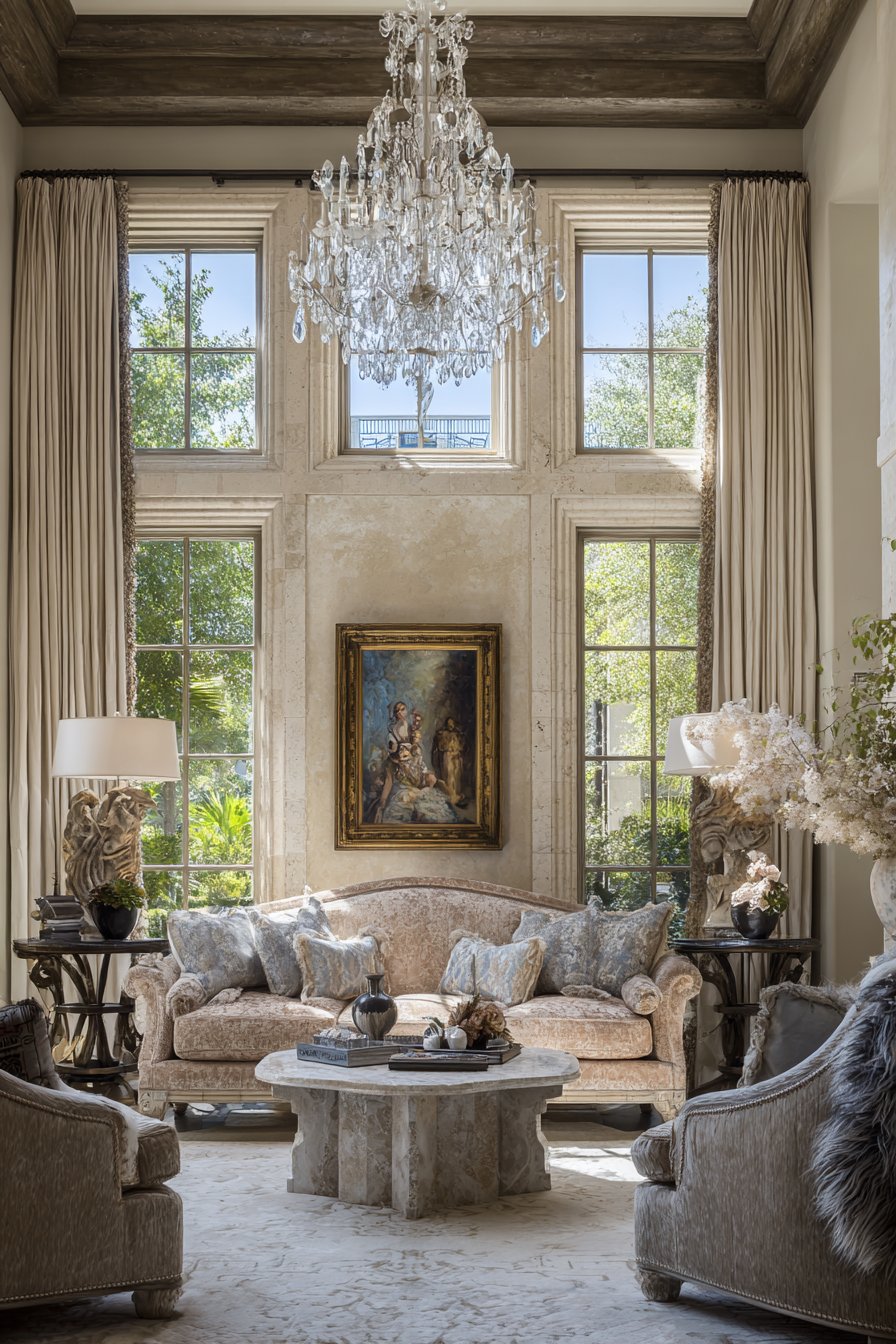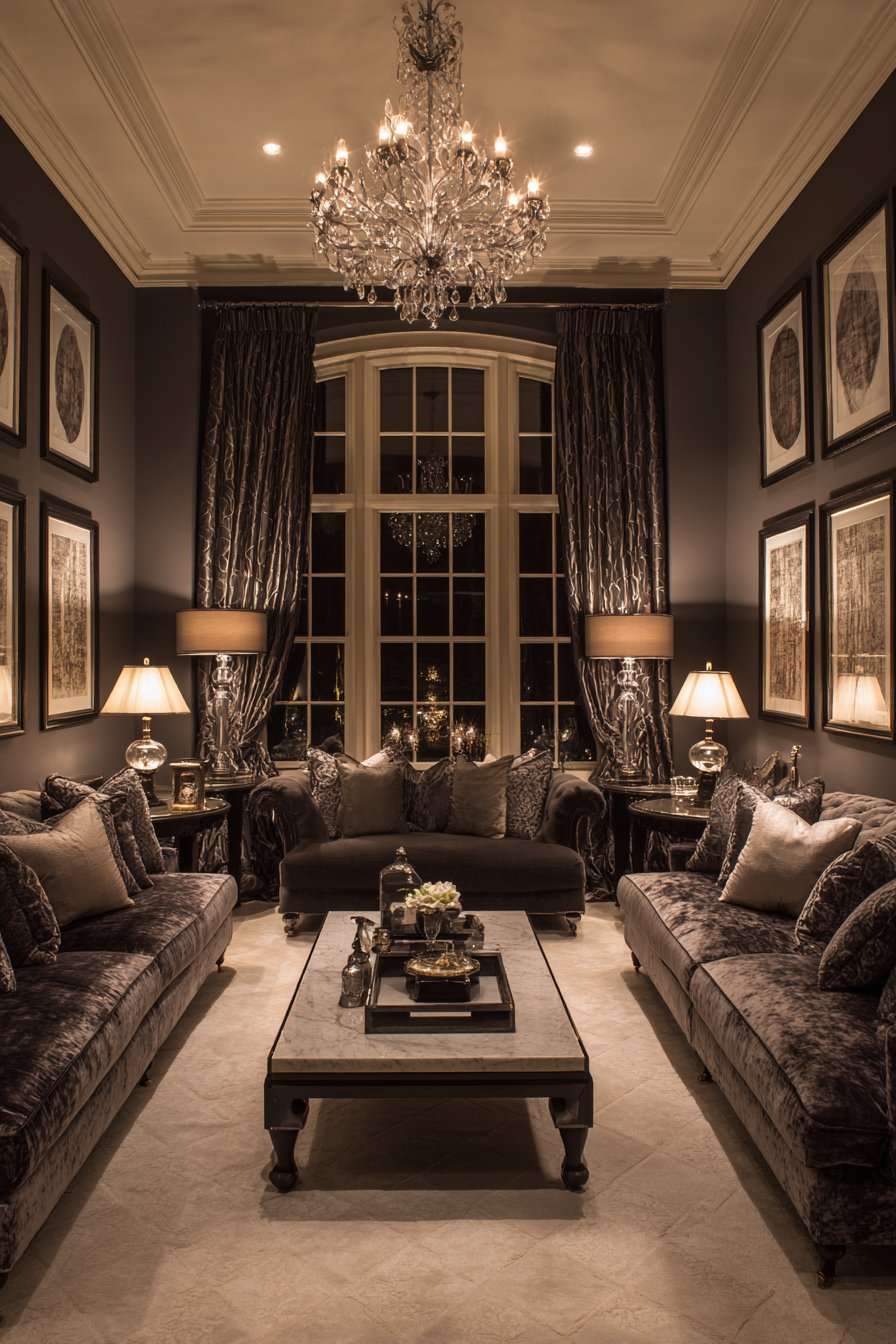 Key Design Tips: Arrange matching sofas facing each other to create formal symmetry and facilitate face-to-face conversation during entertaining. Choose velvet upholstery for its luxurious texture and light-catching qualities that add depth and richness. Install crystal chandeliers for sparkling ambient lighting that creates special occasion atmosphere. Select heavy drapes in quality fabrics to add gravitas and provide light and temperature control. Incorporate antique side tables and silk pillows to add refined decorative layers and textural luxury.