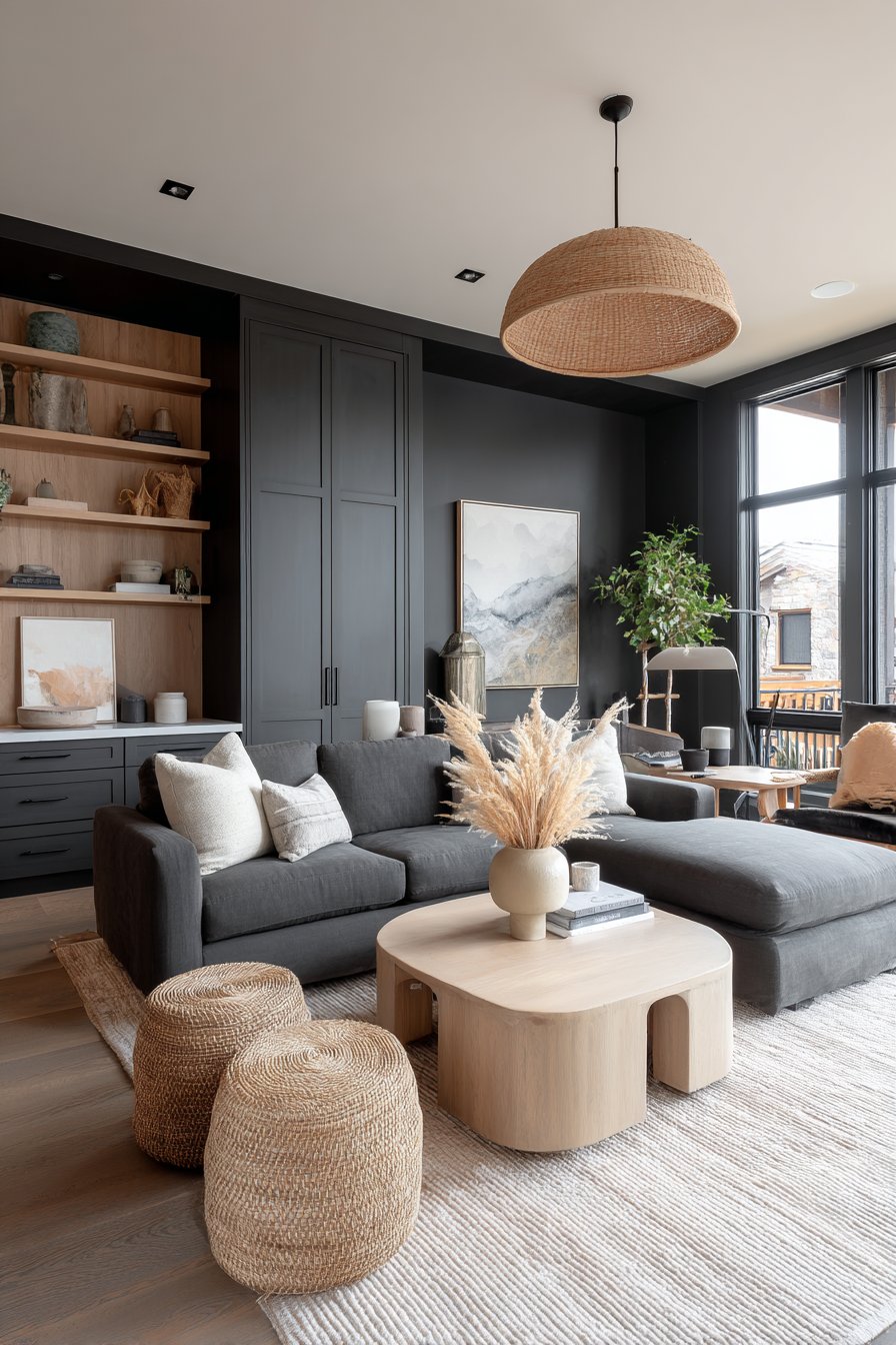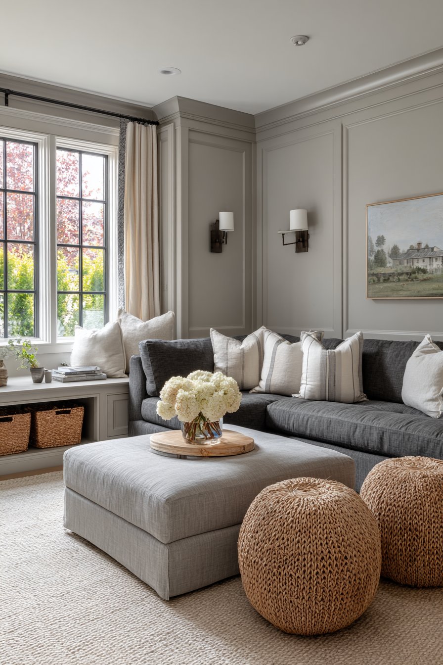 The color palette remains intentionally neutral, allowing the textures and materials to create visual interest without overwhelming the senses. The grey upholstery provides a sophisticated foundation that pairs beautifully with the warm wood tones and natural fiber rug, creating a balanced composition that feels both contemporary and timeless. This combination of elements results in a sitting room that welcomes guests while remaining practical for everyday family life.