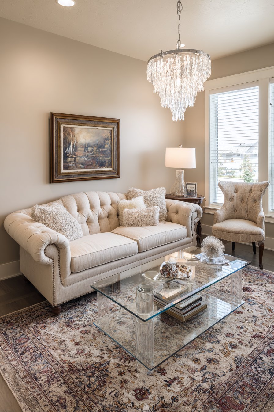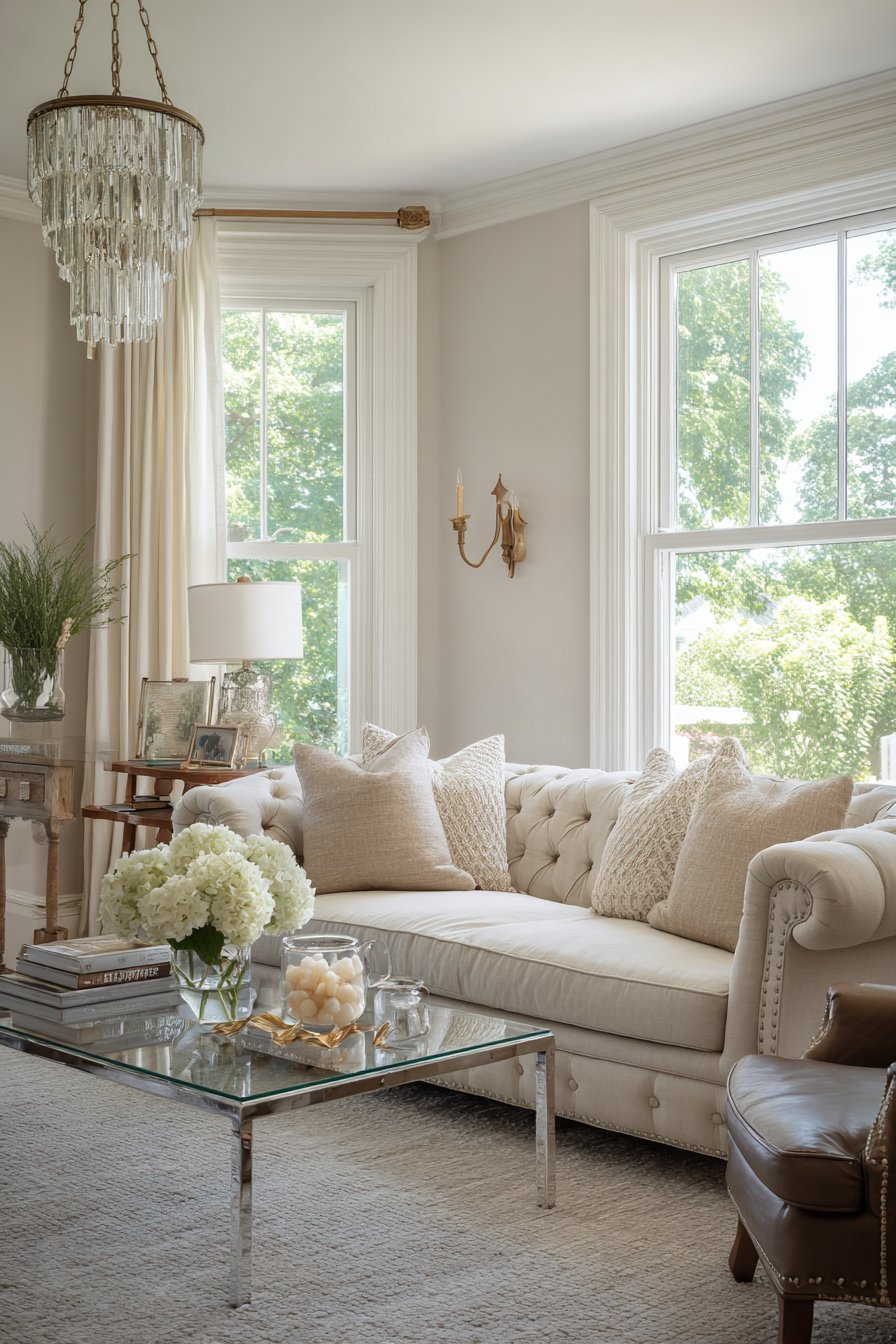 This sitting room successfully bridges traditional and contemporary design sensibilities, creating a timeless aesthetic that transcends passing trends. A rolled-arm sofa upholstered in linen represents traditional comfort while its neutral fabric and clean construction feel current. The modern glass coffee table introduces contemporary transparency and lightness, creating visual contrast with the more substantial upholstered pieces.