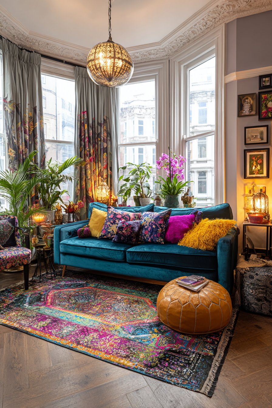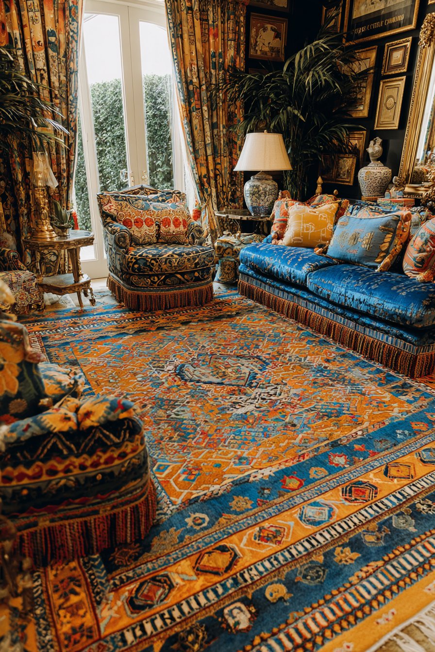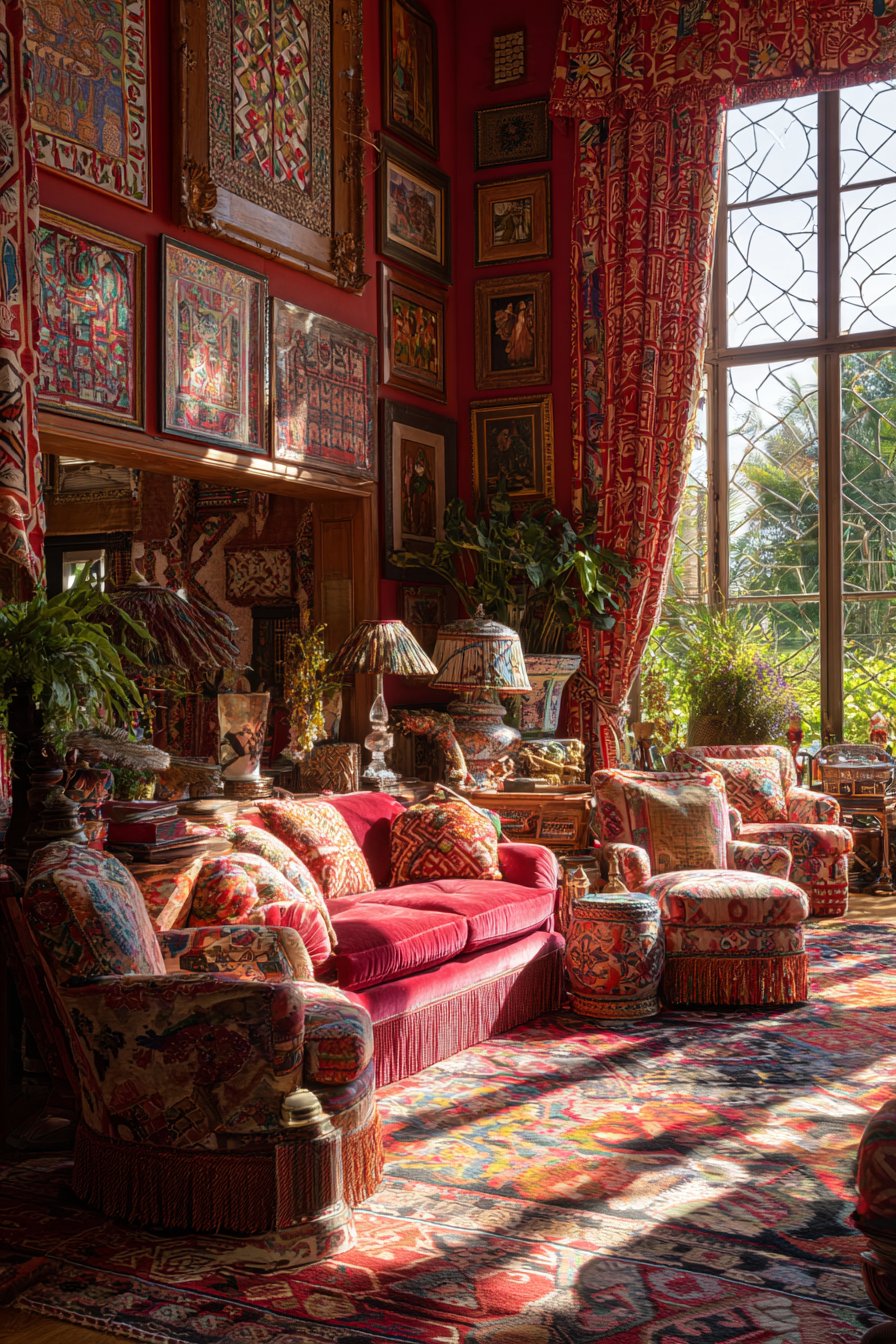 Elaborate window treatments featuring trim, tassels, and luxurious fabrics make windows architectural focal points rather than mere openings. A gallery wall with ornate frames displays diverse artwork in a carefully composed arrangement that creates visual impact through abundance rather than restraint. Multiple area rugs layer for additional pattern and visual depth, their overlapping edges creating zones within the larger room.