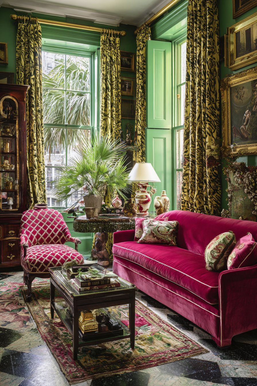Abundant decorative objects and plants create a curated collection aesthetic where every surface tells a story through its arrangement of treasures. The maximalist approach requires a discerning eye—it’s not about random accumulation but rather intentional curation of beautiful things that spark joy and conversation. This sitting room proves that more can absolutely be more when guided by genuine passion and aesthetic confidence.