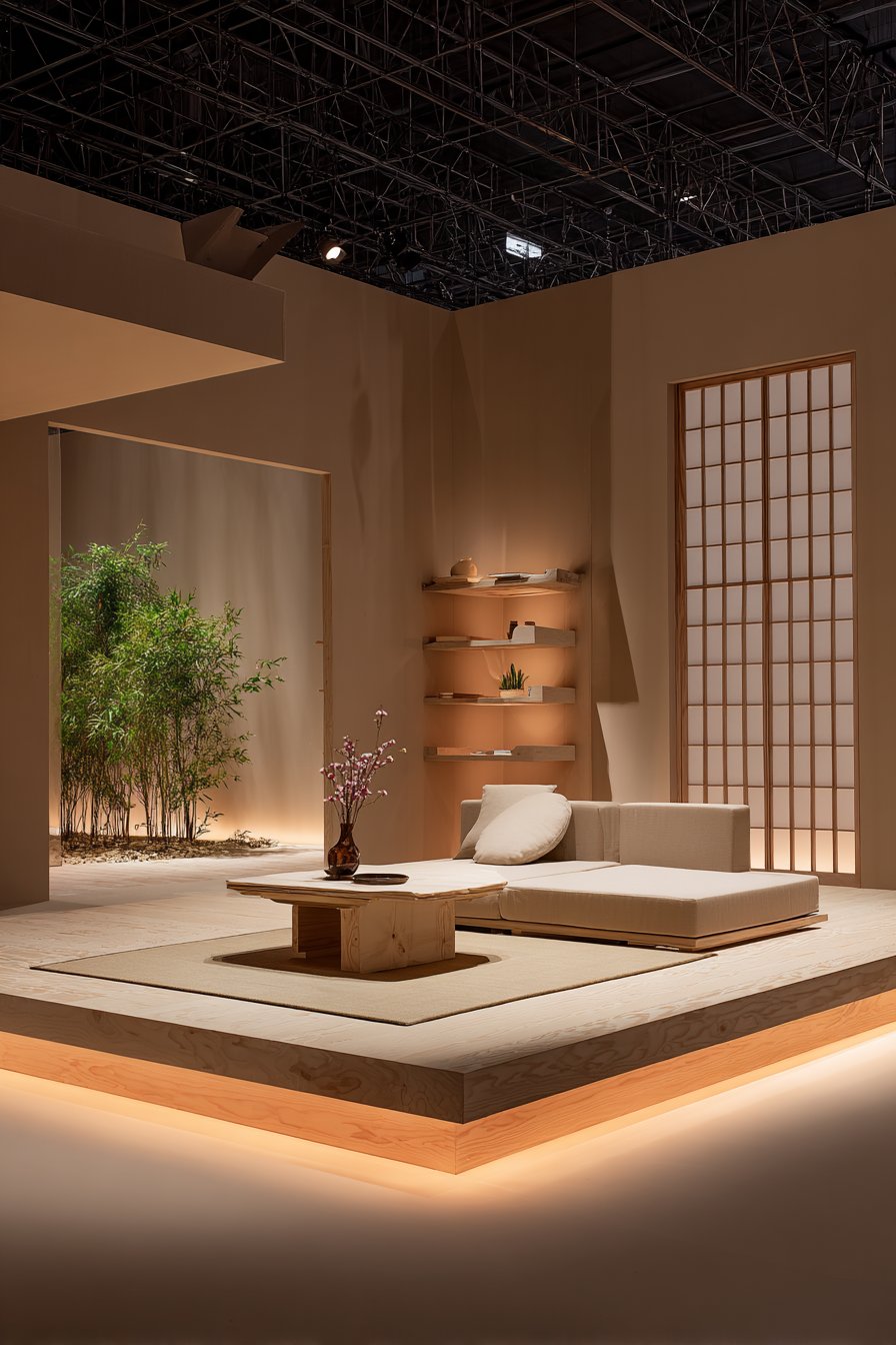 Natural materials dominate the palette—bamboo, handmade paper, and untreated wood create a cohesive material story that celebrates organic beauty. Soft diffused lighting creates a serene atmosphere perfect for meditation, reading, or quiet conversation, avoiding harsh shadows or bright spots. This Japanese-inspired sitting room offers a peaceful retreat from modern life’s chaos.