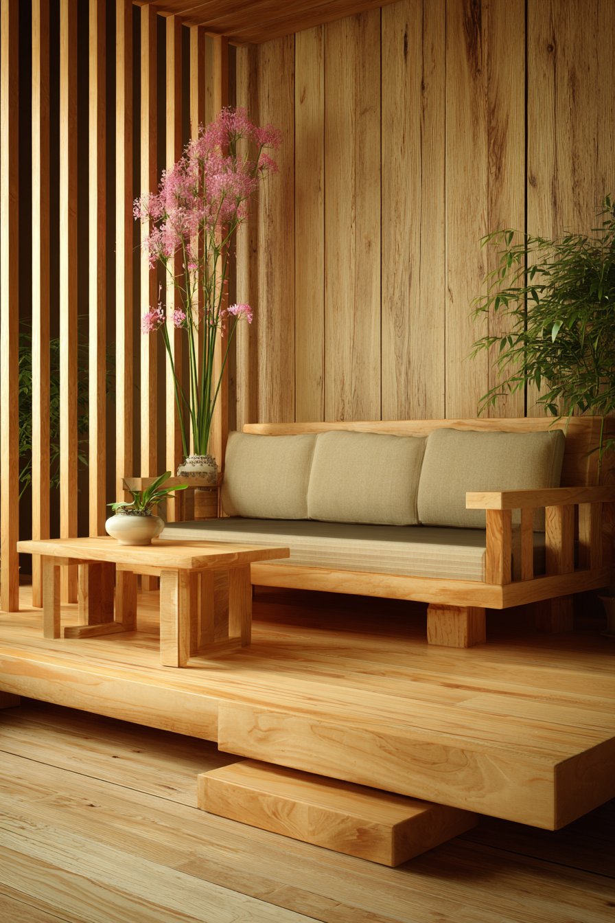 Eastern design philosophy manifests in this serene sitting room where minimalism serves spiritual as well as aesthetic purposes. Low-profile platform furniture including a simple sofa with clean lines maintains close connection to the floor, embodying Japanese design principles that emphasize humility and connection to earth. A minimalist coffee table in light wood showcases beautiful grain without excessive ornamentation, allowing natural material beauty to speak.