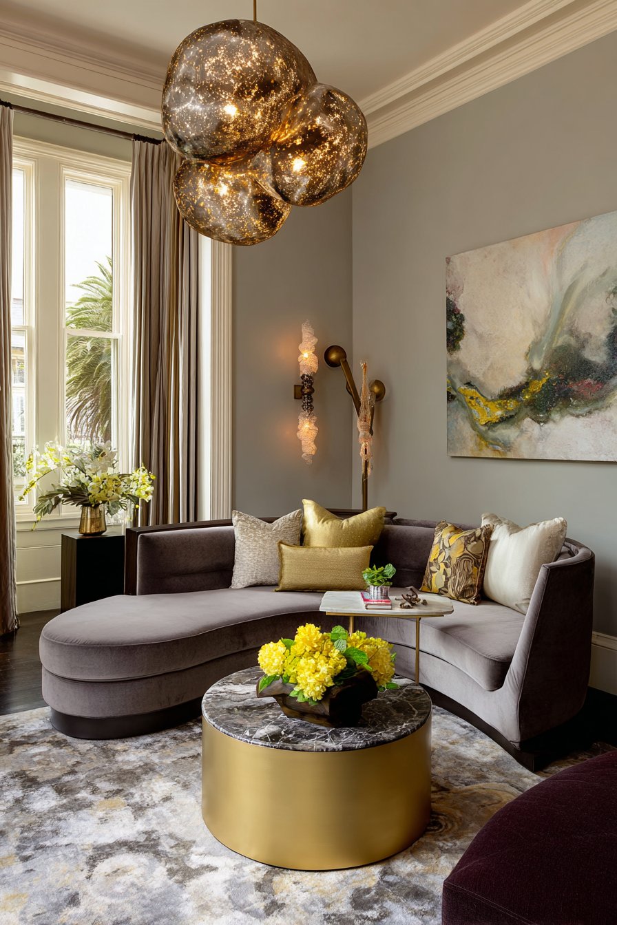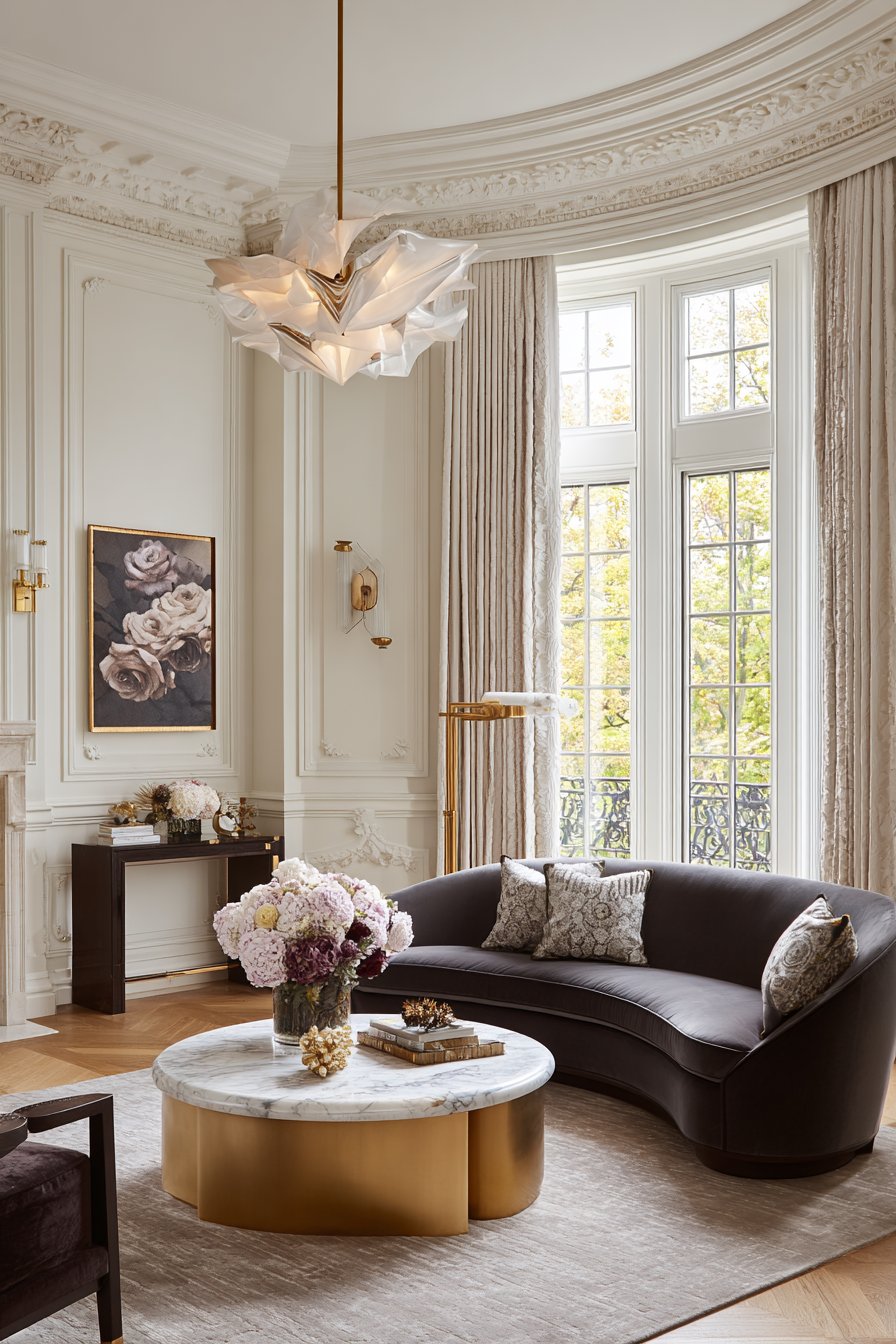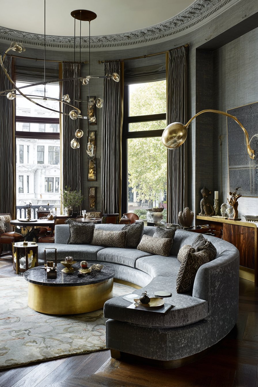 Premium materials and expert craftsmanship define this luxury sitting room where every element represents the pinnacle of quality and design. A curved velvet sofa in sophisticated grey demonstrates how form can be both comfortable and sculptural, its gentle arc creating visual movement and inviting users to relax into its embrace. The brass and marble coffee table combines warm metal with cool stone, creating a piece that’s both functional and gallery-worthy.