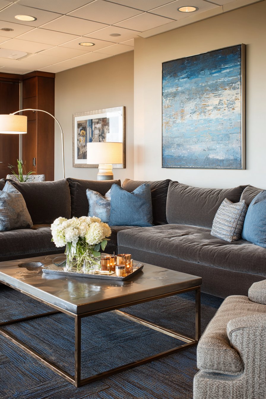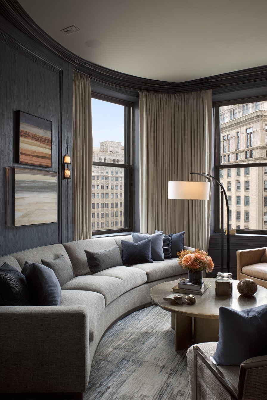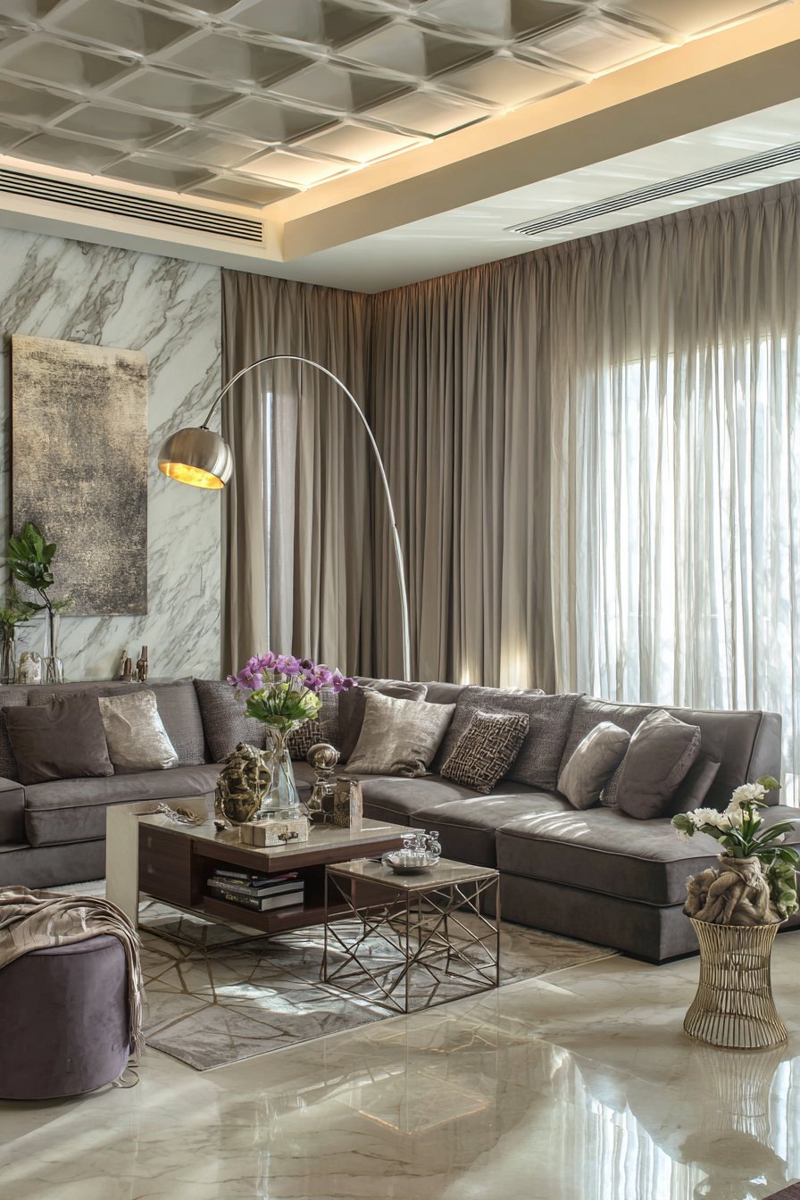 Premium materials and expert craftsmanship define this luxury sitting room where every element represents the pinnacle of quality and design. A curved velvet sofa in sophisticated grey demonstrates how form can be both comfortable and sculptural, its gentle arc creating visual movement and inviting users to relax into its embrace. The brass and marble coffee table combines warm metal with cool stone, creating a piece that’s both functional and gallery-worthy.