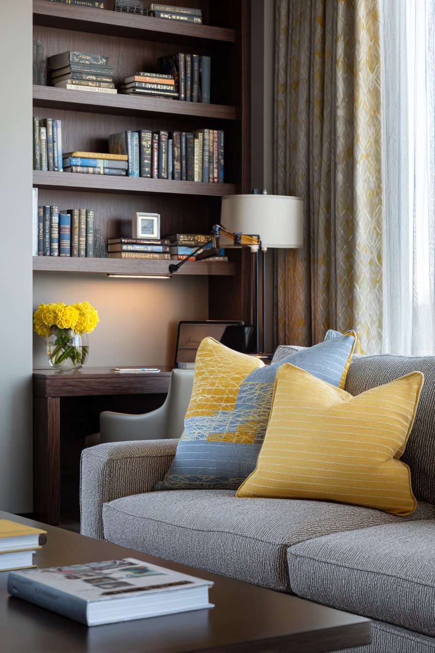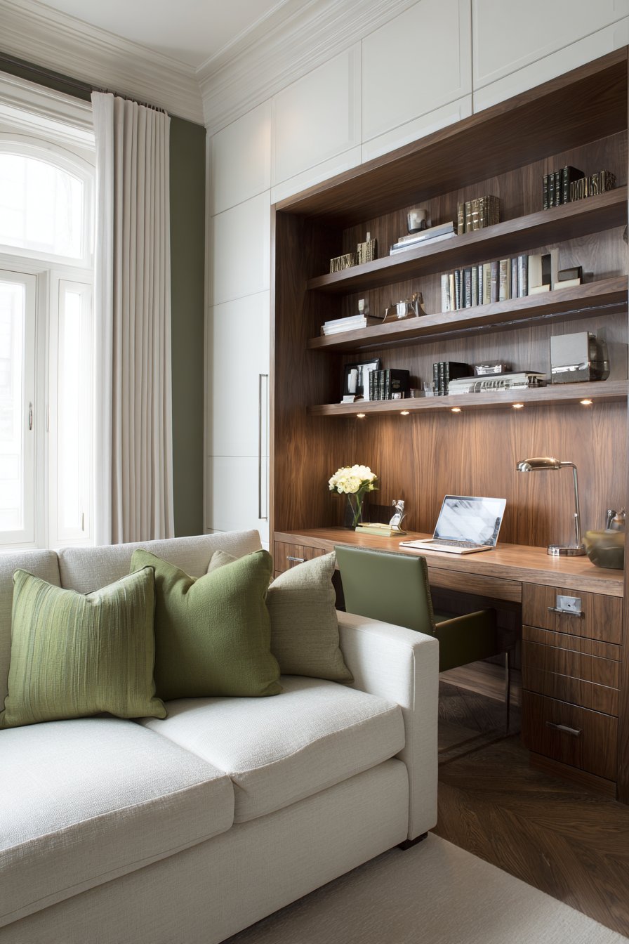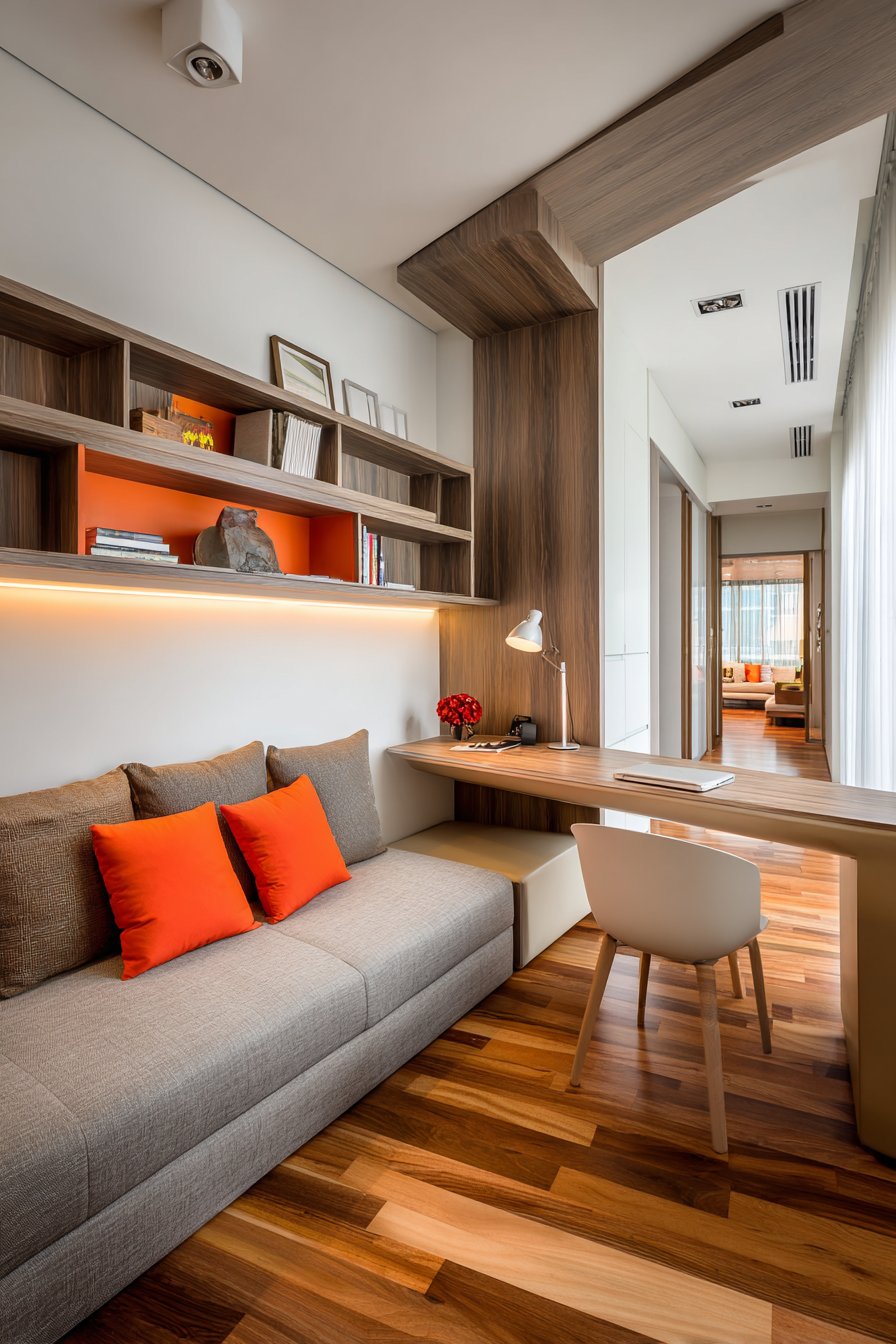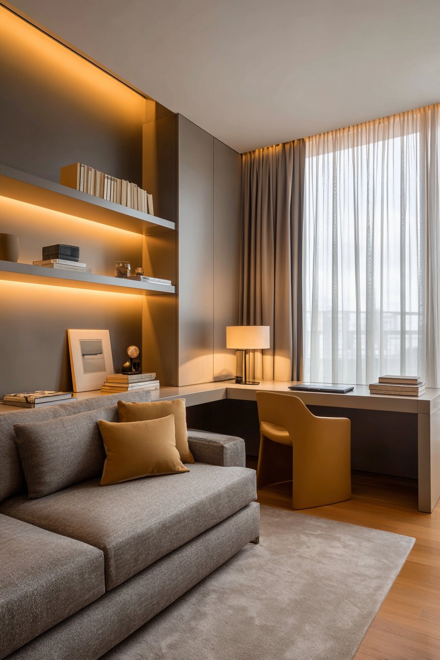 Smart spatial planning allows this sitting room to serve dual purposes without compromise, functioning equally well as relaxation space and productive work area. A comfortable sofa faces a built-in desk area with floating shelves, the two zones visually connected yet functionally distinct. The room divider or strategically placed bookcase partially separates zones without completely blocking light or sight lines, maintaining the room’s overall spaciousness while providing psychological separation between work and leisure.