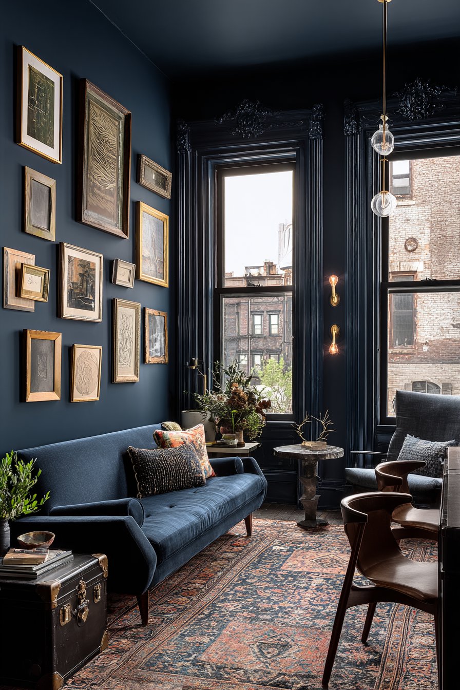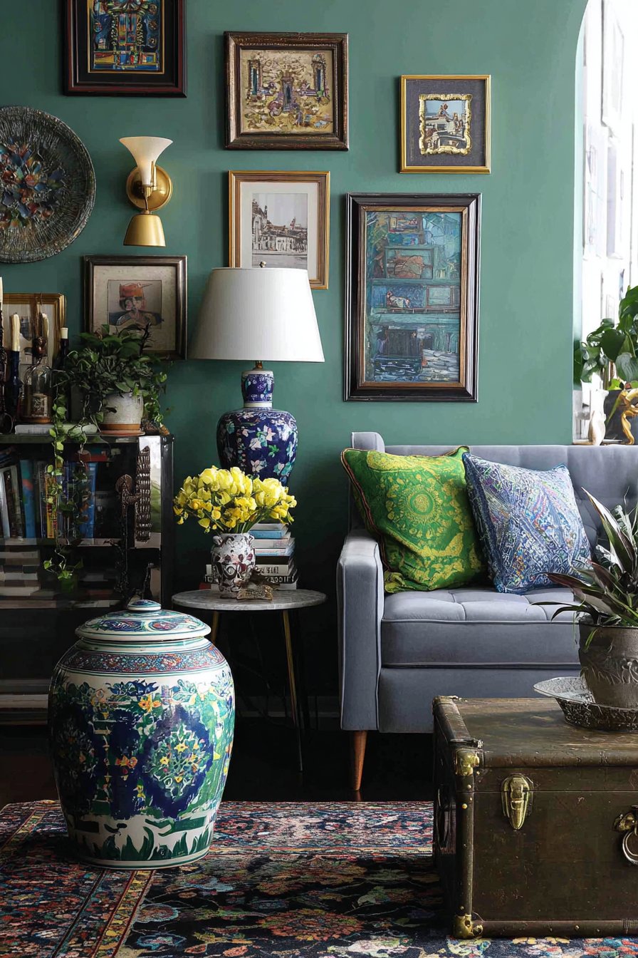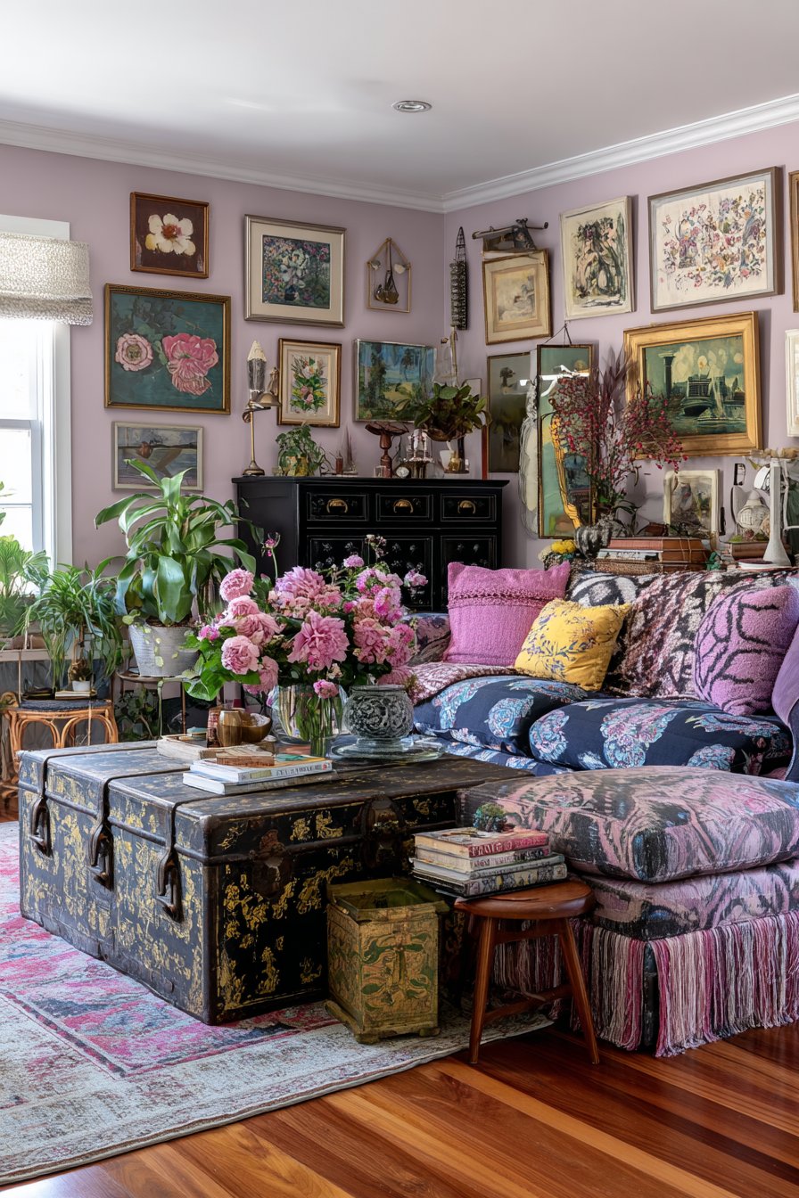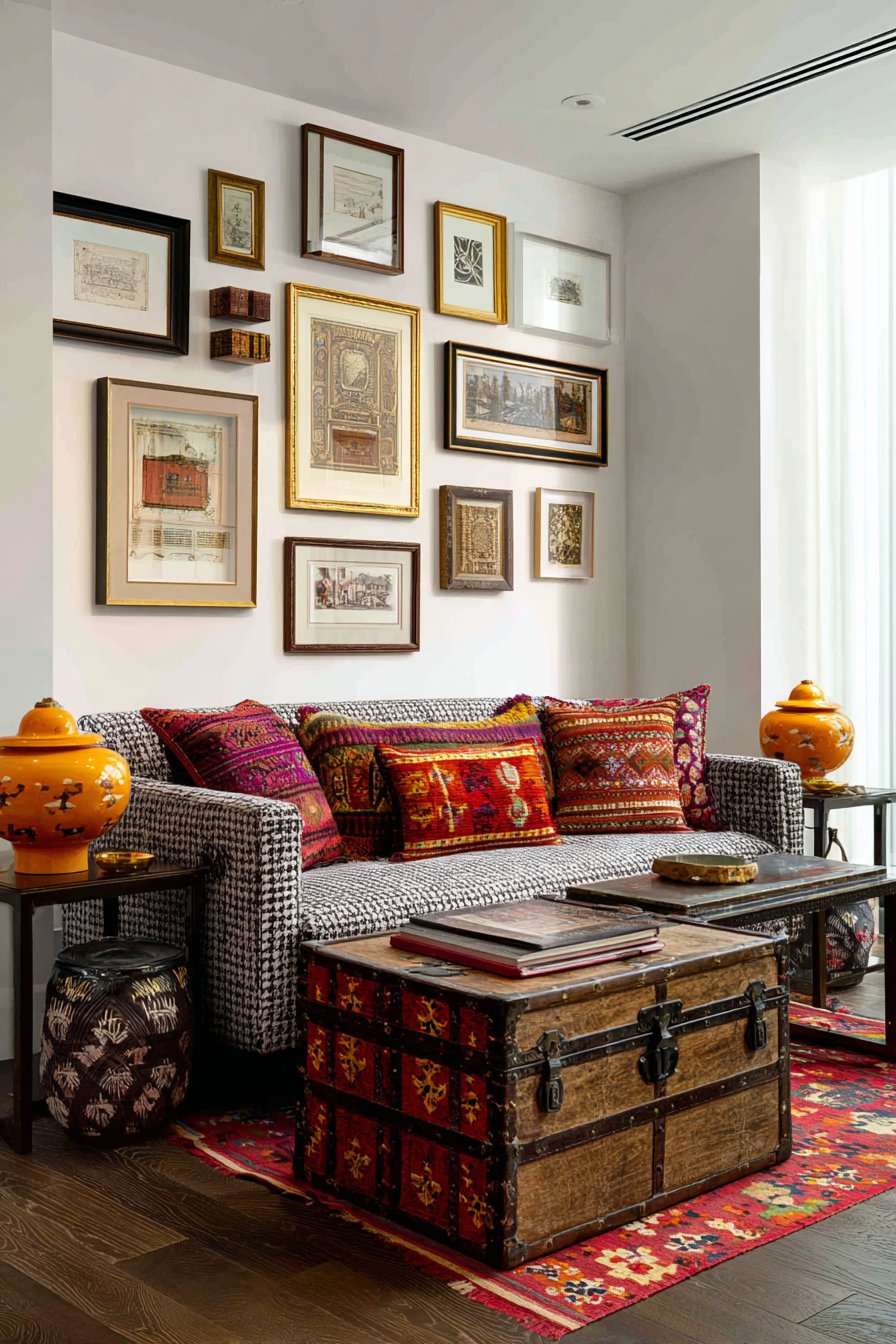 Personal style and accumulated treasures create this eclectic sitting room where diverse elements unite through shared spirit rather than matching aesthetics. A restored mid-century sofa pairs with modern side tables and an antique trunk serving as coffee table, demonstrating that pieces from different eras can coexist when united by quality and character. Collected artwork in mismatched frames creates a gallery wall that tells the story of its owner’s evolving taste and memorable discoveries.