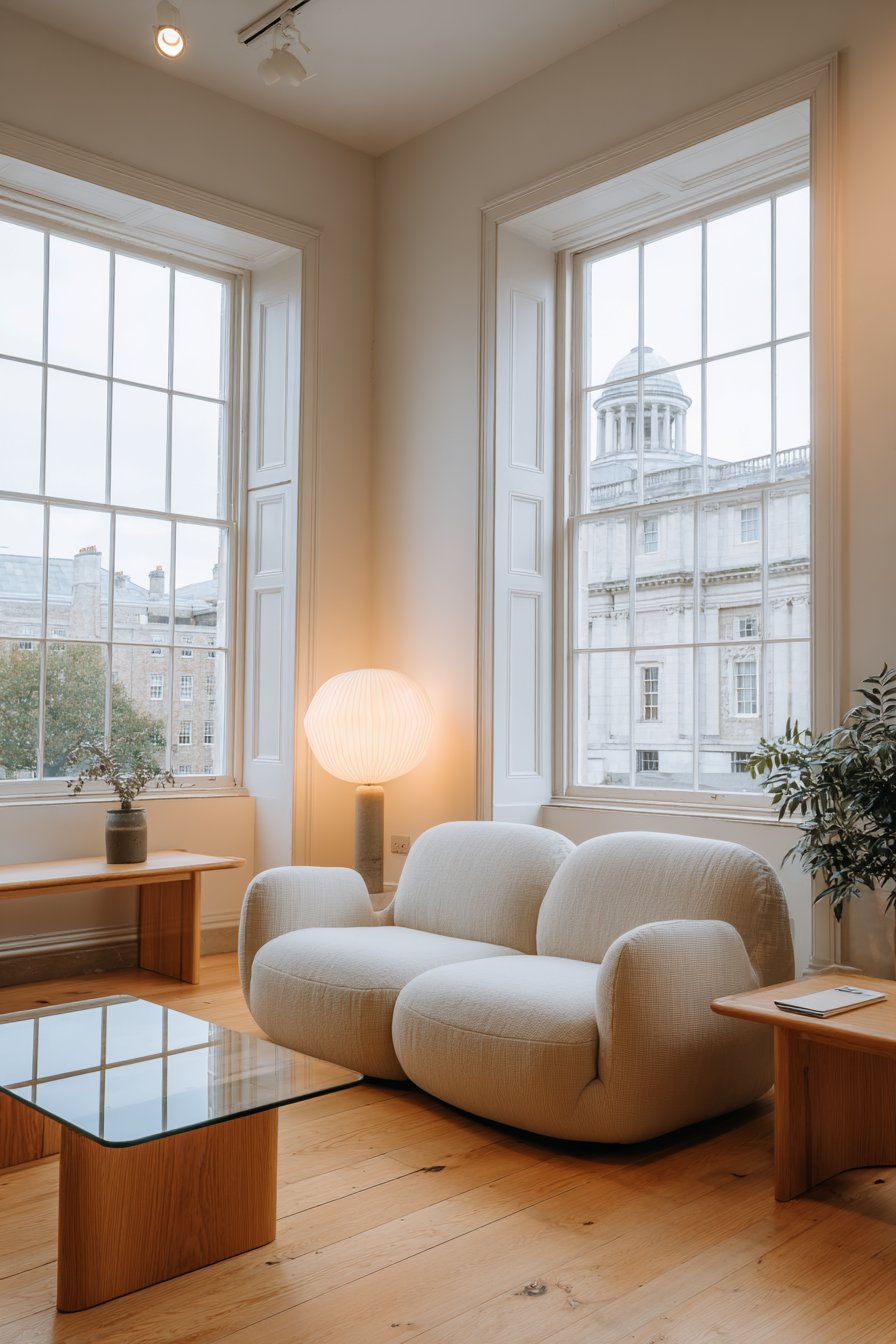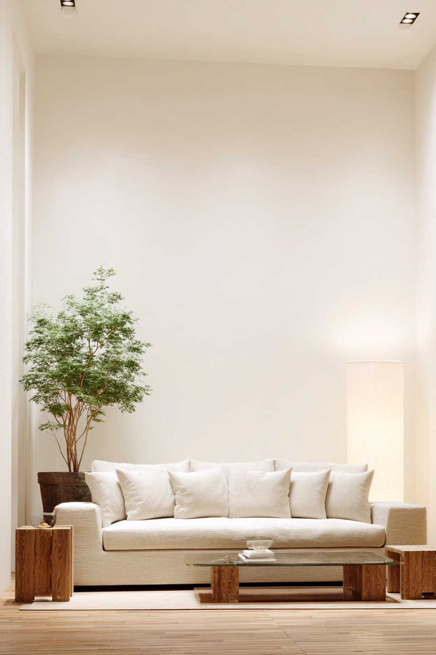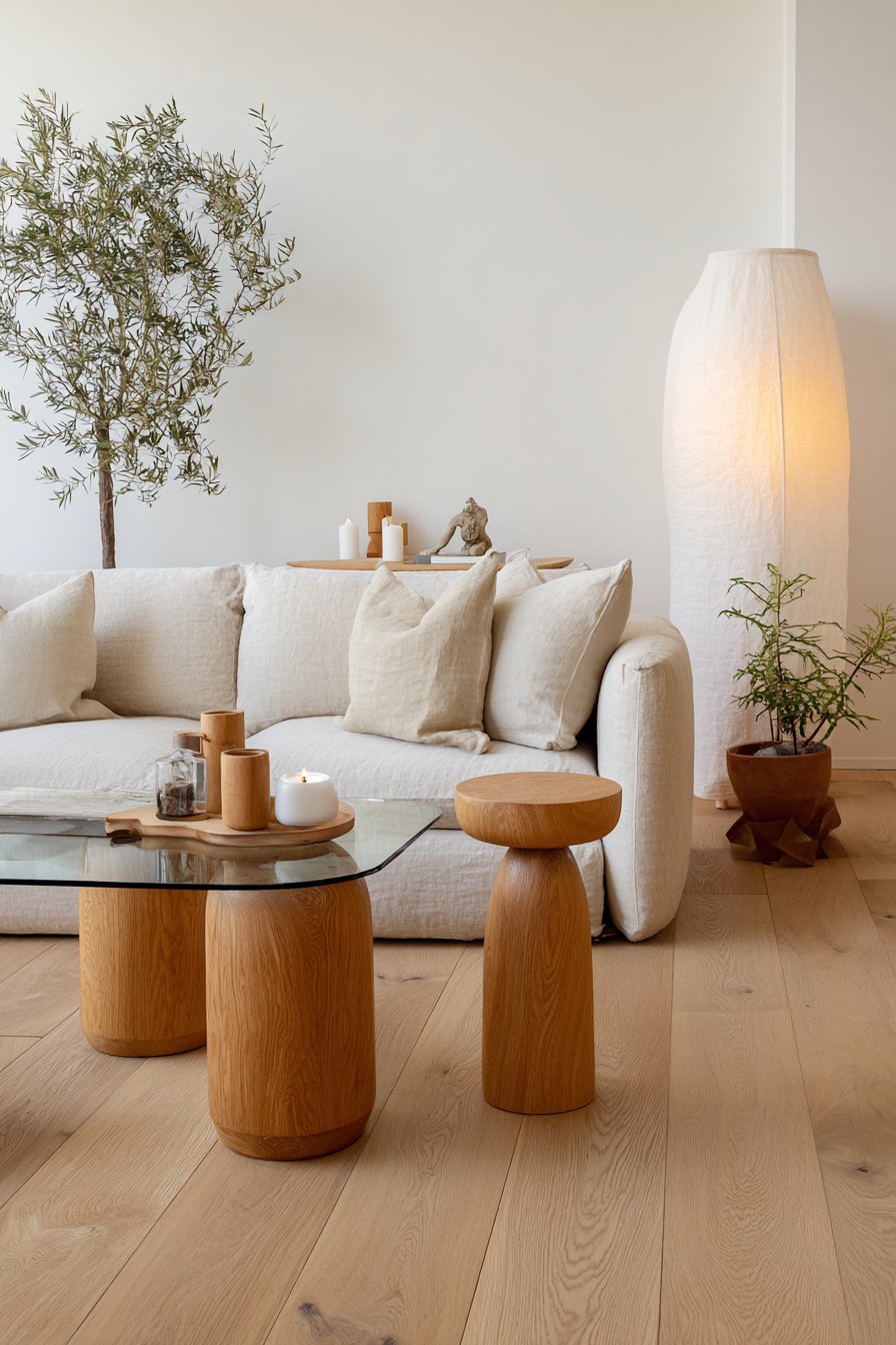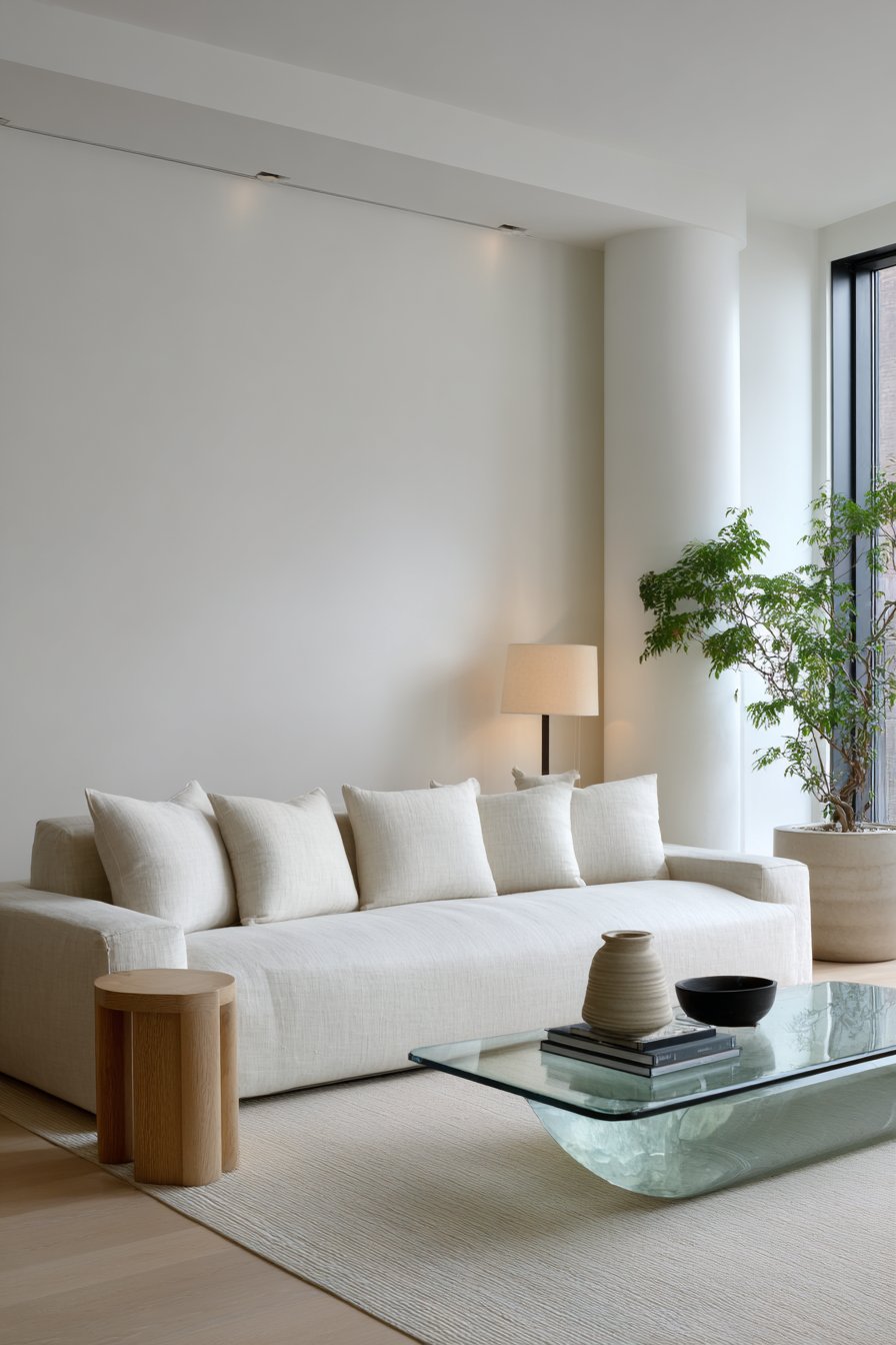 Key Design Tips: Invest in low-profile furniture with clean lines to maintain the minimalist aesthetic and create a sense of spaciousness. Choose neutral linen upholstery for its natural texture, breathability, and timeless appeal that ages beautifully. Select glass coffee tables to maintain visual lightness and allow flooring patterns to remain uninterrupted beneath. Limit decorative accessories to a few high-quality, meaningful pieces rather than multiple smaller items. Incorporate natural oak flooring to add warmth and organic beauty without overwhelming the minimalist palette.
