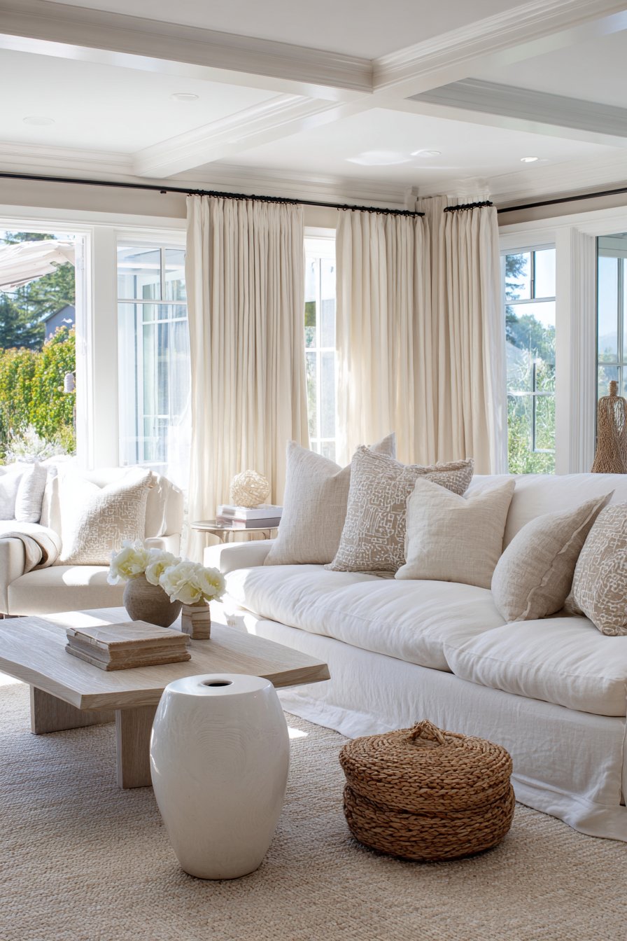 Visual harmony through tonal variation defines this sophisticated sitting room where multiple shades of cream and beige create depth without color contrast. A linen sofa in natural cream provides a neutral anchor, its textured fabric adding visual interest through weave variation rather than color. Natural fiber area rugs in sisal or jute add organic texture underfoot while maintaining the tonal palette. A blonde wood coffee table introduces warmth through honey tones that complement rather than contrast with the surrounding neutrals.
