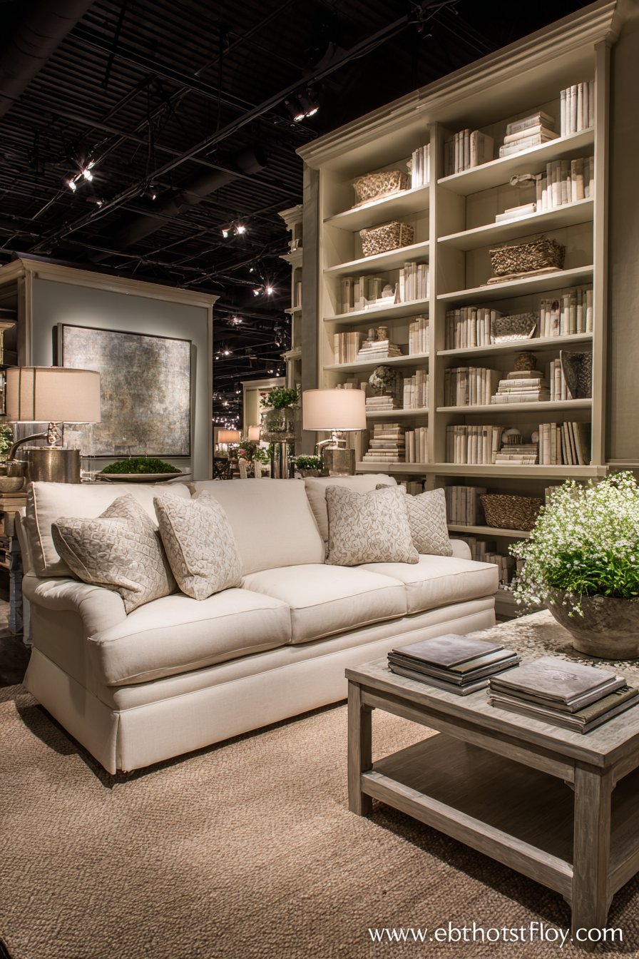 Behind the sofa, a sofa table provides display surface for lamps and decorative objects while offering storage through drawers or shelves below. Floating shelves utilize vertical wall space for books and decorative items without consuming floor space, their streamlined brackets nearly invisible. Closed cabinets keep visual clutter concealed—perhaps media equipment, office supplies, or children’s toys—while open shelving displays curated decorative items that enhance rather than clutter the aesthetic.