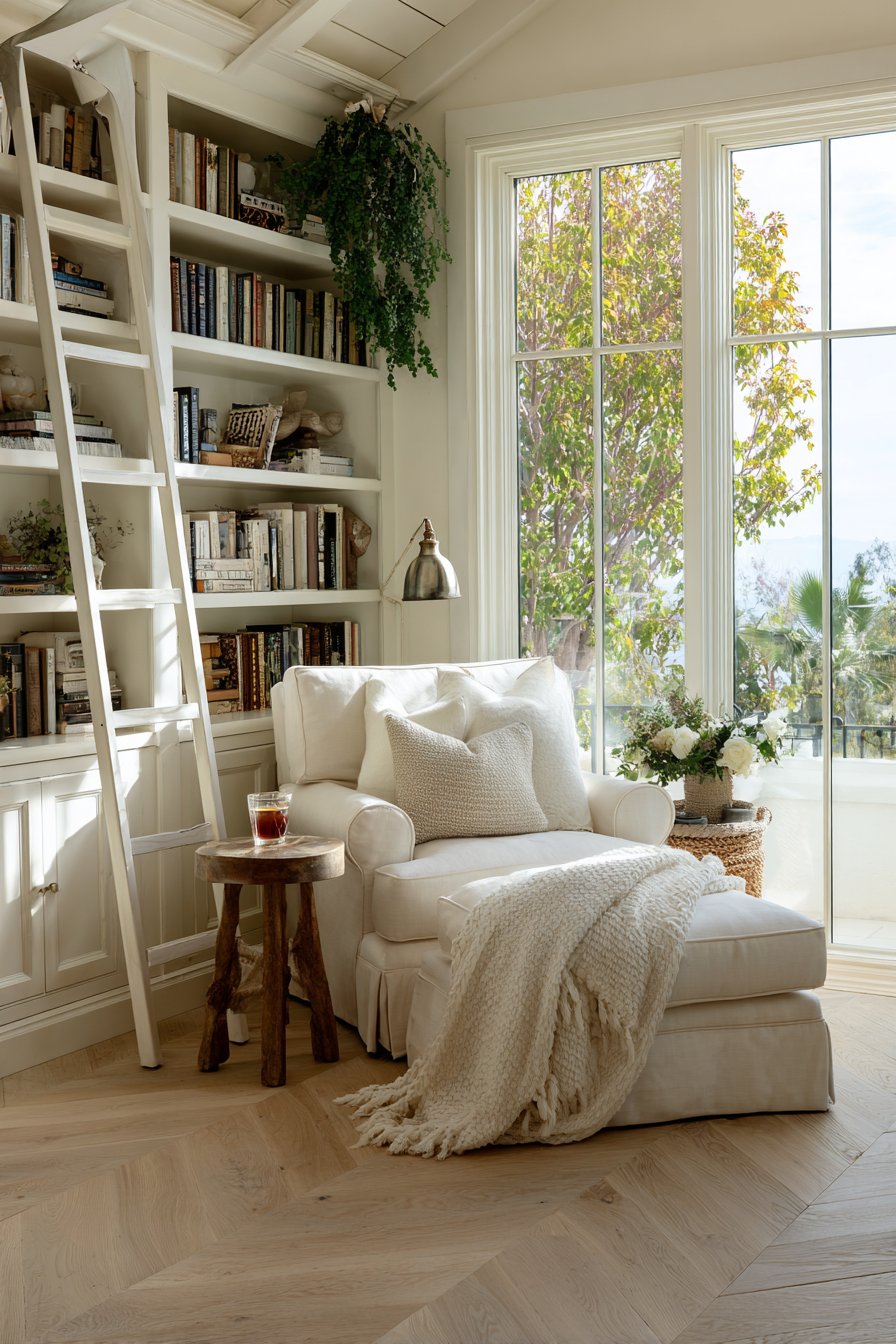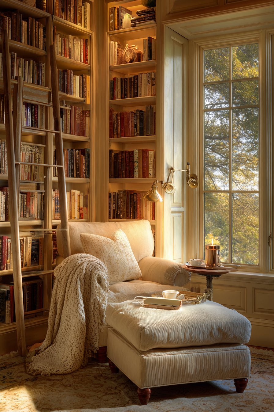 Book lovers will appreciate this sitting room designed around the pleasure of reading and surrounded by beloved volumes. Floor-to-ceiling built-in bookshelves with library ladder create both practical storage for extensive book collections and dramatic architectural impact. A comfortable reading chair with supportive back and arms positions near a window to maximize natural light during daylight reading hours. An ottoman provides leg support for extended reading sessions, promoting comfort and proper posture.