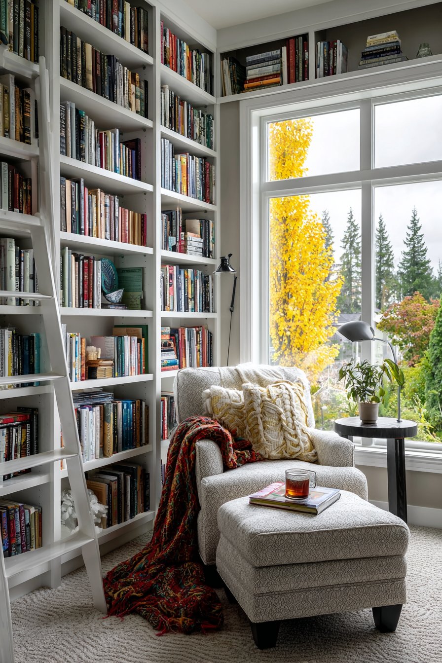 Key Design Tips: Install floor-to-ceiling built-in bookshelves with library ladders to maximize book storage and create dramatic architectural features. Position comfortable reading chairs near windows to take advantage of natural daylight for reading. Add supportive ottomans for leg elevation during extended reading sessions. Install adjustable reading lamps that provide focused task lighting without glare or eye strain. Include side tables within arm’s reach to hold reading essentials and beverages.