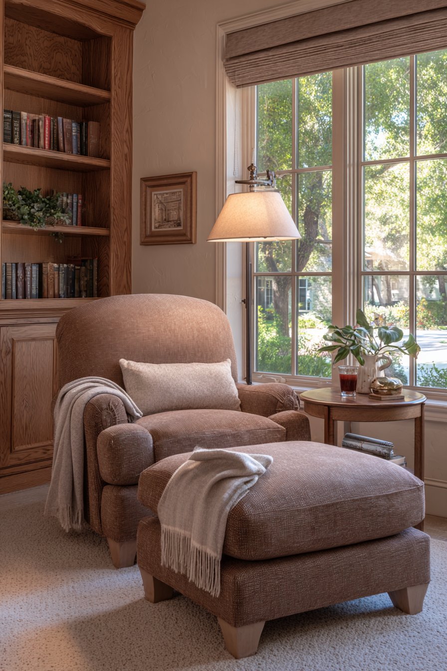 Adjustable reading lamp positioned beside the chair provides focused task lighting that can be directed precisely where needed without causing glare or eye strain. A side table within easy reach holds reading glasses, bookmarks, current reading selections, and a beverage—everything the dedicated reader needs within arm’s length. A cozy throw blanket draped over the chair arm invites curling up for hours of reading pleasure.