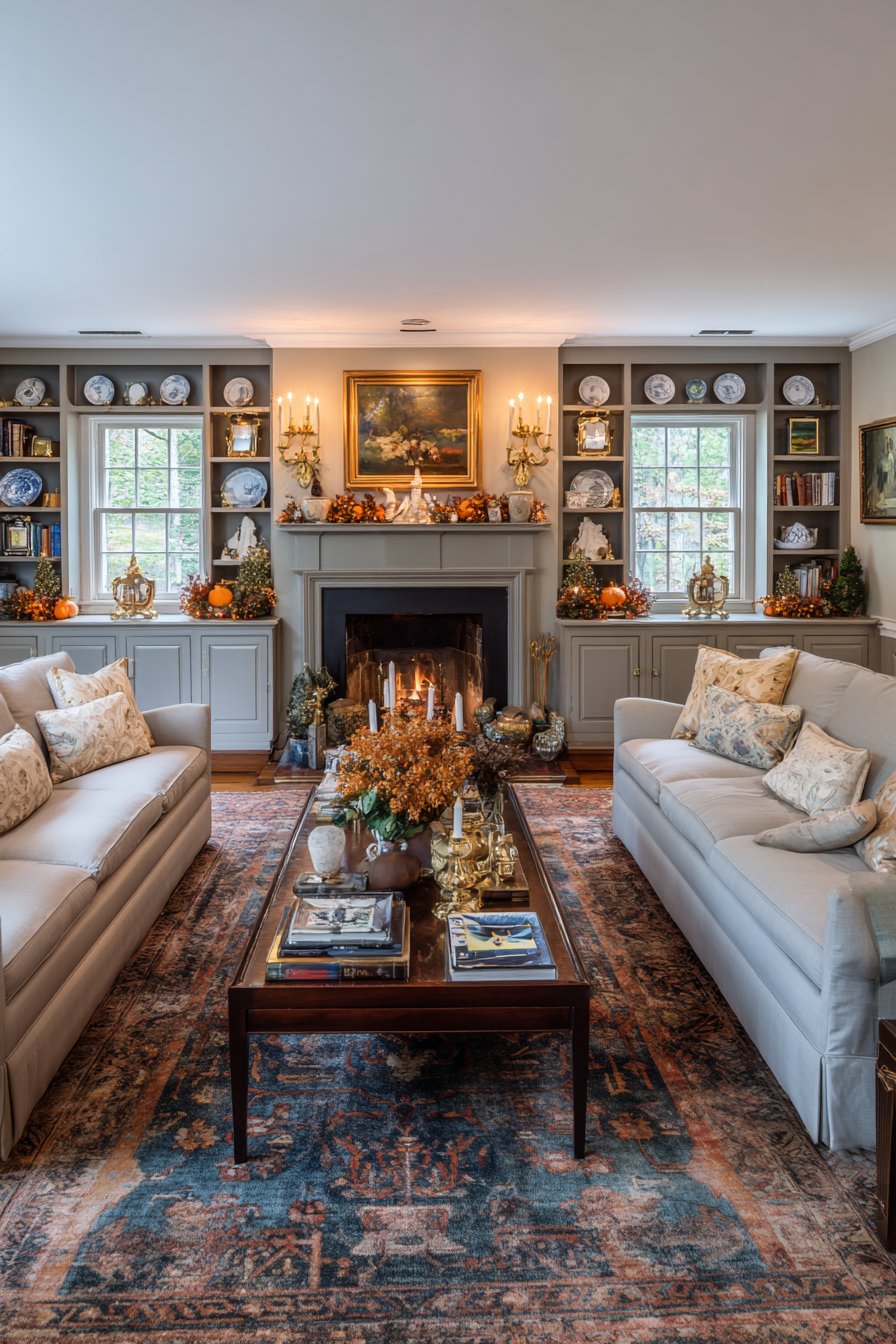 An ornate wooden coffee table serves as both functional centerpiece and decorative element, its carved details and dark finish adding gravitas to the arrangement. The Oriental rug beneath anchors the furniture grouping with intricate patterns that reference centuries of design tradition, its complex motifs adding layers of visual richness. Built-in bookshelves flanking a decorative fireplace create symmetry and provide homes for treasured volumes and display objects, while the fireplace itself serves as the room’s natural focal point.
