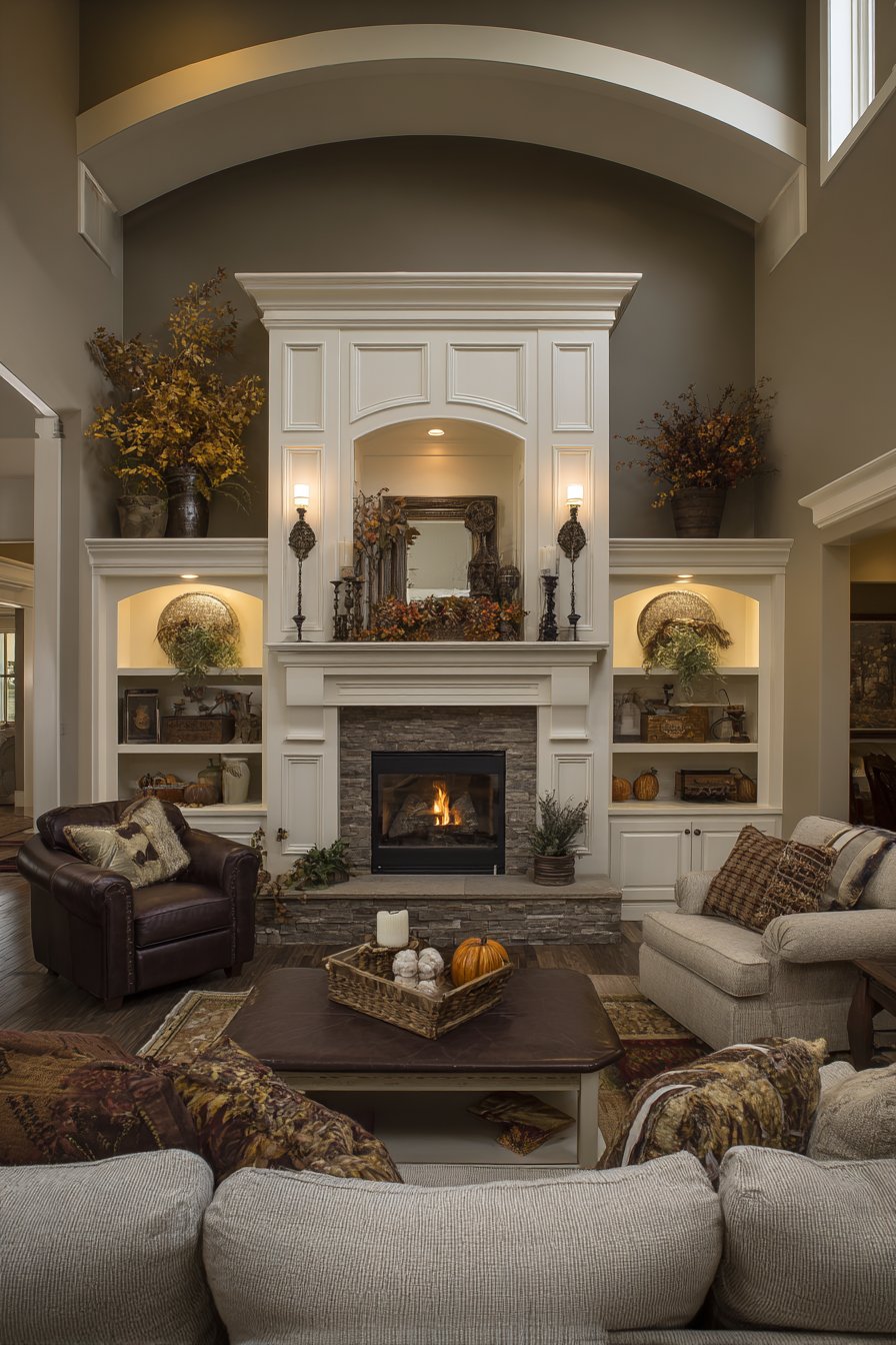 Built-in cabinetry flanking the fireplace provides practical storage while creating architectural symmetry that frames the focal point. These flanking elements might house media equipment, display treasured objects, or provide closed storage for less decorative necessities. Ambient lighting from wall sconces complements the fireplace’s natural glow, providing adequate illumination when the fire isn’t burning while creating layered lighting when it is.