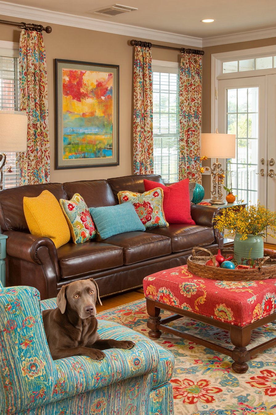 Creating beautiful spaces that accommodate furry family members requires strategic material choices and thoughtful planning, as demonstrated in this pet-friendly sitting room. Leather sofas resist pet hair and clean easily, making them practical choices for homes with dogs or cats. Scratch-resistant area rugs in patterned designs help hide inevitable wear and pet hair, maintaining their appearance despite daily use. Washable slipcovers on accent chairs allow for easy cleaning when muddy paws or shedding season take their toll.