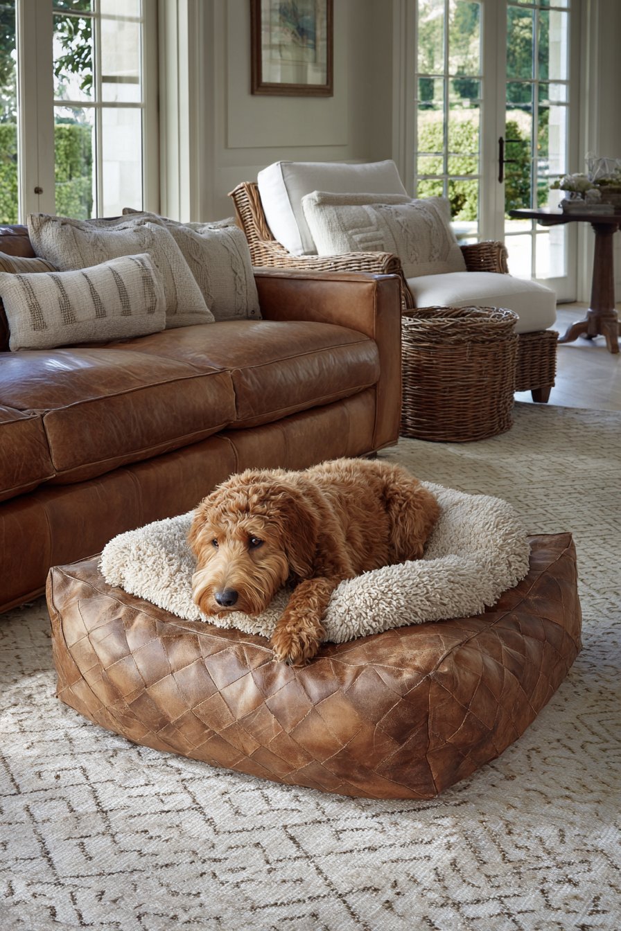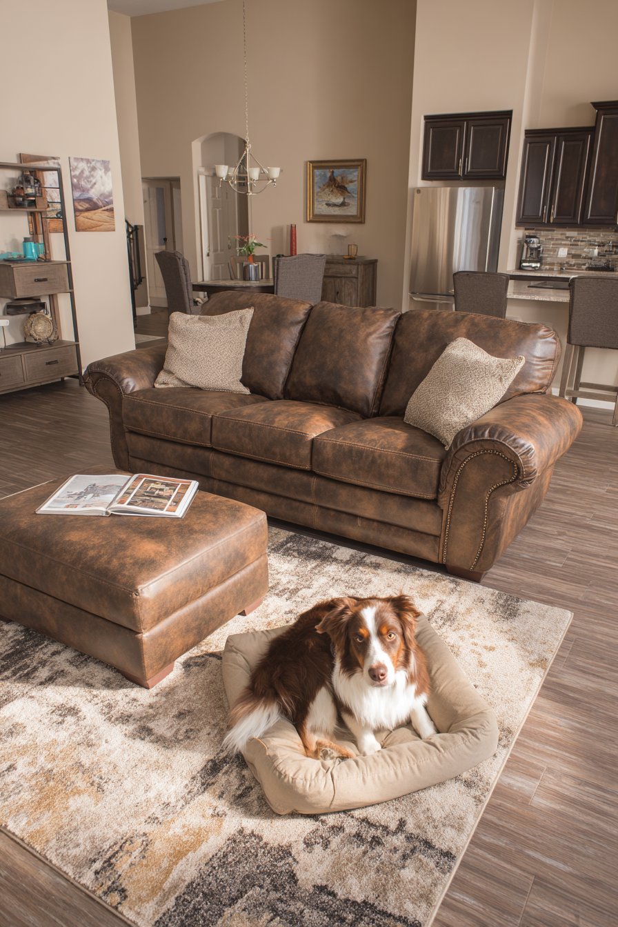 Key Design Tips: Choose leather sofas for their pet hair resistance and easy cleaning in homes with dogs or cats. Select patterned area rugs that help hide pet hair and wear while remaining attractive and durable. Use washable slipcovers on accent chairs to simplify cleaning after muddy paws or shedding seasons. Provide dedicated pet beds near furniture so animals can rest near humans without claiming people furniture. Incorporate storage ottomans to conceal pet toys and keep them accessible but out of sight.