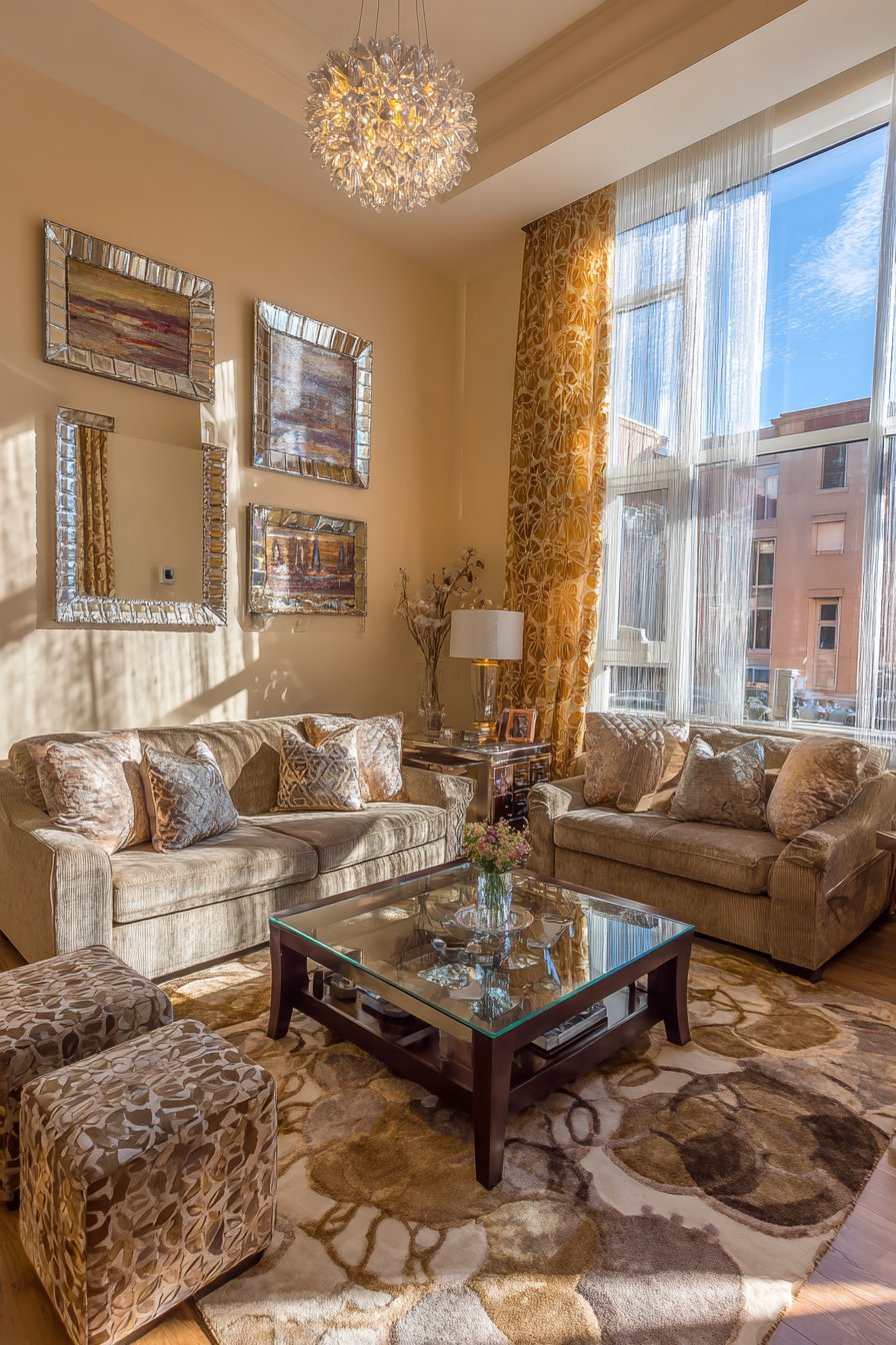 Light-colored walls and ceilings maximize light reflection, bouncing available sunlight deep into the room and amplifying its impact. Reflective surfaces including mirrors, glass coffee tables, and polished metal accessories catch and redirect light, creating sparkle and preventing dark corners. Strategic mirror placement specifically targets bouncing light from windows into darker areas, effectively multiplying the impact of each natural light source.