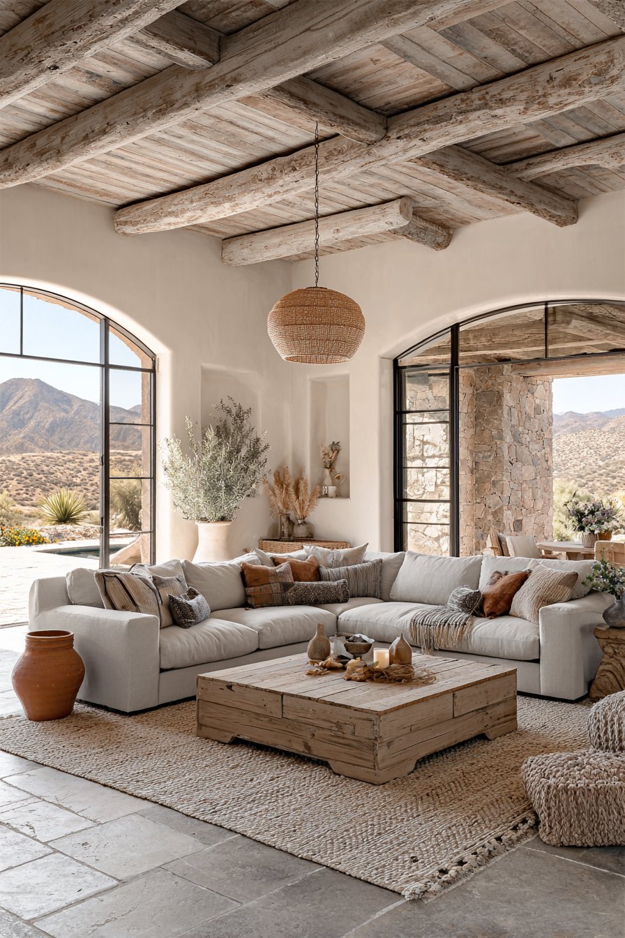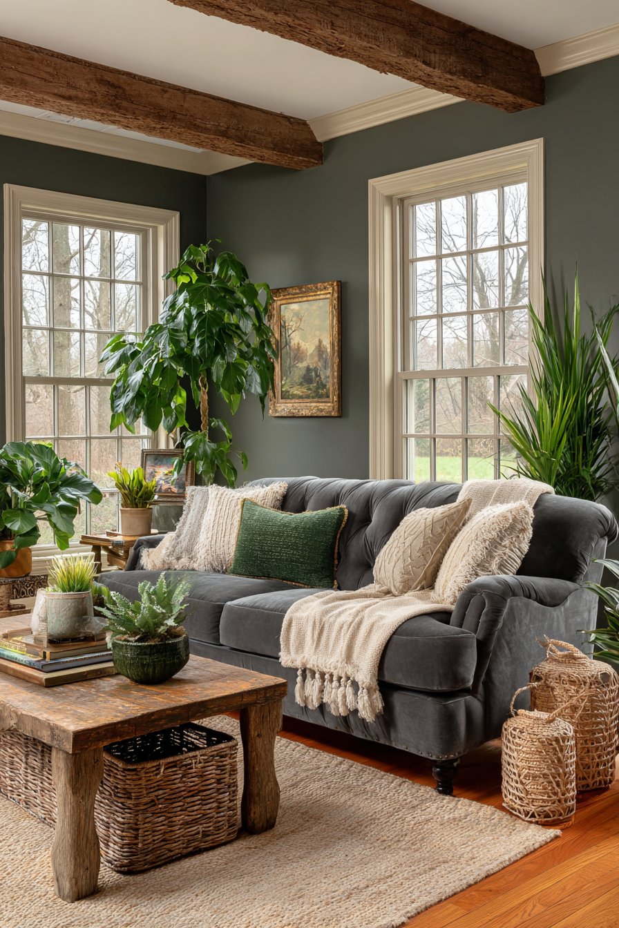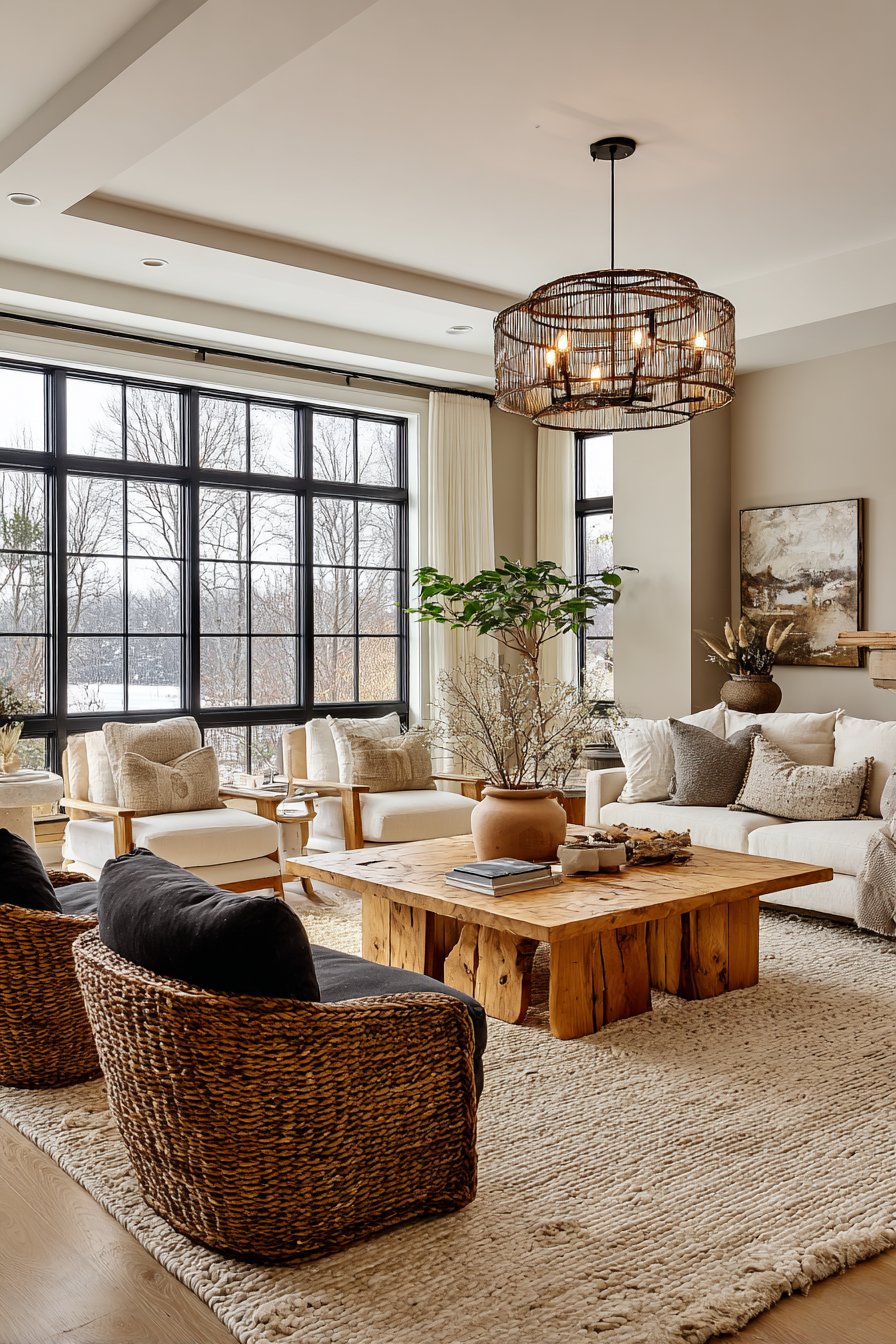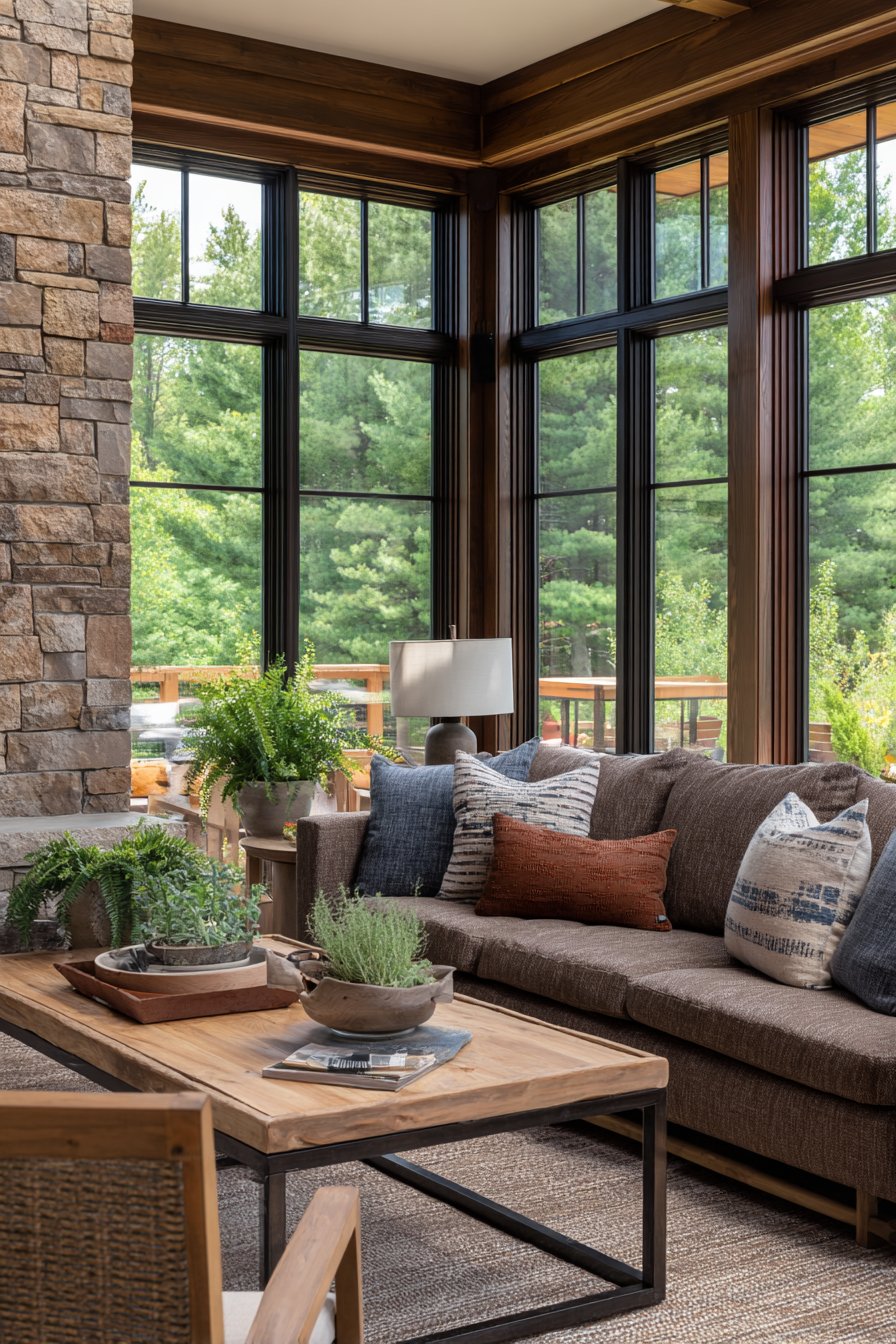 The nature-inspired color palette draws from earth tones—sage greens, warm browns, terracotta oranges, stone greys—creating schemes that feel instinctively harmonious because they mirror natural combinations found in landscapes. Large windows maximize connection to outdoor views, framing garden or landscape scenes as living artwork that changes with seasons and weather. Natural fiber textiles in linen, cotton, and jute add organic tactile experiences.