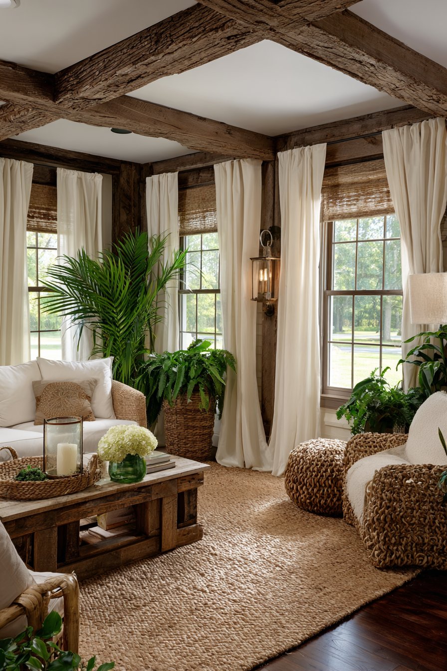 Natural light streaming through multiple windows highlights the comfortable, lived-in aesthetic that makes farmhouse style so appealing. The abundance of windows, often a feature of traditional farmhouses built before electric lighting, creates bright, cheerful spaces that change character throughout the day. This sitting room proves that rustic doesn’t mean rough—rather, it celebrates honest materials and comfortable, approachable design.