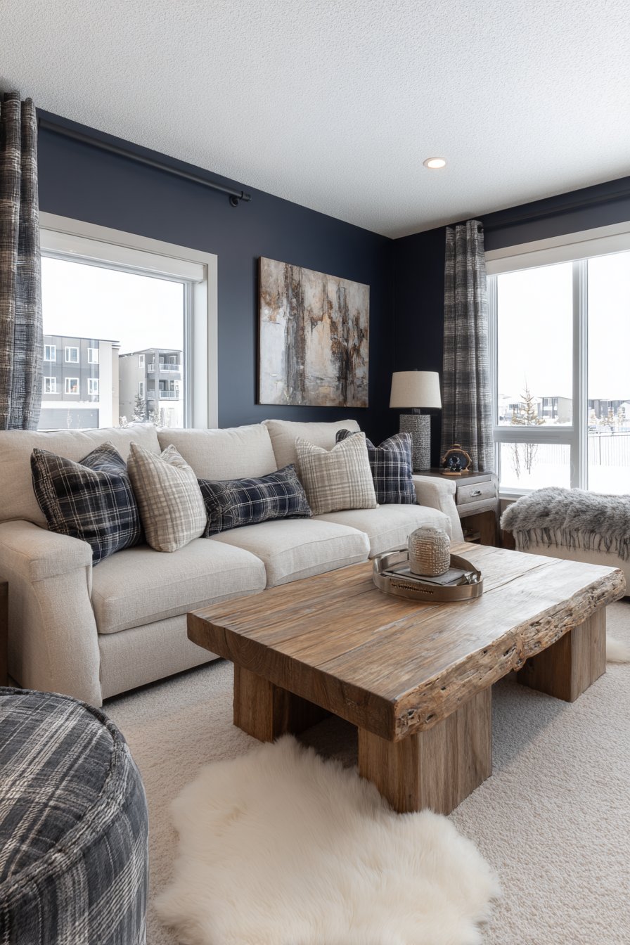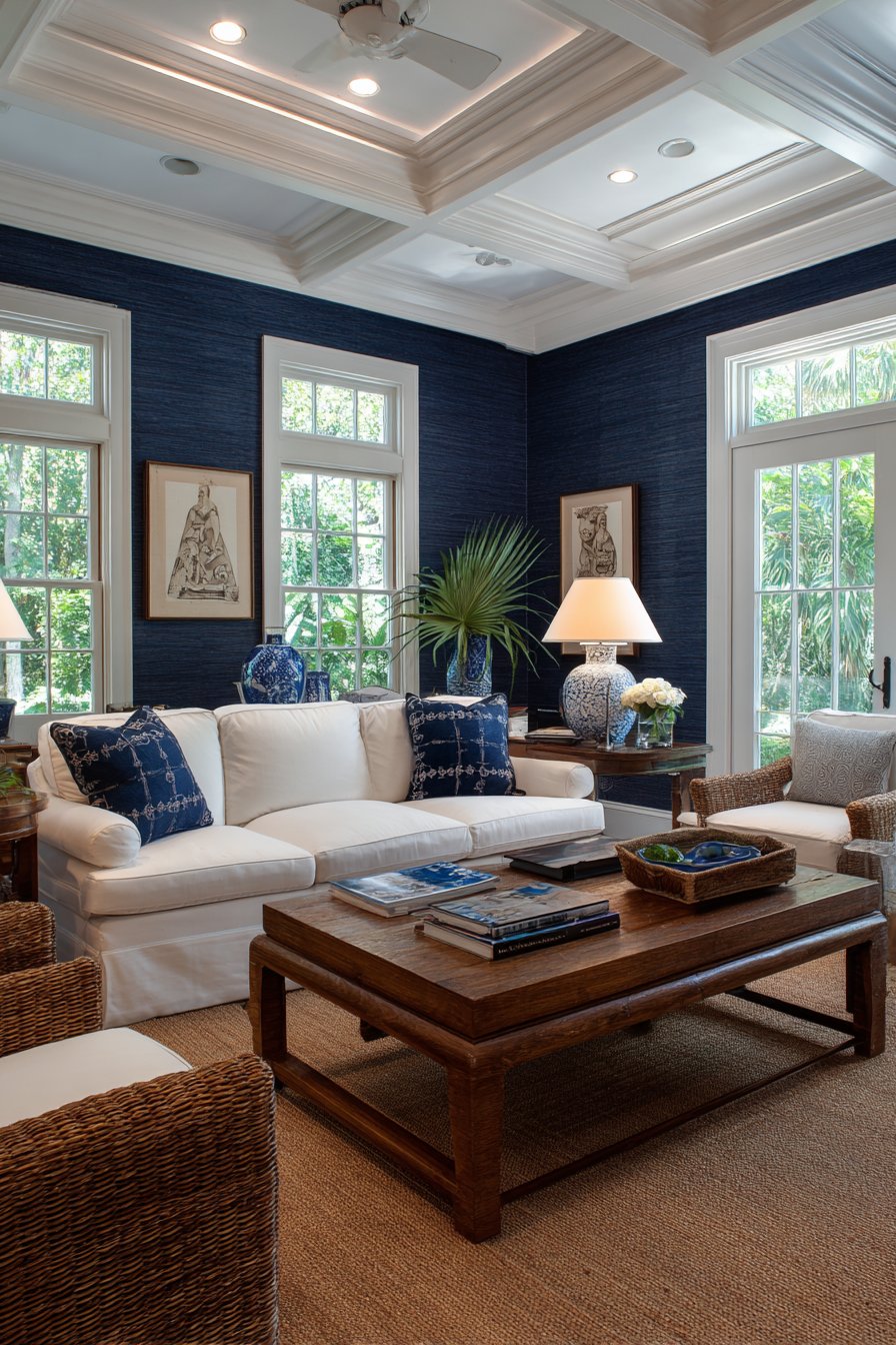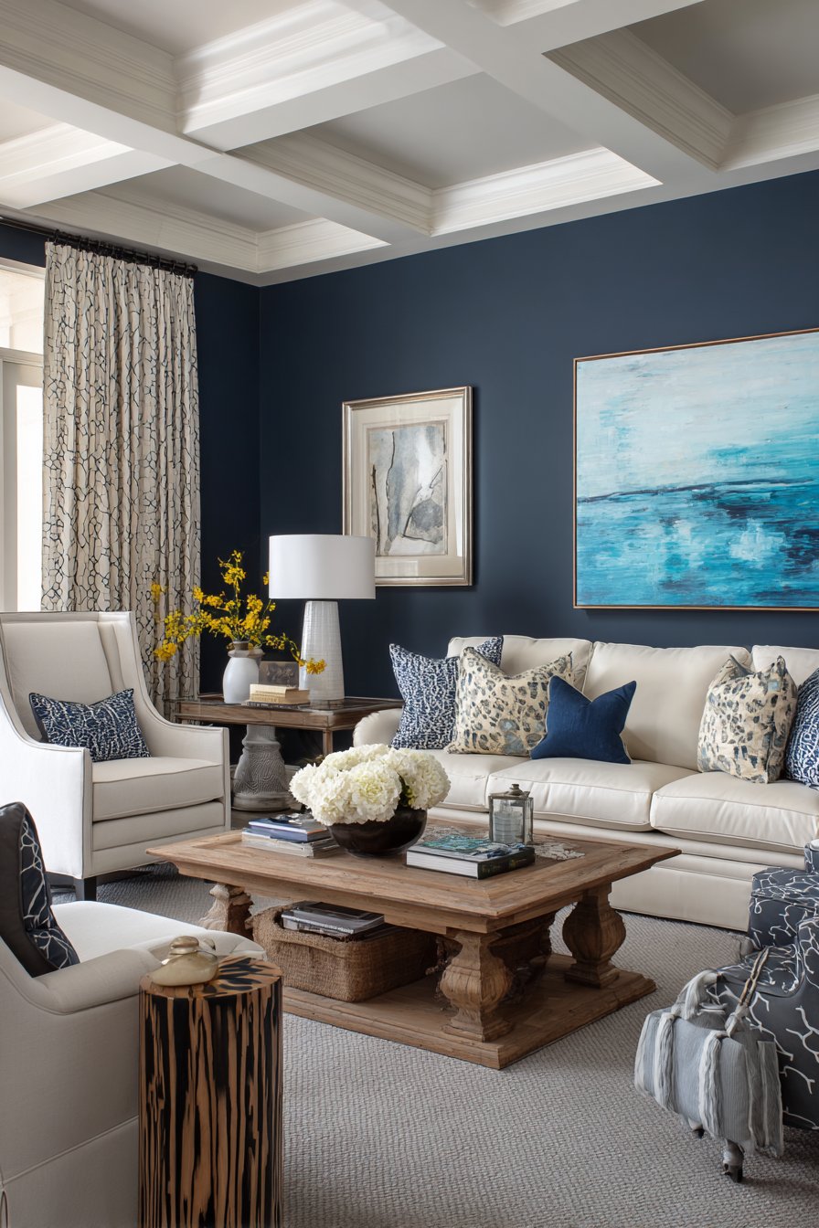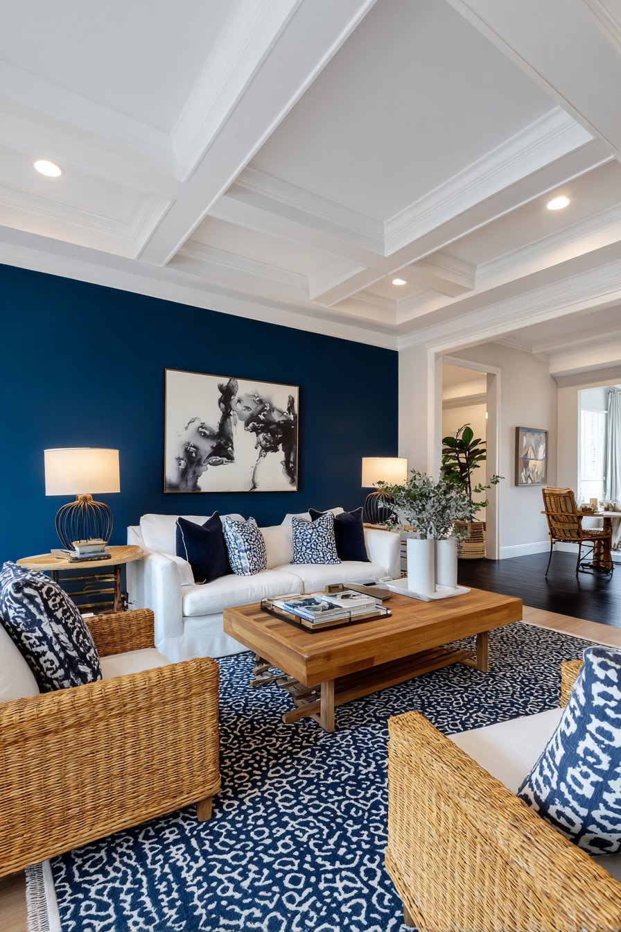 Natural wood coffee table and side tables add warmth that prevents the navy and white palette from feeling too stark or cold. The wood tones provide visual bridge between the dramatic wall and neutral furnishings, creating balanced composition. Layered lighting including table lamps and recessed ceiling lights ensures the dark wall doesn’t create shadowy space but rather serves as sophisticated backdrop for well-illuminated room.