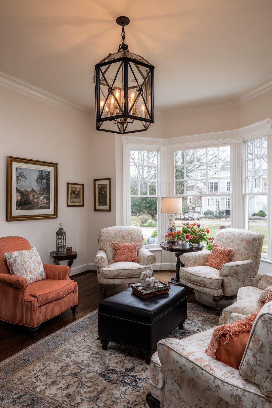 Warm ambient lighting from carefully positioned table lamps and wall sconces creates an inviting glow that enhances the room’s cozy sophistication. The layered lighting approach allows for adjustment based on time of day and activity, from bright illumination for reading to soft atmospheric glow for evening relaxation. This traditional sitting room proves that classic design elements can create spaces that feel both formal and welcoming.