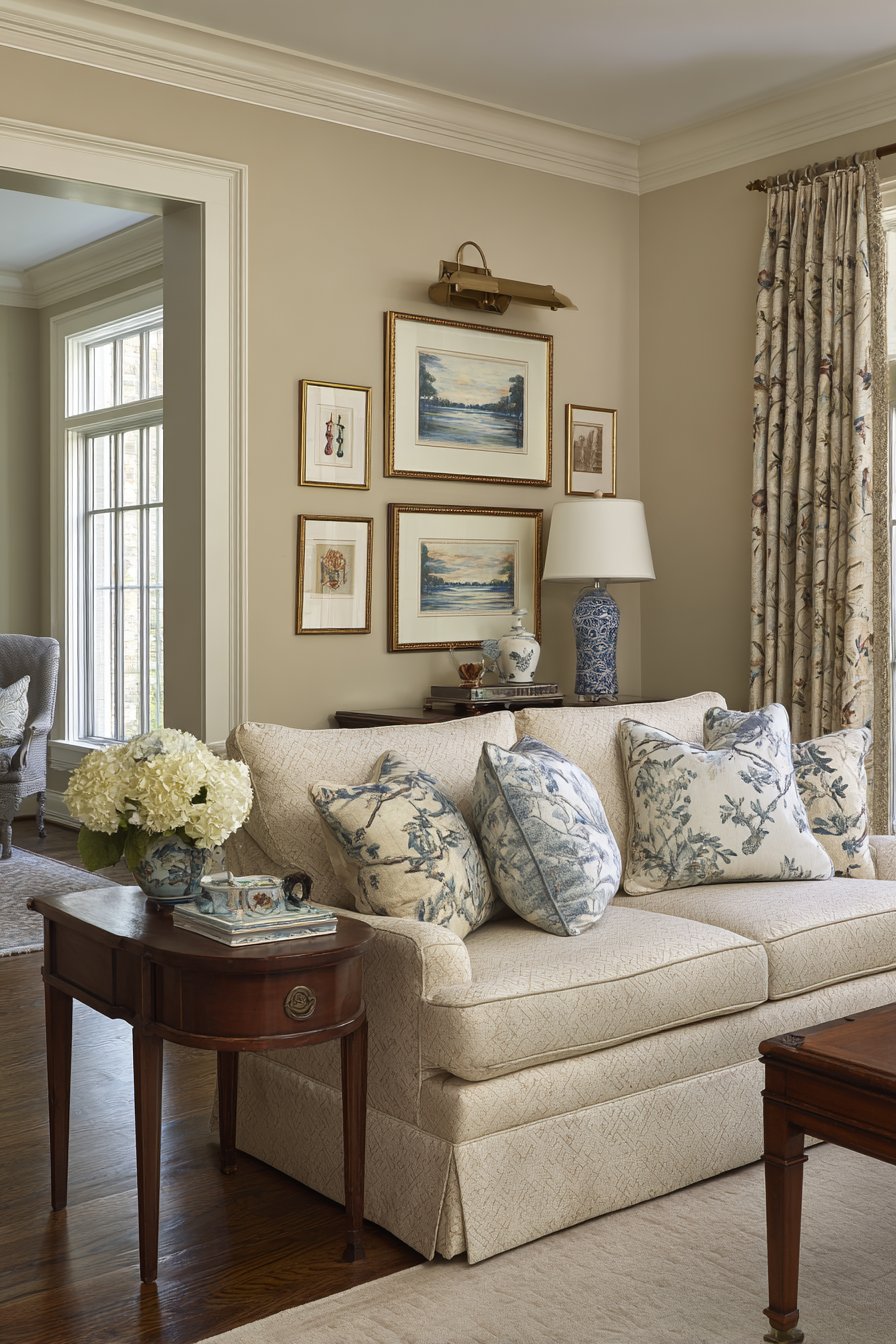 Personal collections take center stage in this sitting room where an impressive gallery wall above the sofa becomes the room’s defining feature. The carefully composed arrangement displays diverse artwork, family photographs, and three-dimensional decorative objects in cohesive presentation that tells visual story. Frames in complementary finishes—perhaps all warm metals or all wood in similar tones—create unified appearance despite varied artwork within.