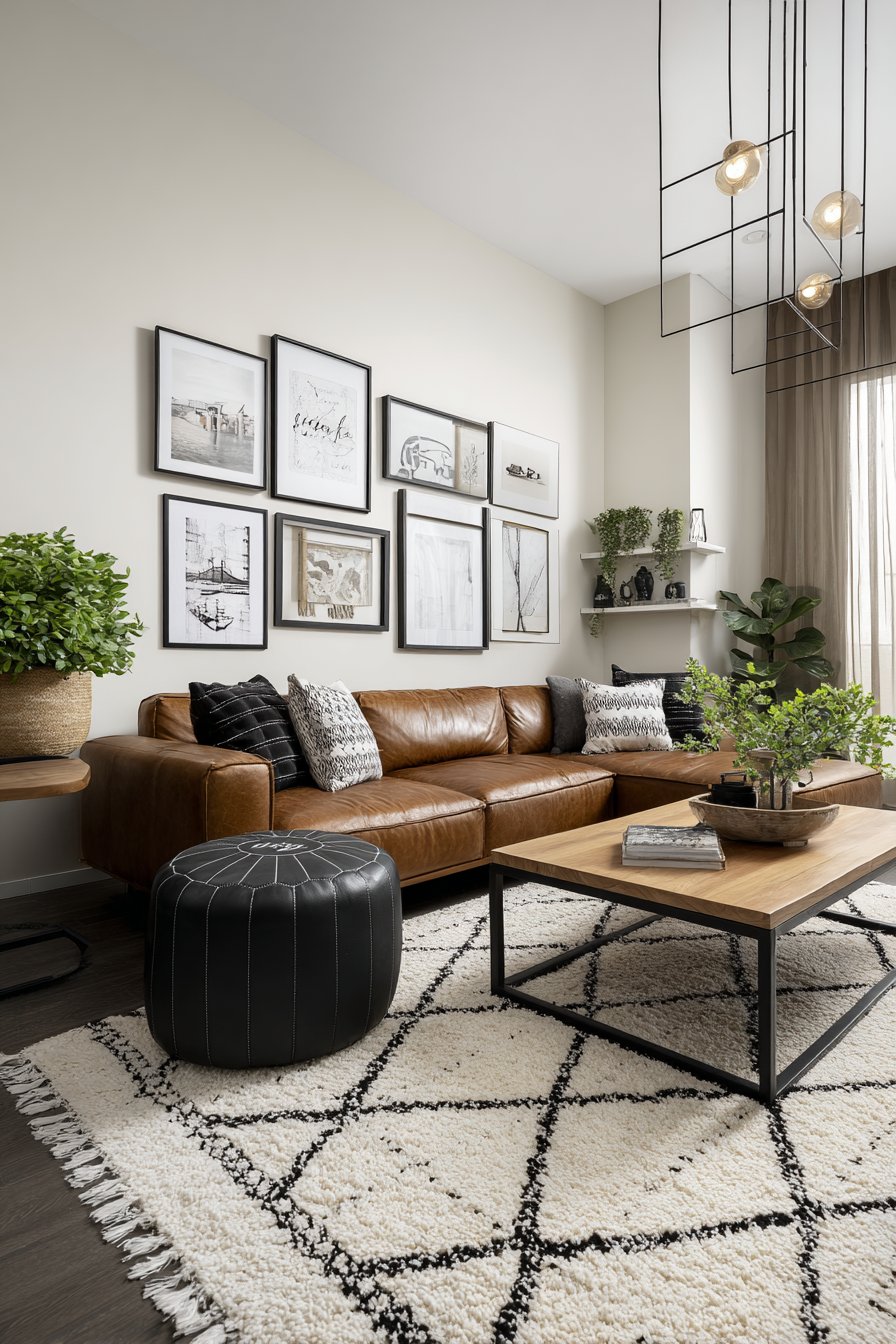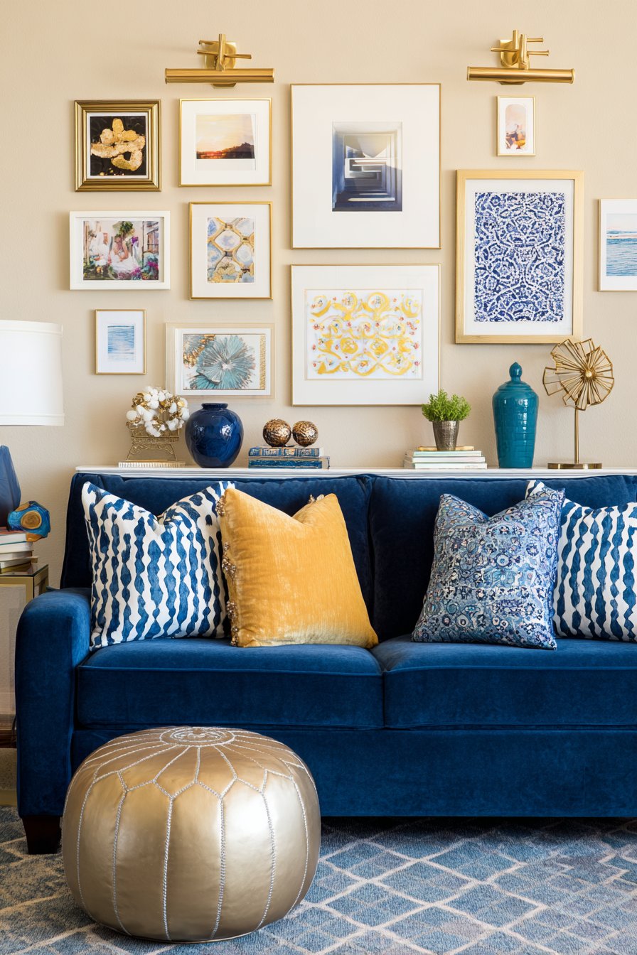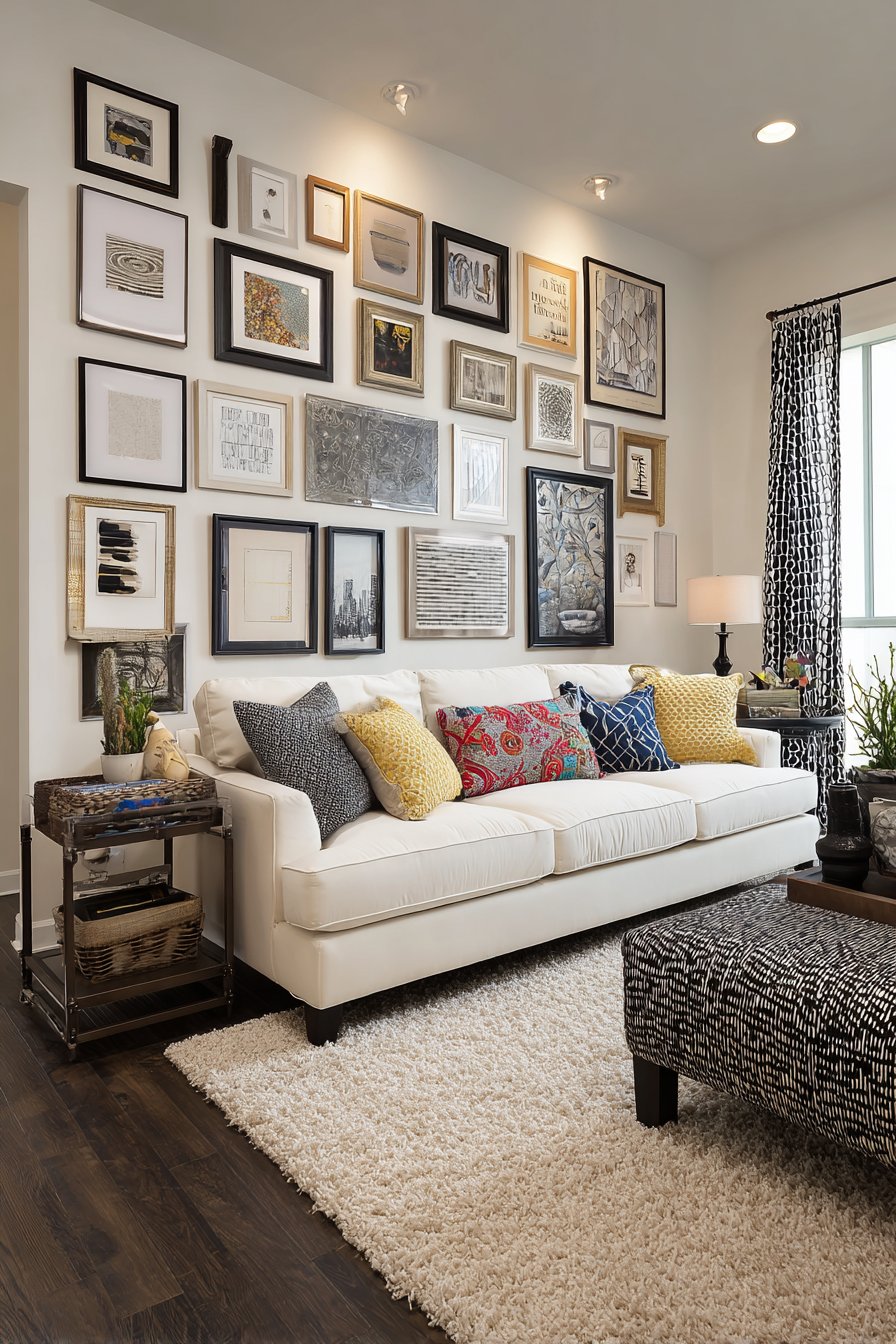 Furniture intentionally remains simple, allowing the wall display to command attention without competition. A neutral sofa provides comfortable seating while serving as backdrop that makes the gallery wall pop. Picture lights highlight key pieces, adding museum-quality presentation and allowing adjustment of which elements receive emphasis. The gallery arrangement receives thoughtful composition with varied frame sizes creating visual rhythm and balanced negative space preventing cluttered appearance.