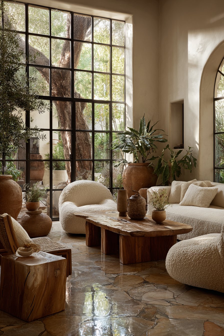 Key Design Tips: Incorporate multiple plants of varying sizes throughout space to introduce living elements and improve air quality. Choose natural wood furniture with visible grain to celebrate organic origins and unique natural patterns. Add stone or terracotta accessories to reference earth materials and provide grounding visual weight. Select nature-inspired color palettes drawn from earth tones that feel instinctively harmonious. Maximize window exposure to maintain connection with outdoor views and support plant growth.