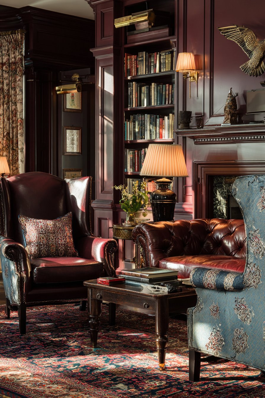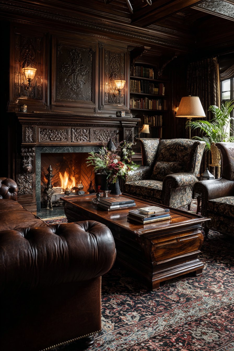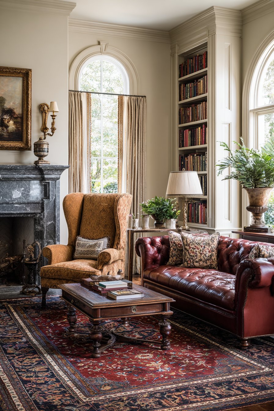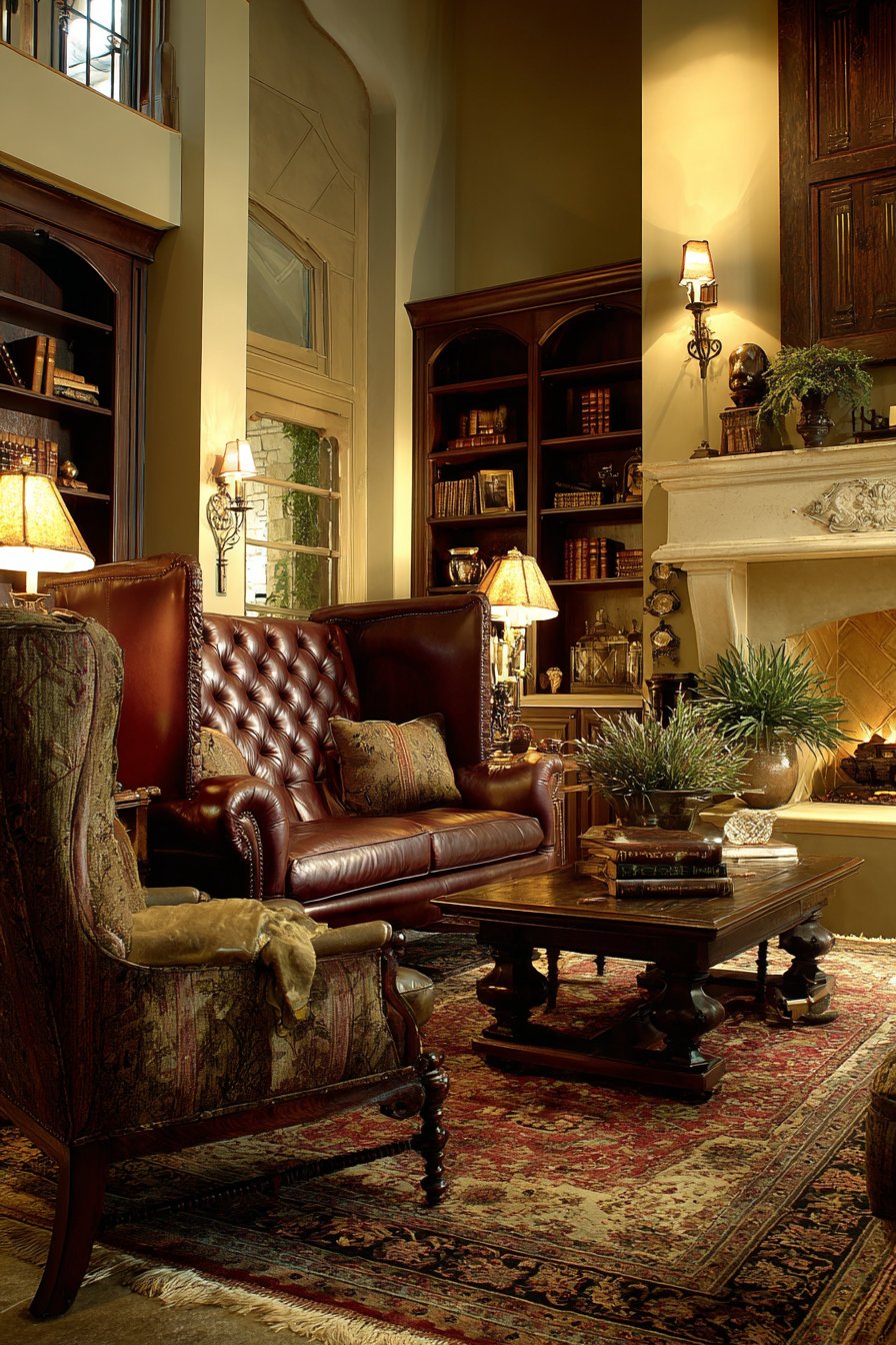 Key Design Tips: Select a Chesterfield sofa for its iconic design that provides both comfort and architectural presence in traditional spaces. Incorporate wingback chairs to add vertical interest and create intimate seating areas within larger rooms. Choose Oriental rugs with intricate patterns to add historical depth and visual complexity beneath furniture arrangements. Install built-in bookshelves to maximize storage while creating architectural symmetry and focal points. Layer ambient lighting sources including table lamps and sconces to create adjustable, warm illumination throughout the space.