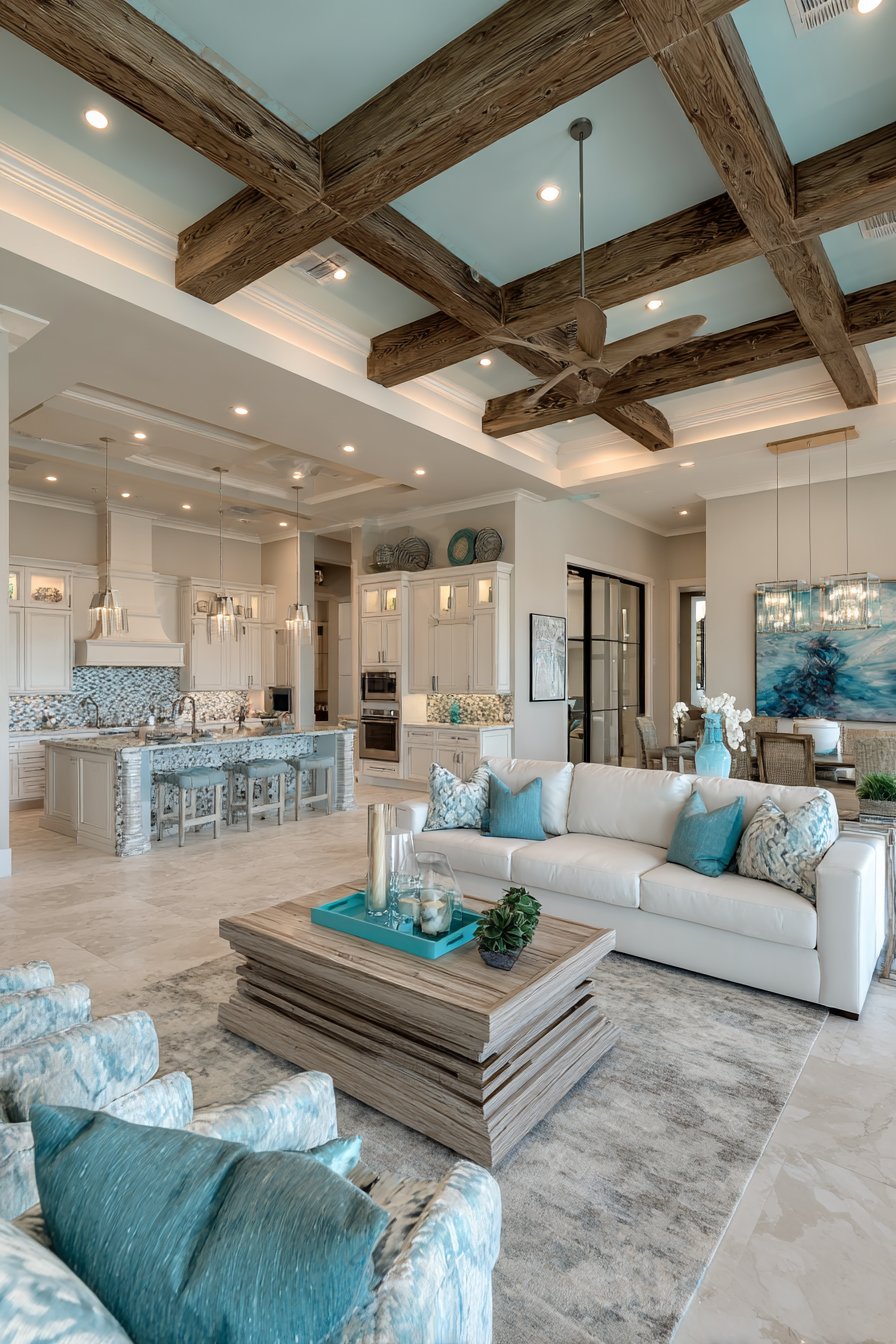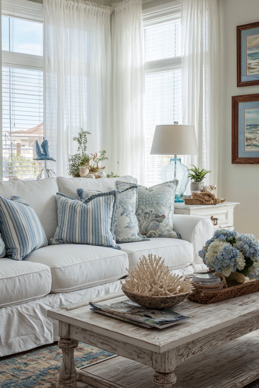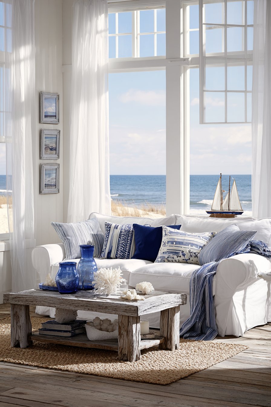 Striped throw pillows in shades of blue and sand introduce pattern while reinforcing the coastal palette—navy, aqua, sandy beige, and crisp white create a refreshing color story that never goes out of style. A seagrass rug adds natural texture underfoot while providing durability perfect for high-traffic beach house living. Decorative elements thoughtfully curated from coastal themes—coral specimens, nautical artwork, weathered wood accents—add personality without veering into theme park territory.