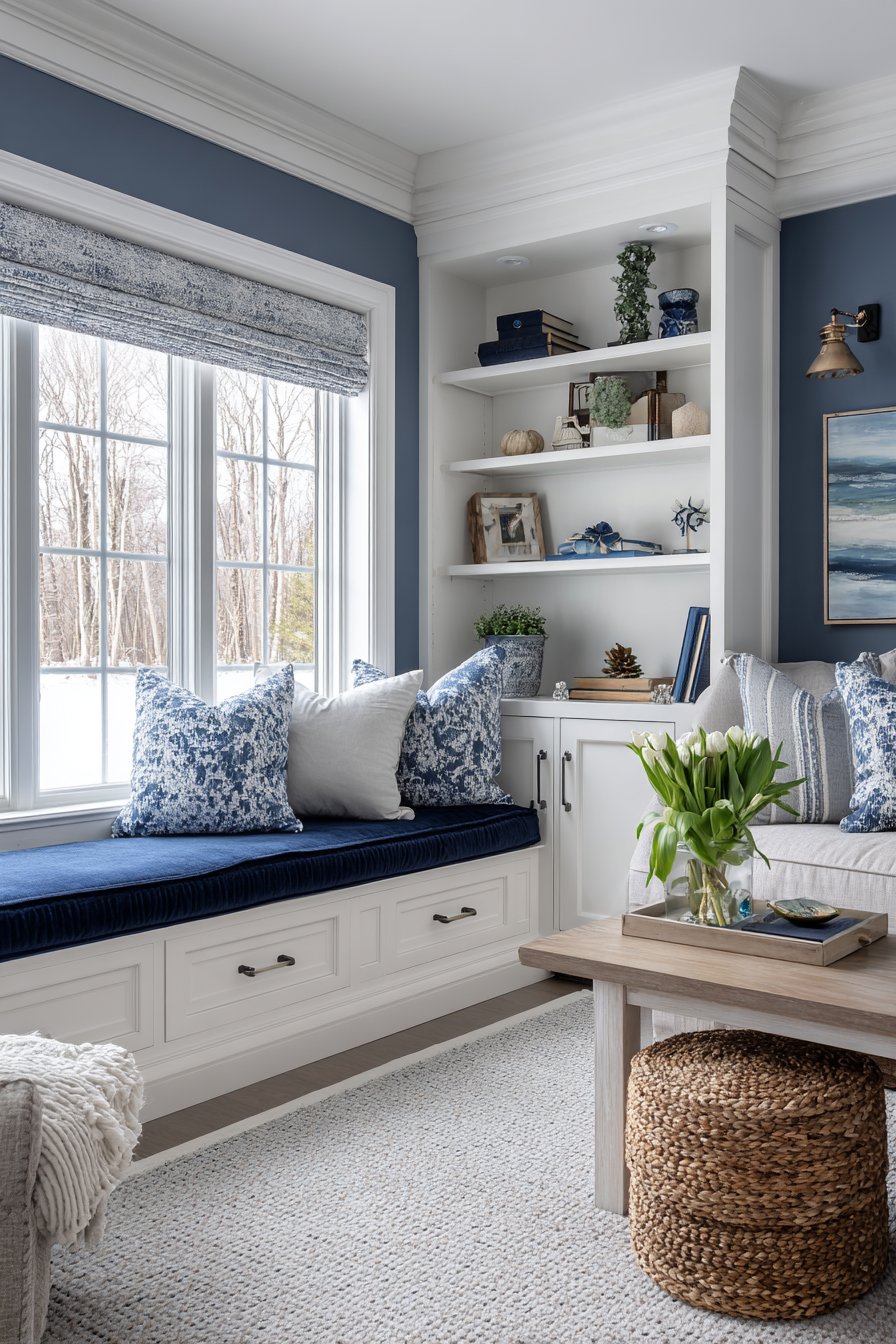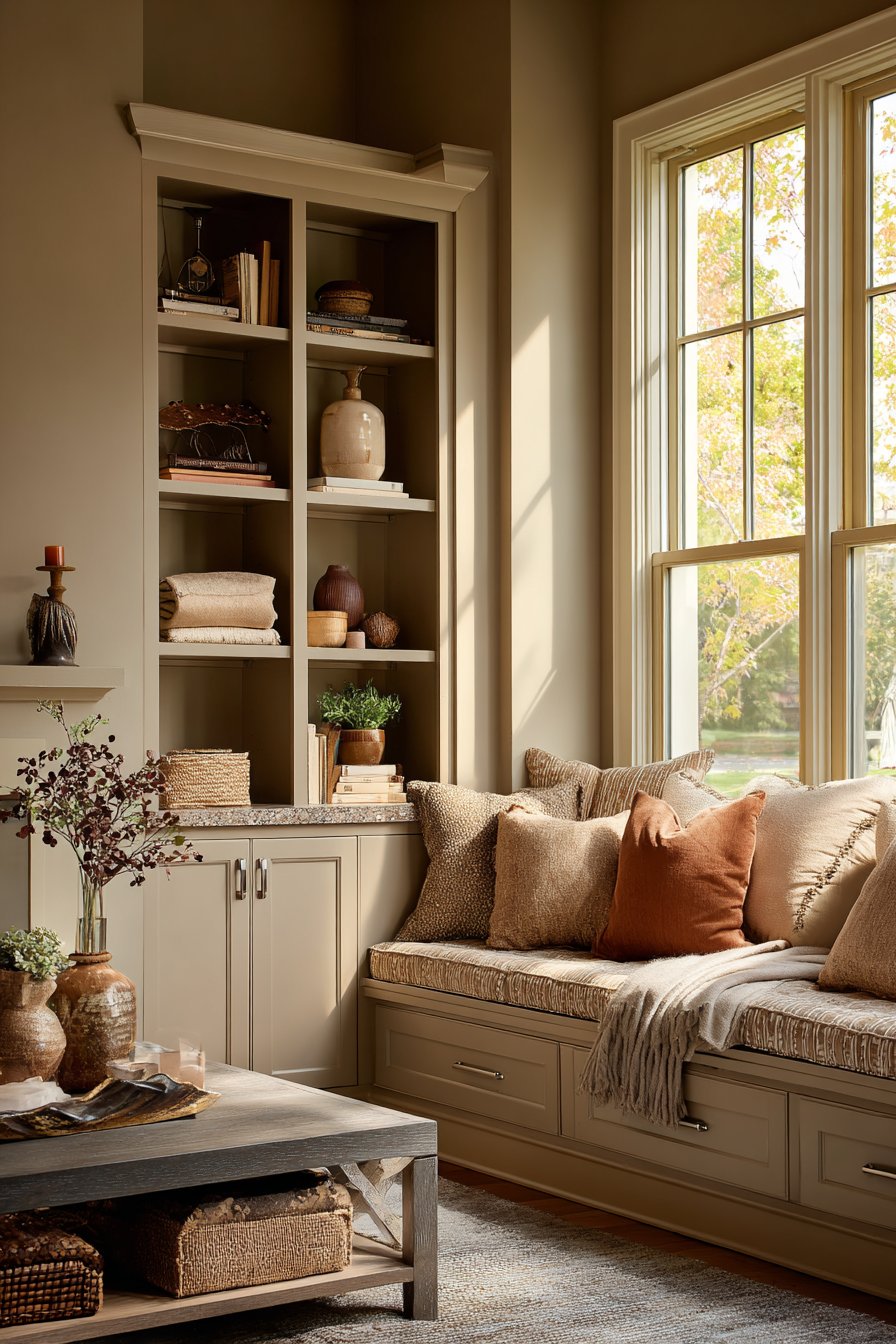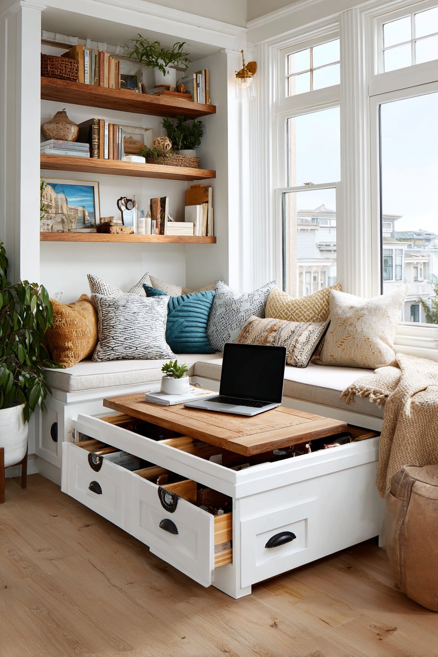 Organization meets aesthetics in this sitting room where abundant storage remains accessible yet largely concealed. A built-in window seat provides comfortable perching spot while concealing storage compartments beneath its cushioned top—perfect for seasonal items, extra throw blankets, or board games. The coffee table features drawers that keep remote controls, coasters, and other living room necessities close at hand but out of sight.
