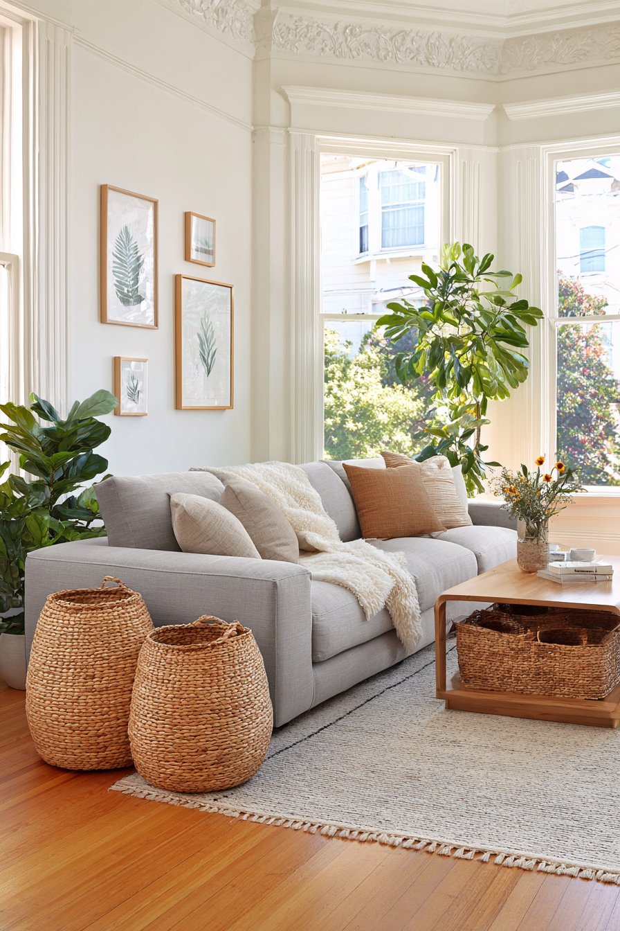 Woven storage baskets tucked beneath the coffee table demonstrate the Scandinavian commitment to concealing clutter without sacrificing accessibility. These natural fiber baskets add texture while keeping everyday items within reach but out of sight, maintaining the room’s visual serenity. White walls maximize light reflection and create a sense of expansiveness, serving as a neutral backdrop that allows the natural materials and subtle colors to take center stage.