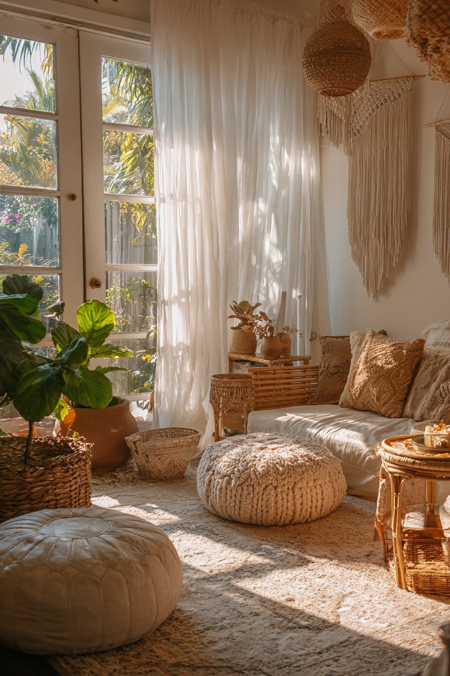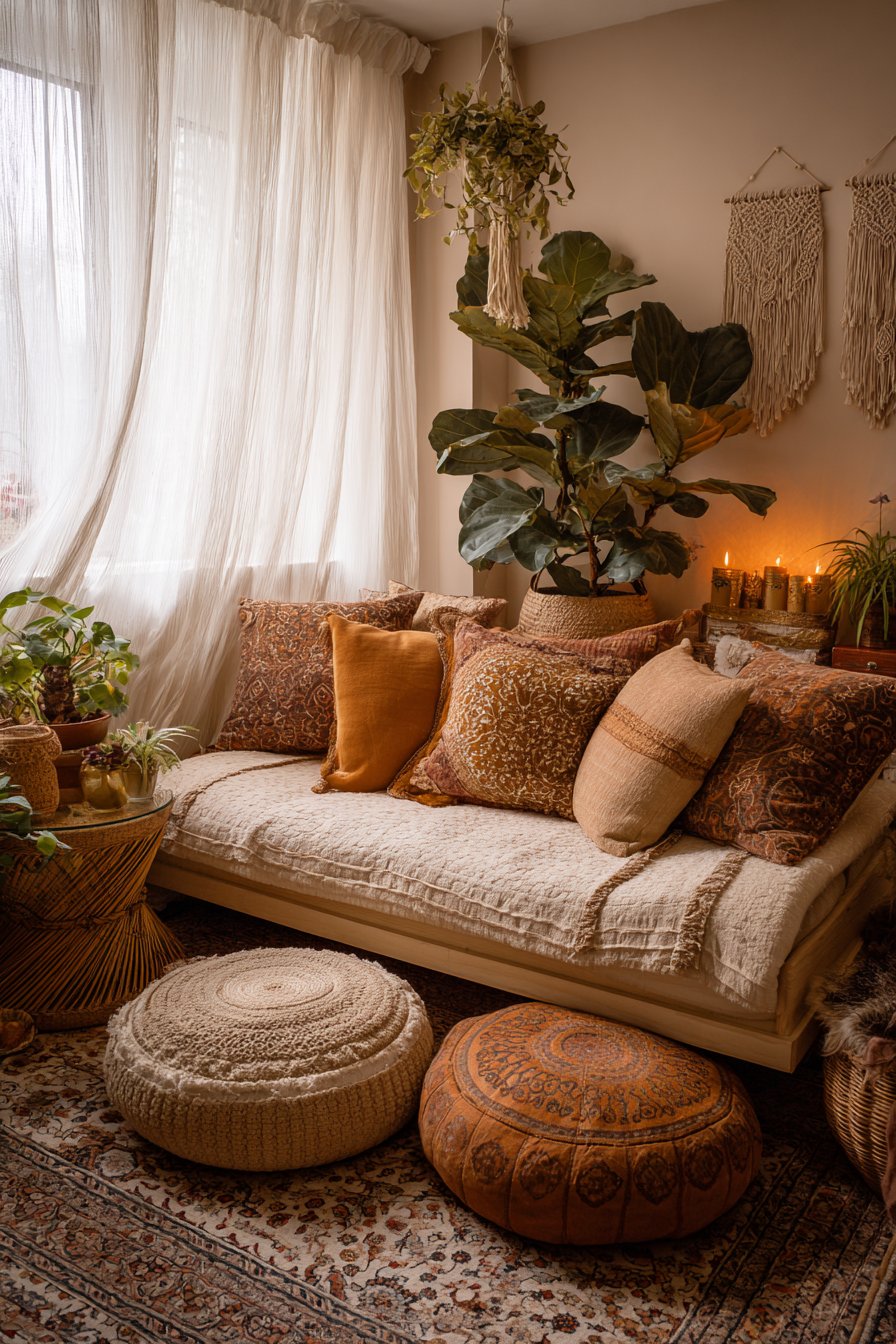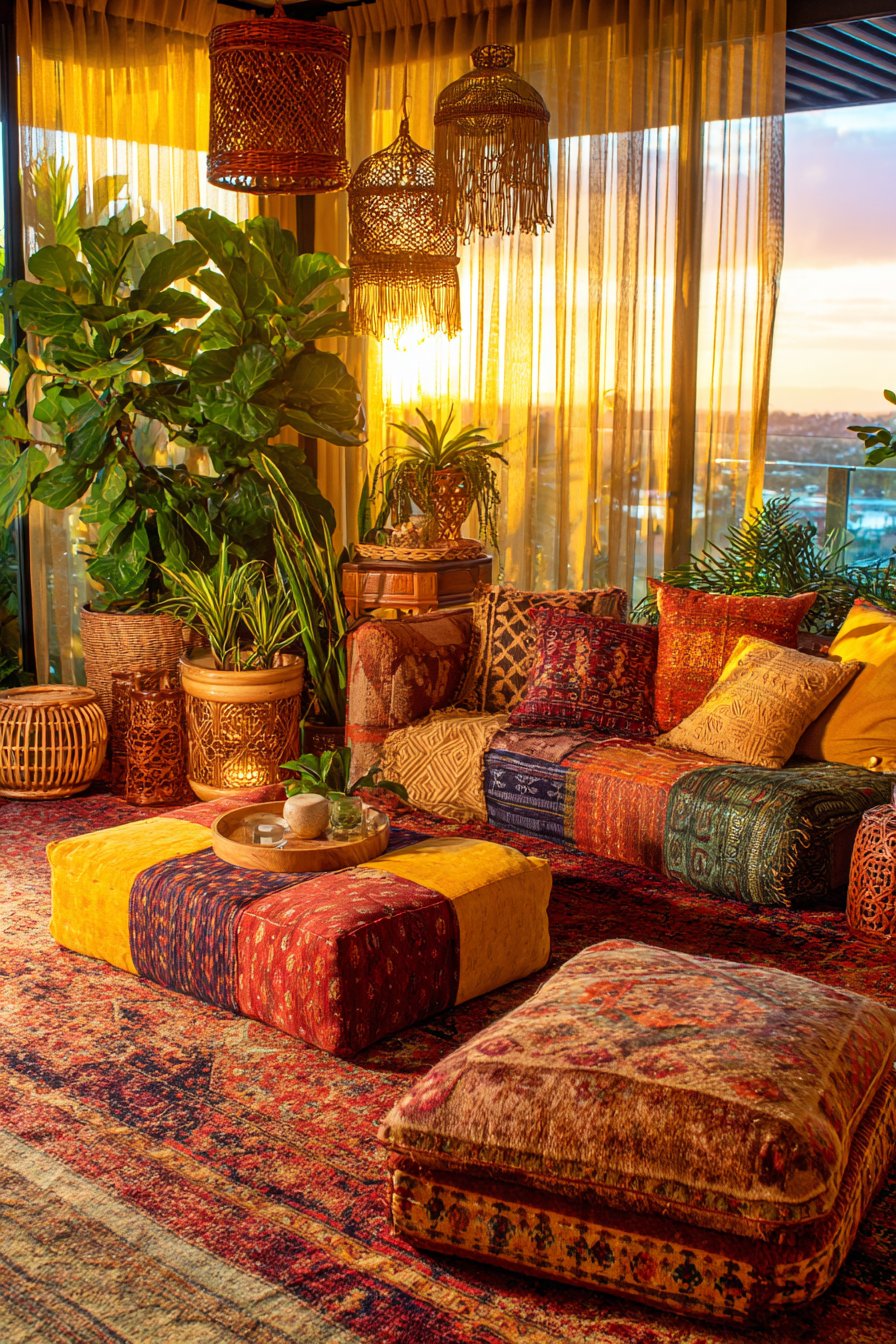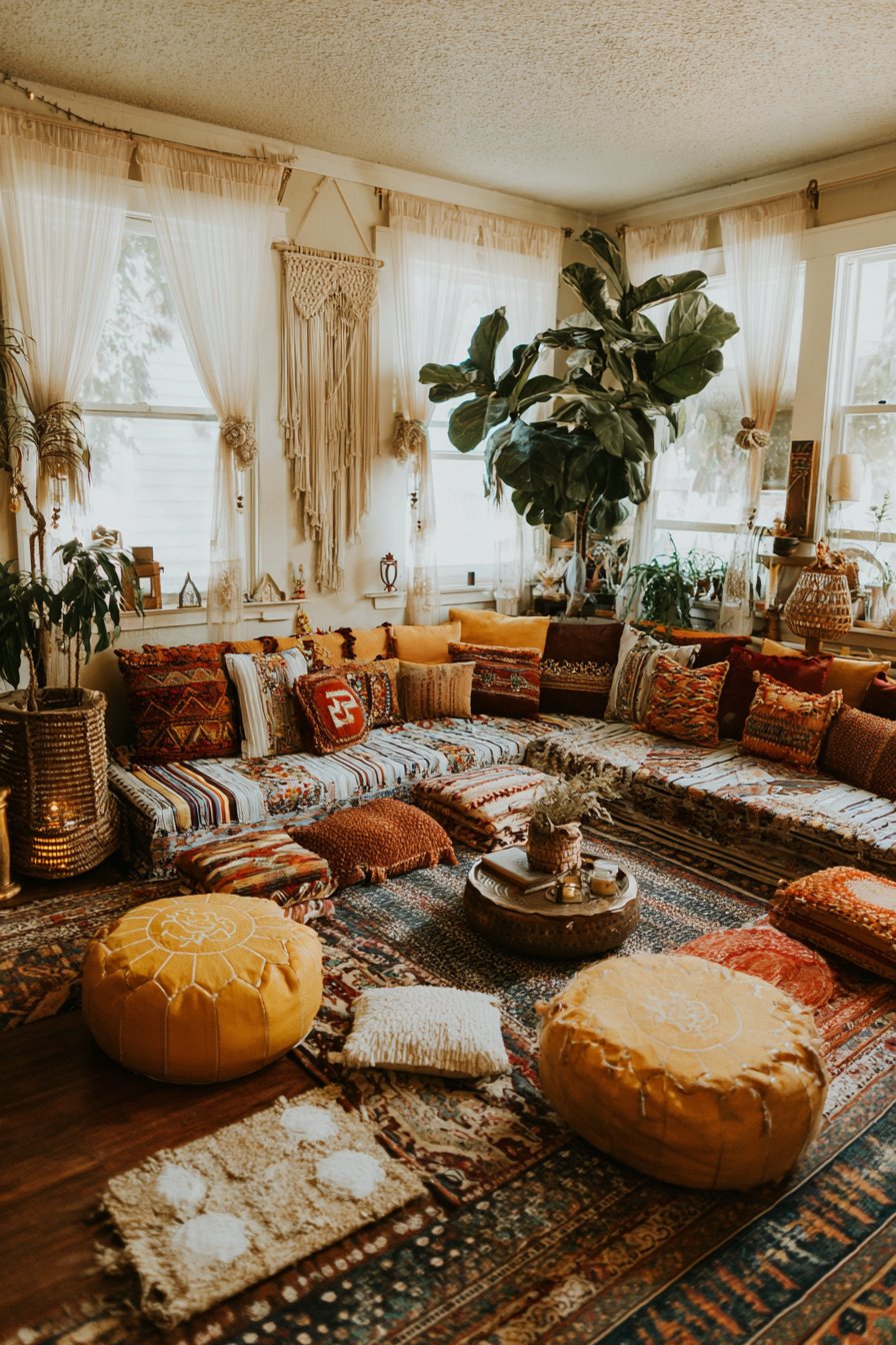 This vibrant sitting room celebrates the free-spirited bohemian aesthetic through its fearless mixing of patterns, textures, and cultural influences. The low-slung sofa serves as a foundation for an abundant collection of mixed patterned cushions in earthy tones—terracotta, ochre, sage, and burnt sienna create a warm, organic palette. Floor cushions and poufs scattered around the space provide flexible additional seating while reinforcing the relaxed, informal atmosphere that defines bohemian style.