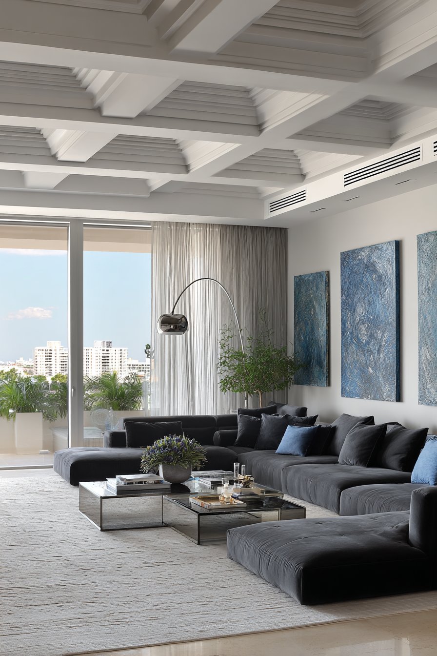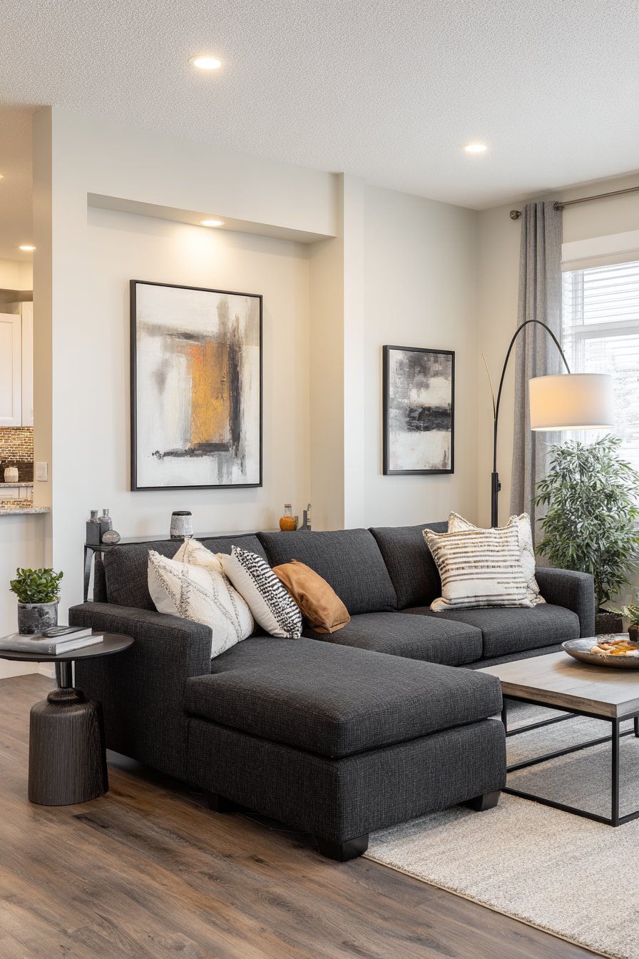 Clean lines and sophisticated materials define this contemporary sitting room designed for modern urban living. The sleek L-shaped sofa in charcoal fabric provides ample seating while maintaining the streamlined aesthetic essential to contemporary design. Its low profile and geometric form create visual interest through shape rather than ornamentation, embodying the principle that form follows function. A geometric coffee table featuring a metal frame and glass top adds industrial edge while maintaining transparency.