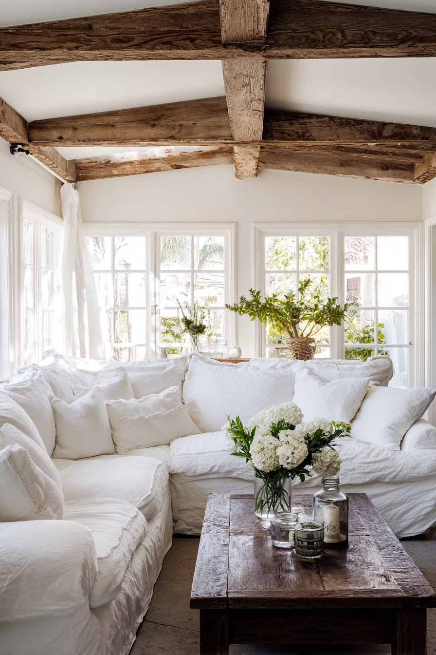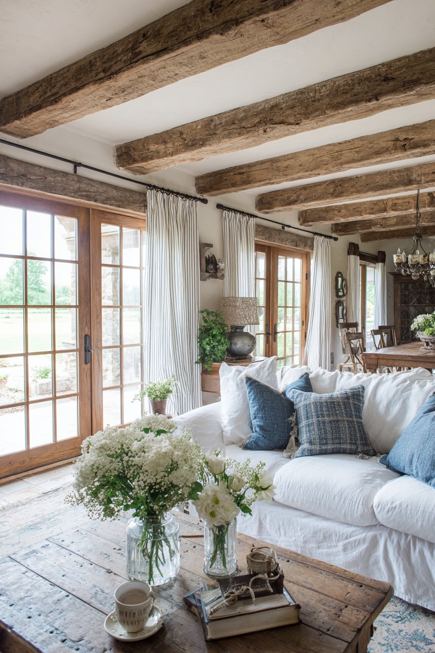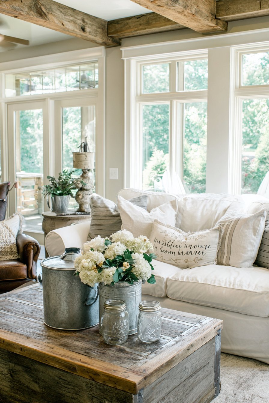 Exposed wooden beams crossing the ceiling add architectural interest and historical character, creating visual rhythm and emphasizing the room’s height. These structural elements, left natural or lightly stained, connect the interior to traditional agricultural buildings while adding warm wood tones overhead. Galvanized metal accessories and mason jar vases filled with fresh flowers introduce authentic farmhouse elements that balance the softness of the textiles.