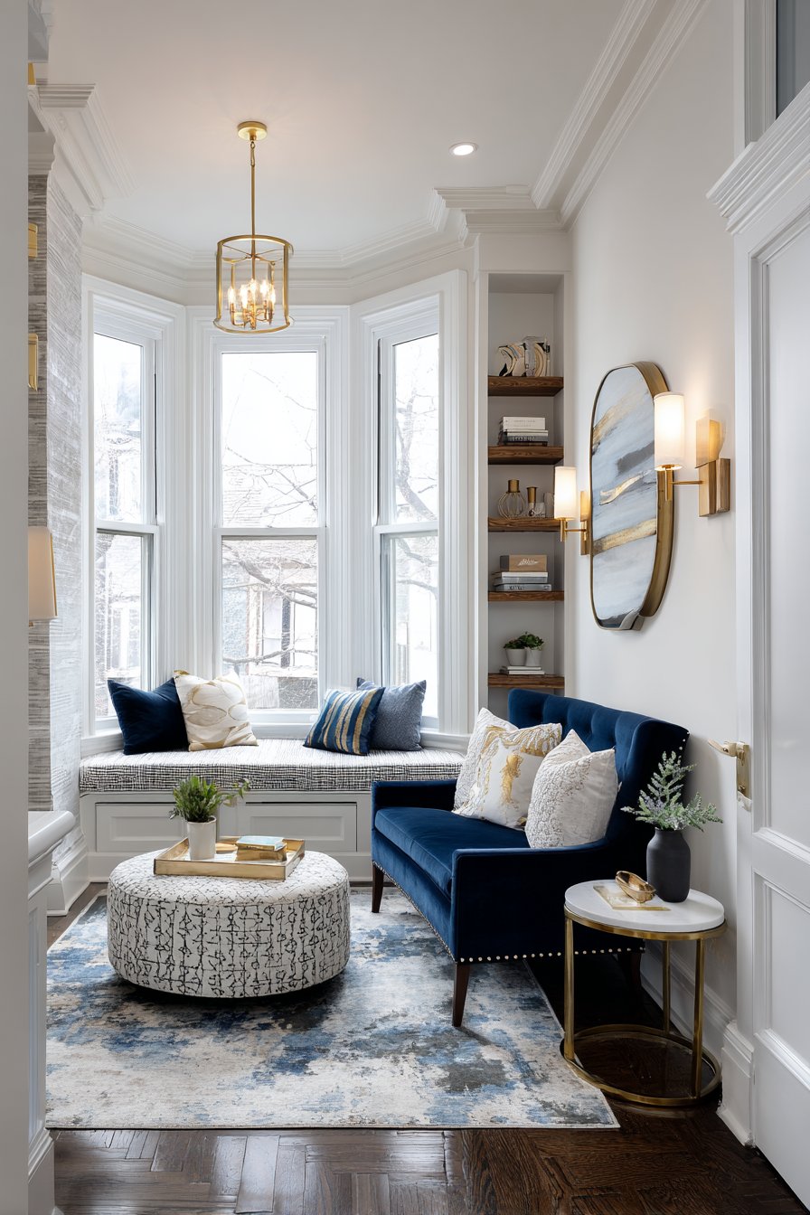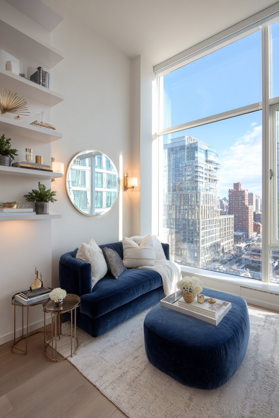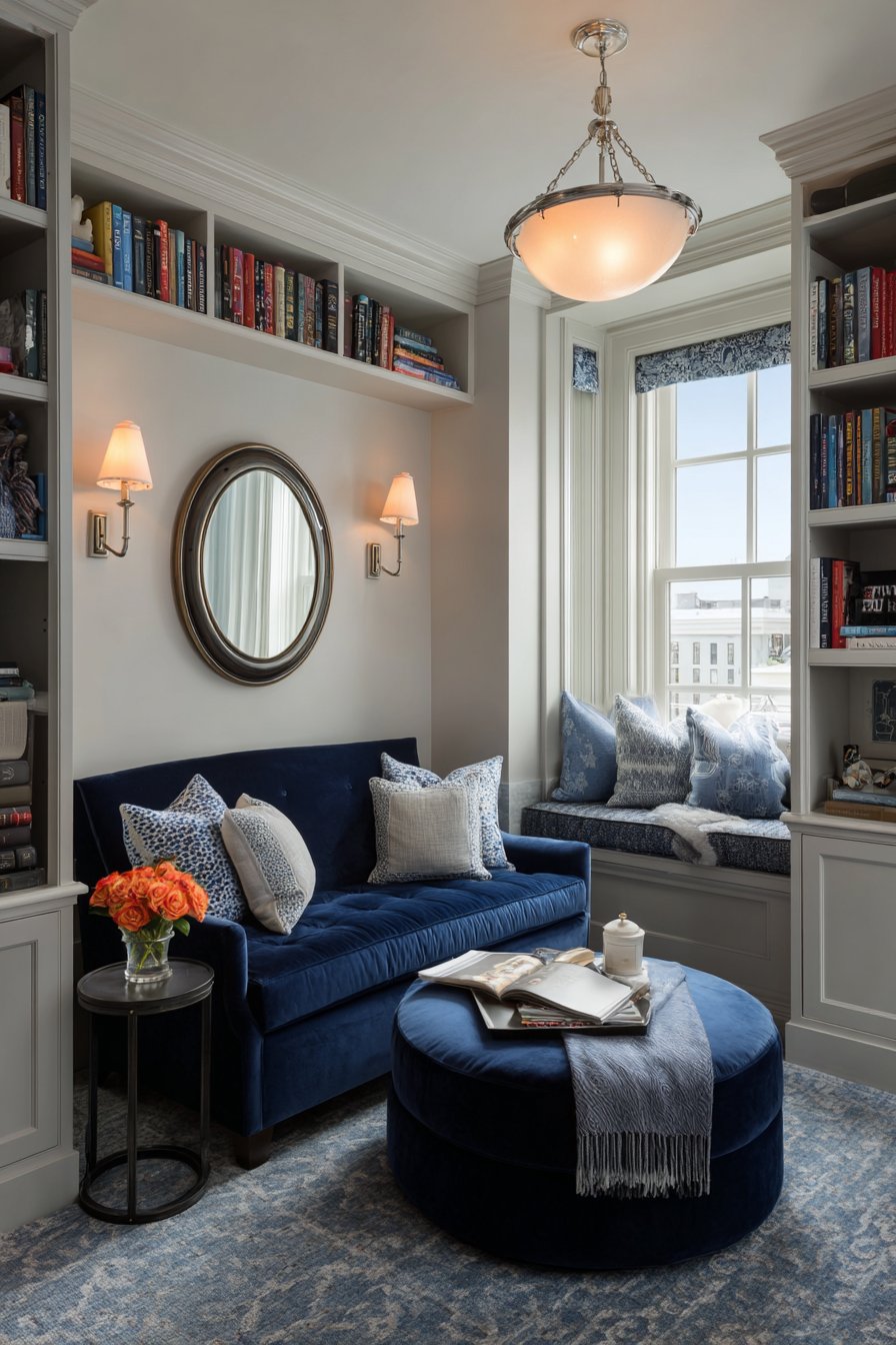 Clever lighting choices include wall sconces that provide illumination without requiring floor or table space, keeping surfaces clear and maximizing the usable area. The overall color scheme remains light and bright, with the navy velvet providing a jewel-like accent rather than making the space feel heavy or closed in. This sitting room proves that small spaces can be both functional and beautiful when every element earns its place.