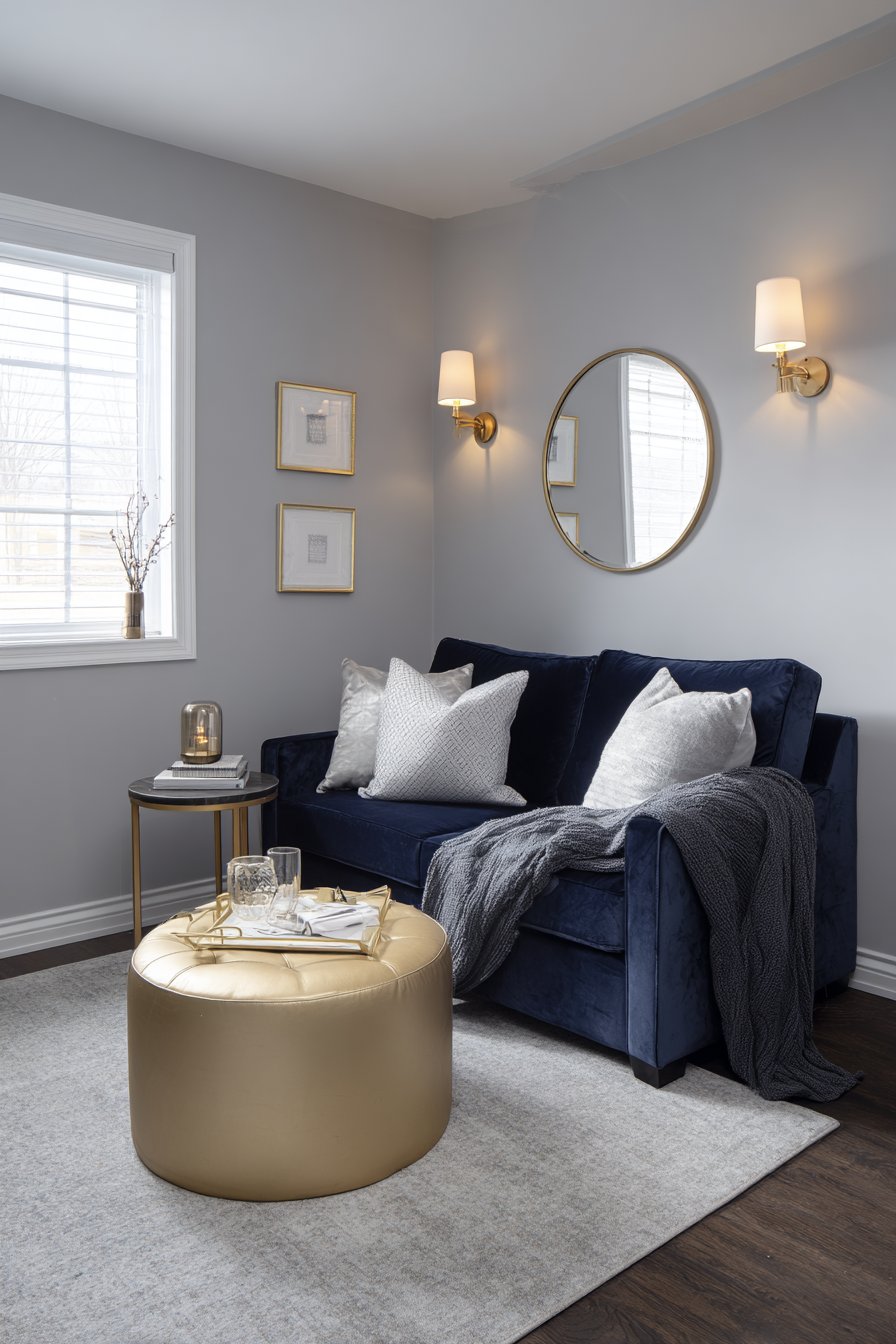 Maximizing limited square footage requires strategic thinking and multifunctional furniture, as demonstrated in this clever small sitting room design. A compact loveseat upholstered in navy blue velvet provides comfortable seating for two without overwhelming the modest dimensions, its rich color adding depth and luxury to the small space. Nesting side tables offer flexibility—they can be separated for entertaining or tucked together to minimize footprint when not needed.