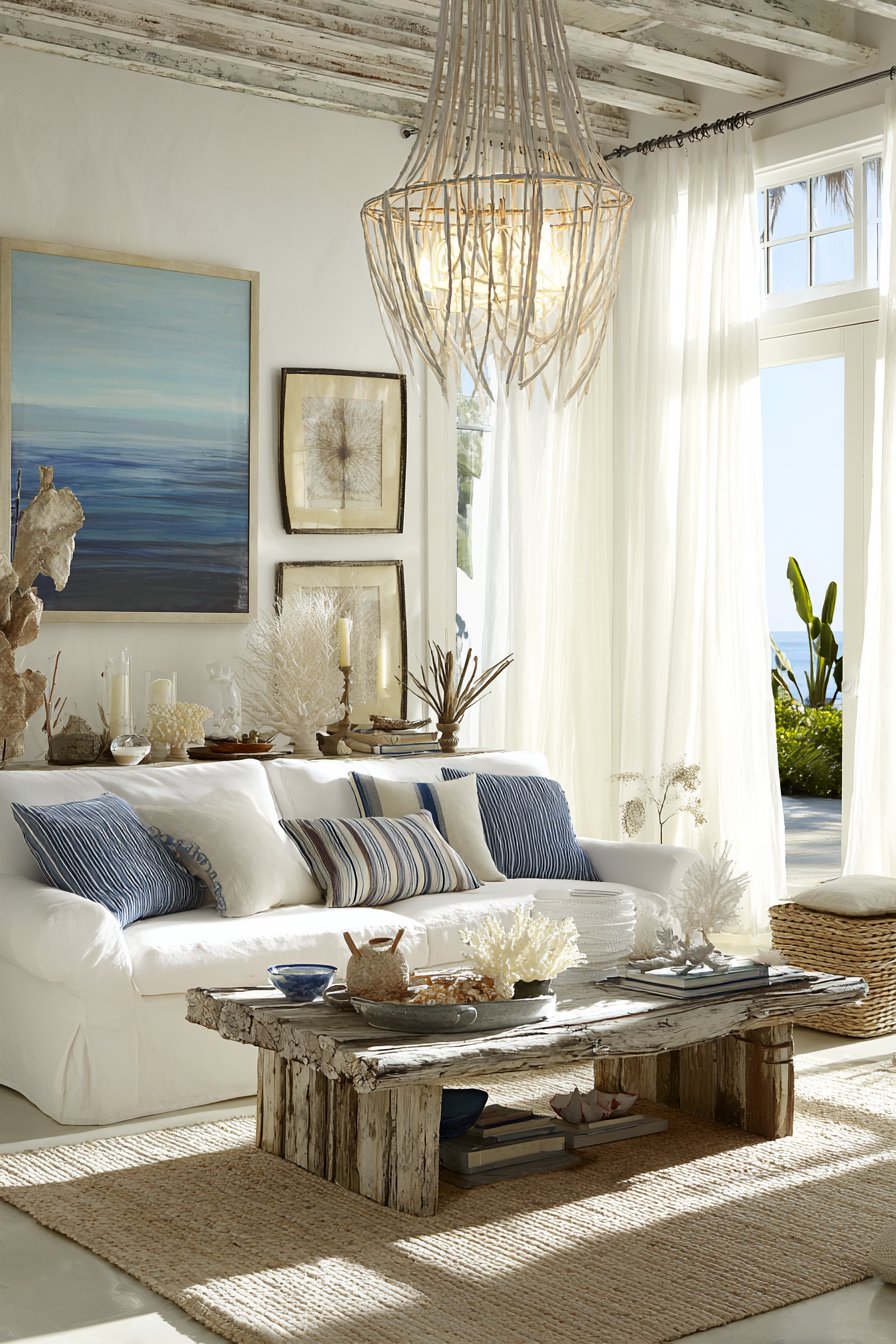 Key Design Tips: Choose white slipcovered sofas for their casual coastal aesthetic and practical cleanability in sandy beach environments. Select driftwood furniture pieces to add authentic coastal character and organic sculptural interest. Incorporate striped textiles in blue and sand tones to introduce pattern while maintaining classic coastal color palette. Install seagrass or sisal rugs for natural texture and durability perfect for barefoot beach house living. Add carefully curated coastal decorative elements like coral and weathered wood to enhance theme without overwhelming.