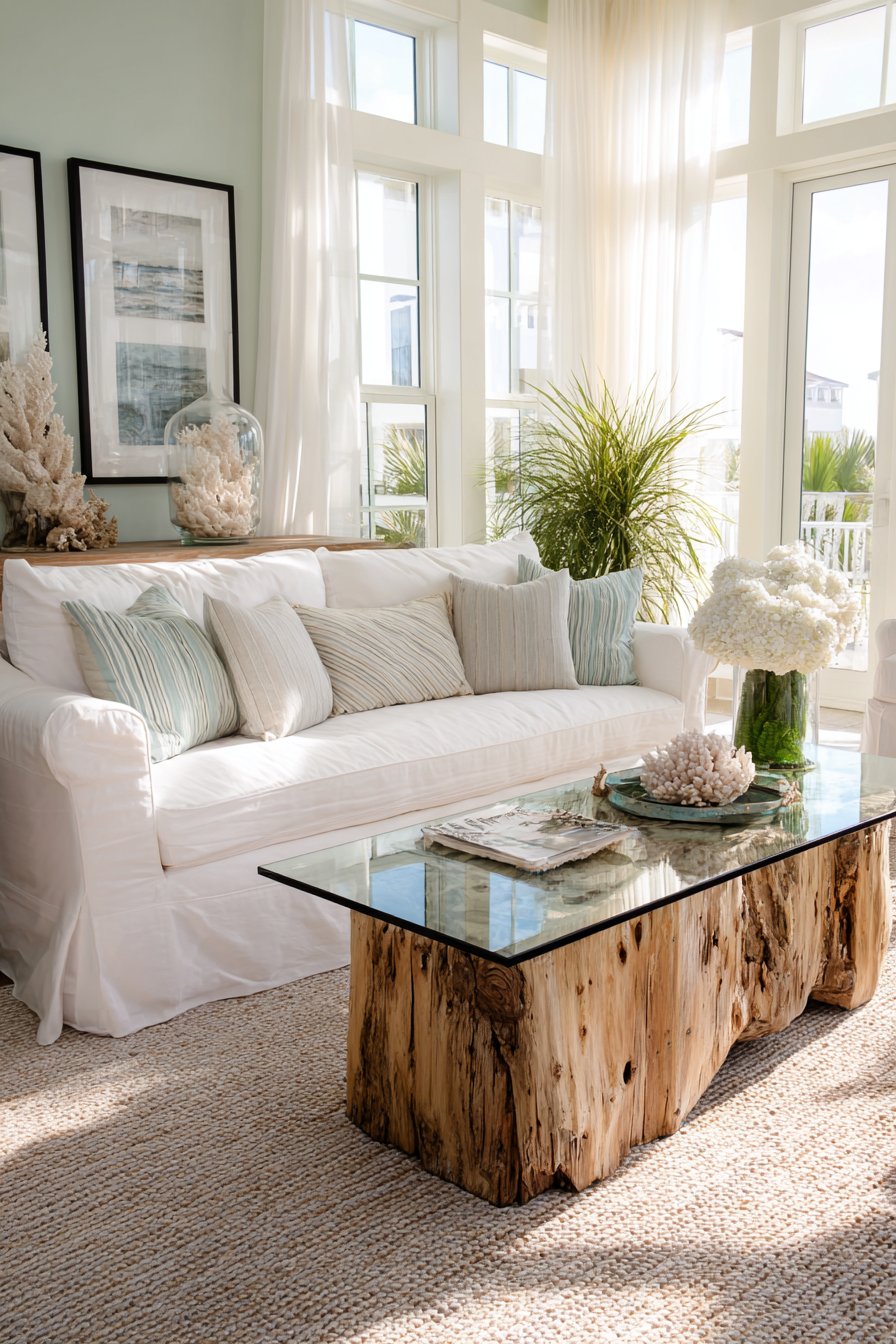 Ocean-inspired serenity defines this coastal sitting room where relaxed elegance meets beach house casual. A white slipcovered sofa creates a fresh, casual foundation reminiscent of sandy beaches and sea foam, its practical fabric choice allowing for easy maintenance in sandy, sun-drenched environments. The driftwood coffee table brings authentic coastal character, its weathered surface and organic form evoking treasures discovered during beach walks.
