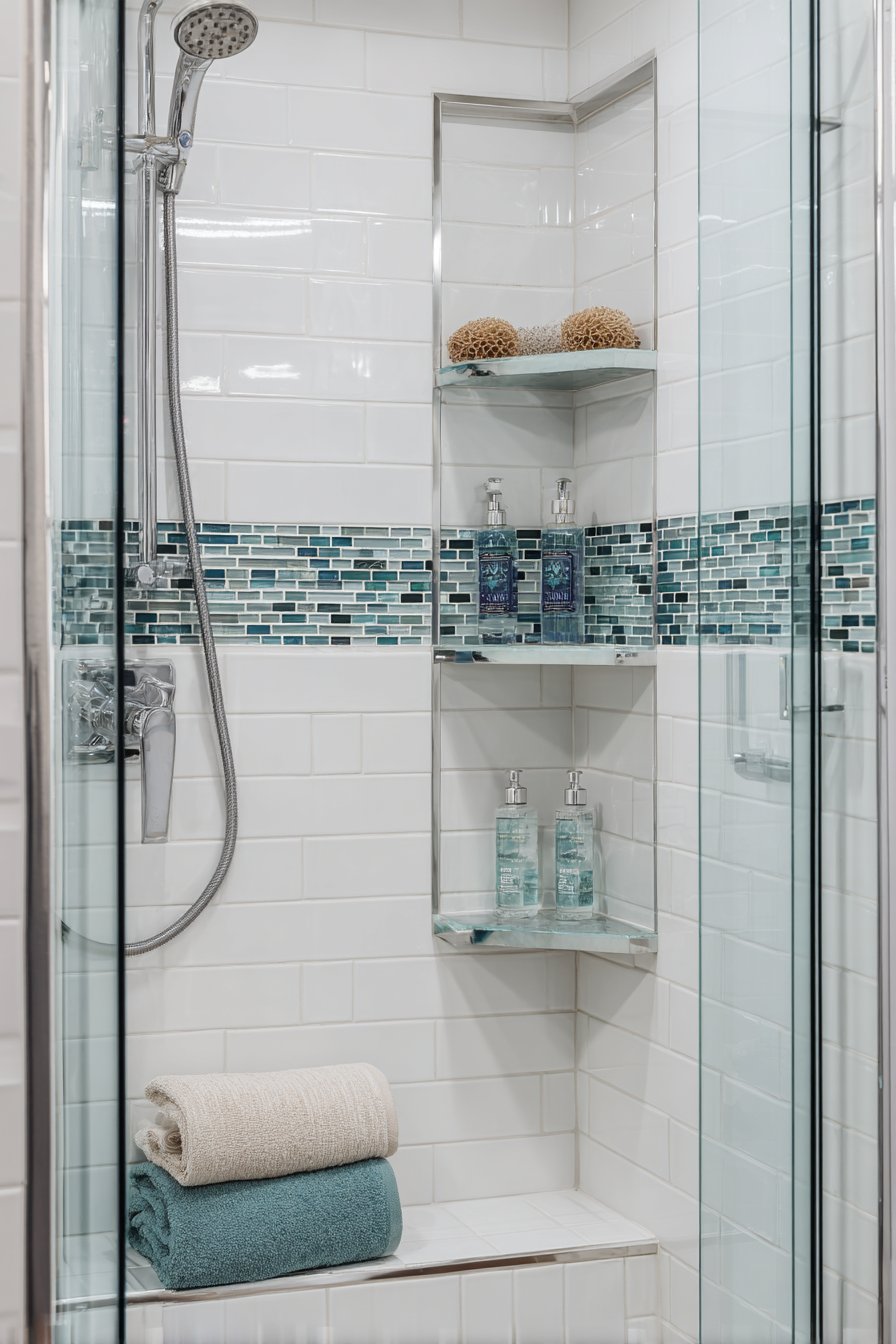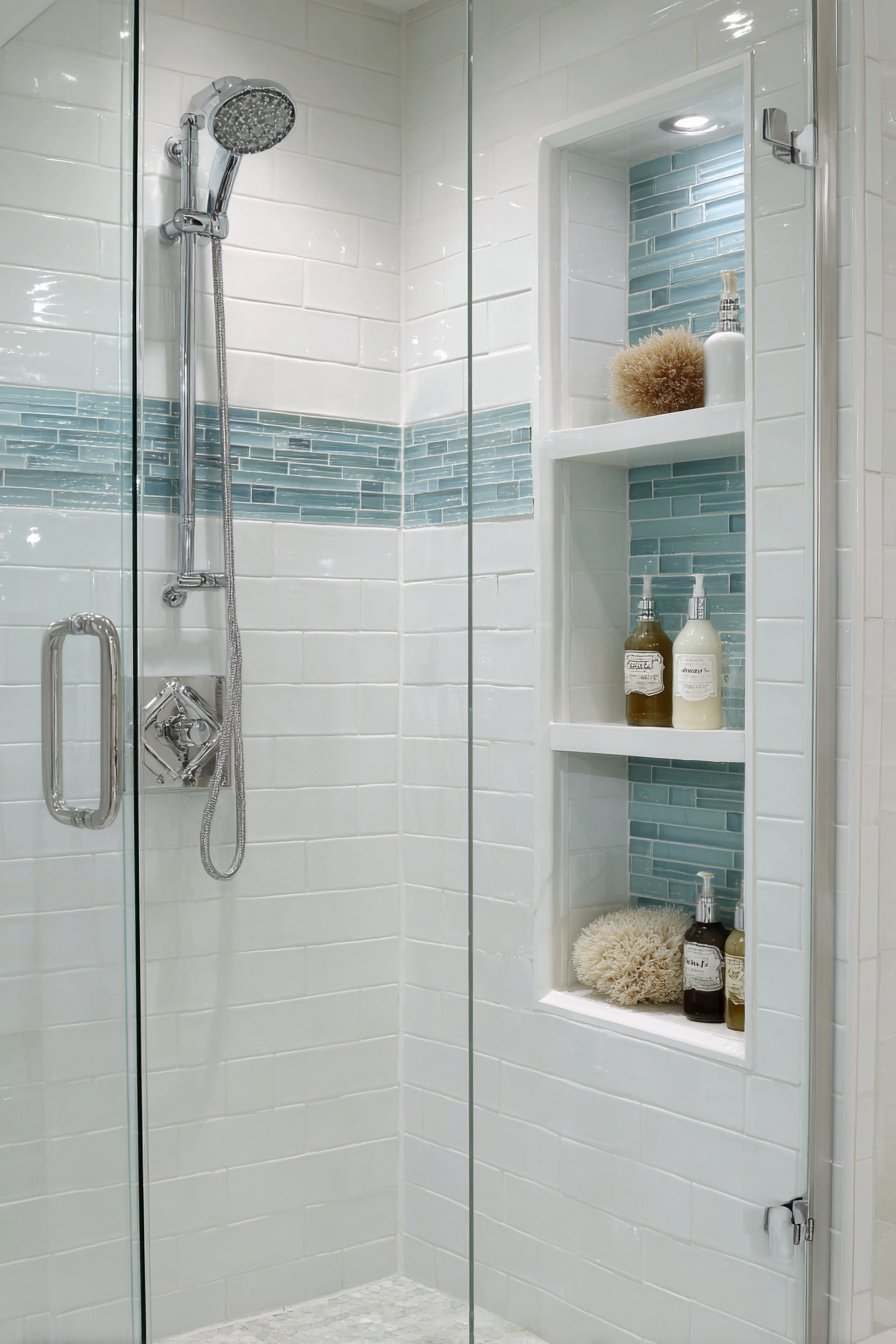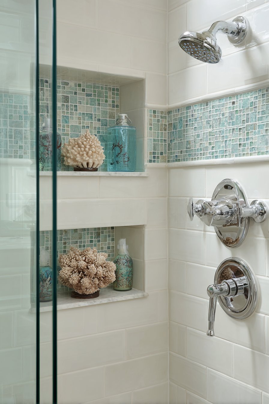 A tiled shower alcove featuring white subway tiles demonstrates how built-in storage can be both beautiful and practical in this small coastal bathroom. A horizontal stripe of turquoise glass mosaic tiles runs at eye level, breaking up the white expanse while introducing the ocean-inspired color essential to coastal design. Three built-in shelves carved into the wall provide designated storage for shampoo bottles and natural loofahs without requiring adhesive caddies or tension poles that often look like afterthoughts in shower design.