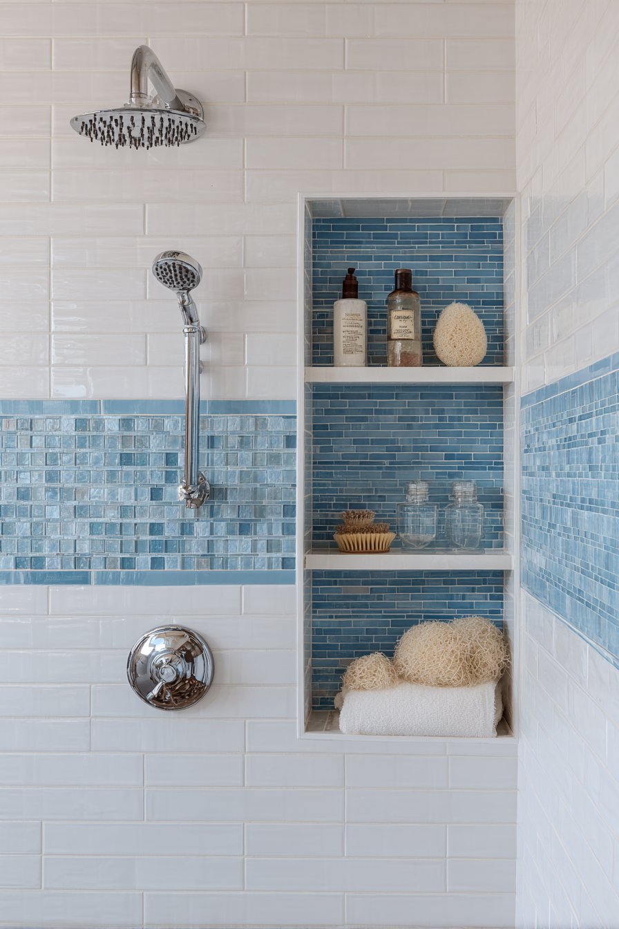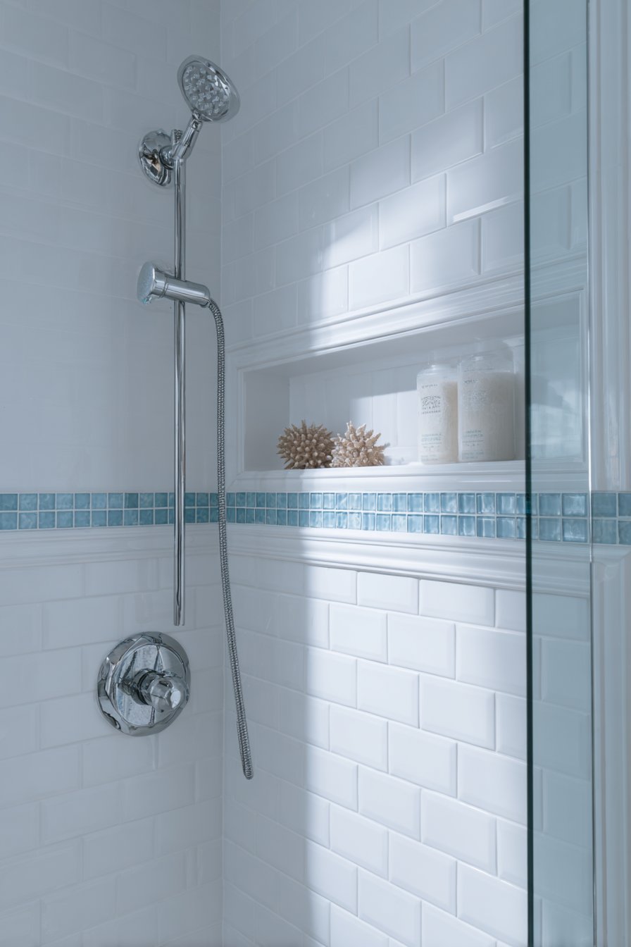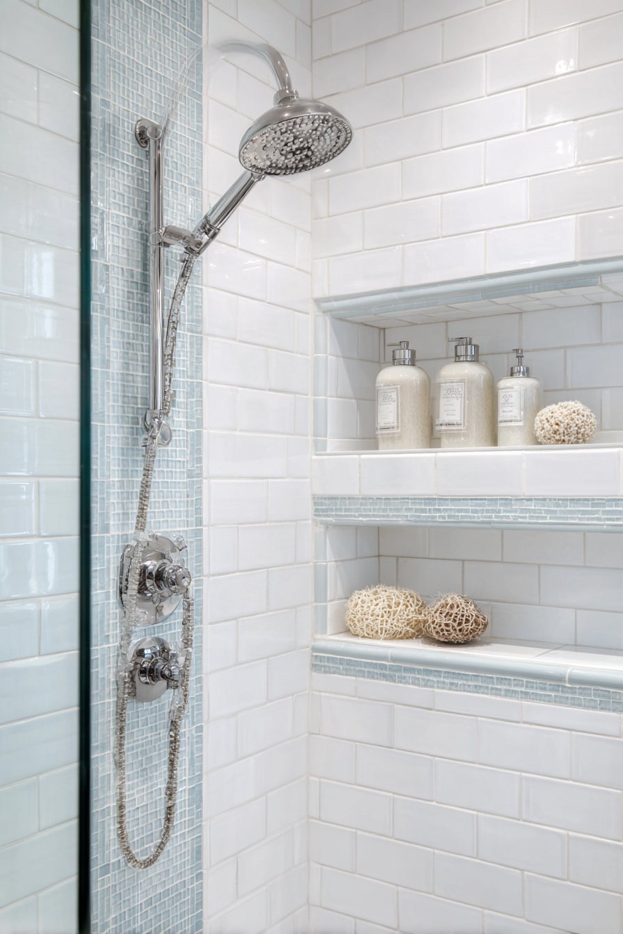A tiled shower alcove featuring white subway tiles demonstrates how built-in storage can be both beautiful and practical in this small coastal bathroom. A horizontal stripe of turquoise glass mosaic tiles runs at eye level, breaking up the white expanse while introducing the ocean-inspired color essential to coastal design. Three built-in shelves carved into the wall provide designated storage for shampoo bottles and natural loofahs without requiring adhesive caddies or tension poles that often look like afterthoughts in shower design.