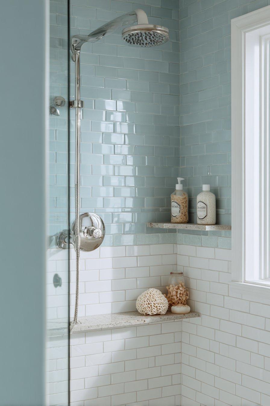 Material selection plays a crucial role in this design’s success, with the combination of glossy subway tiles and textured glass mosaics creating visual interest through varied surfaces. The subway tiles’ timeless appeal ensures the bathroom won’t feel dated in a few years, while the blue accent stripe can be easily updated if you decide to shift your color scheme. The corner shelf’s integration into the tile work demonstrates how smart planning can eliminate the need for hanging caddies or tension poles that often make small showers feel cluttered.