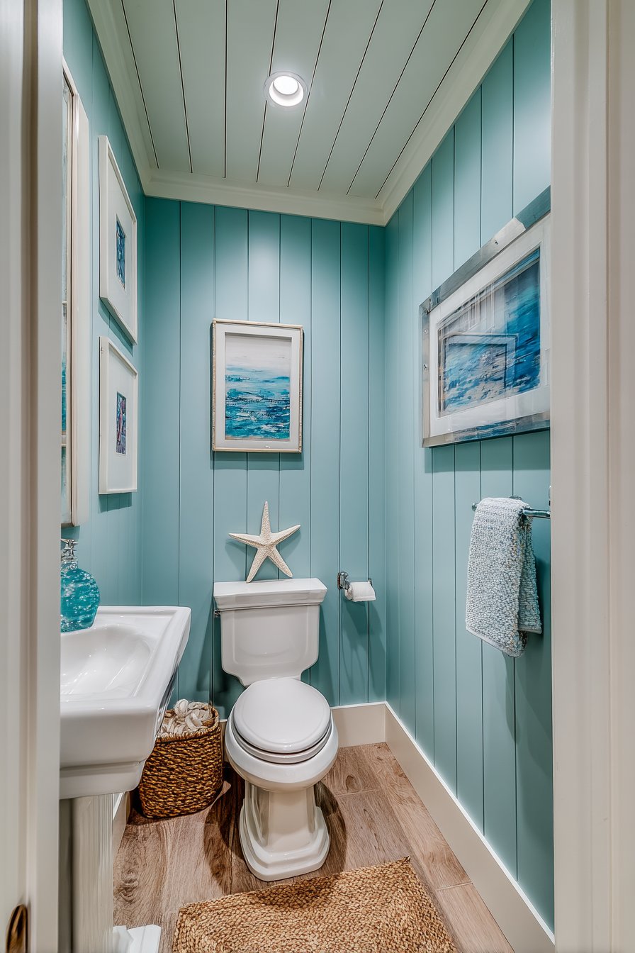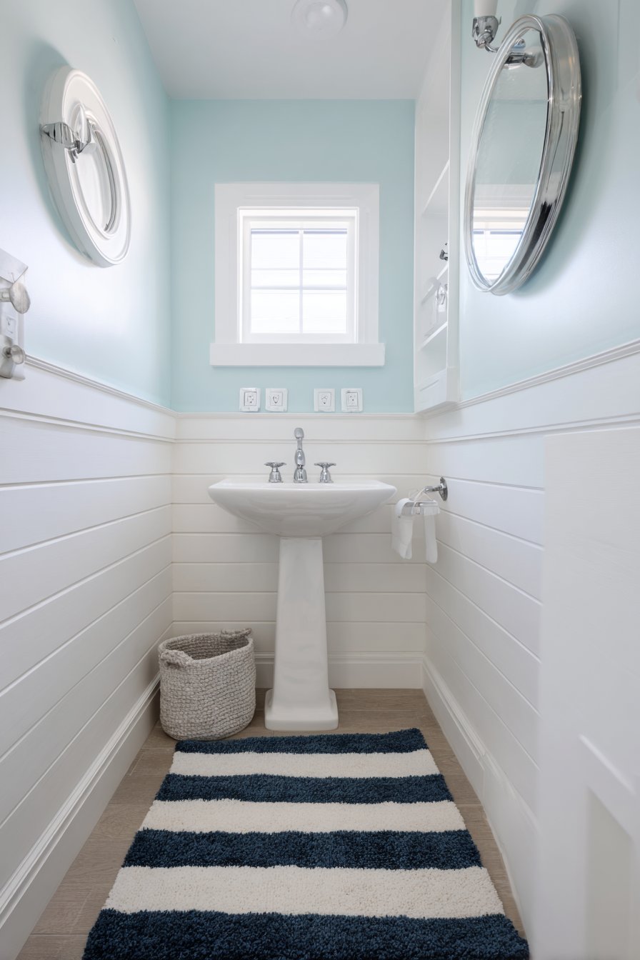 A strategically placed shiplap accent wall painted in pale aqua blue creates instant coastal atmosphere behind a compact pedestal sink in this small bathroom design. The horizontal boards draw the eye across the wall, making the room feel wider than its actual dimensions while adding architectural texture that elevates the space beyond basic drywall. White beadboard wainscoting wraps the lower portion of the remaining walls, providing visual weight that grounds the design while protecting high-impact areas from water damage and everyday wear.