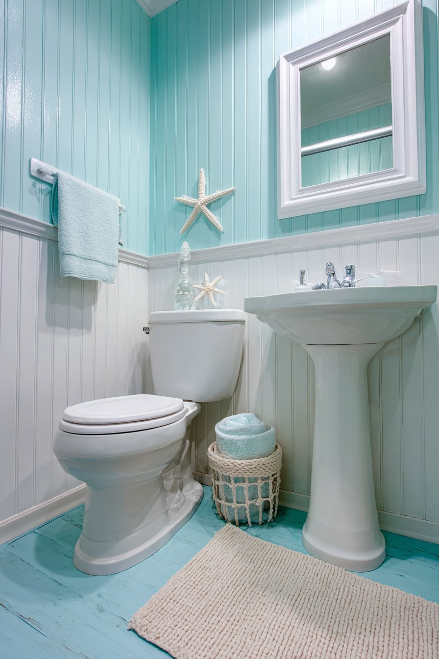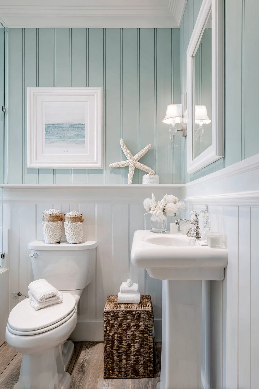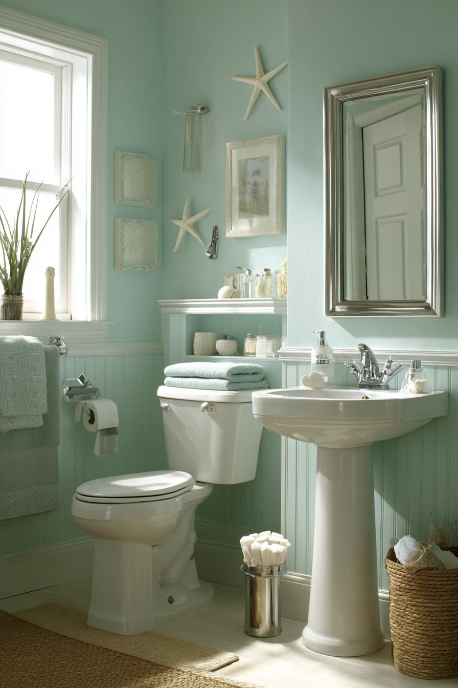 This small coastal bathroom serves as a masterclass in color coordination, with walls painted in soft seafoam green creating a soothing envelope around white porcelain fixtures including a toilet and matching pedestal sink. The crisp contrast between colored walls and white fixtures establishes clear visual hierarchy while maintaining the light, fresh feeling that characterizes successful coastal design. Accessories including natural jute rope details, white ceramic starfish, and hand towels in coordinating aqua tones reinforce the color scheme without introducing competing hues that would fragment the cohesive look.