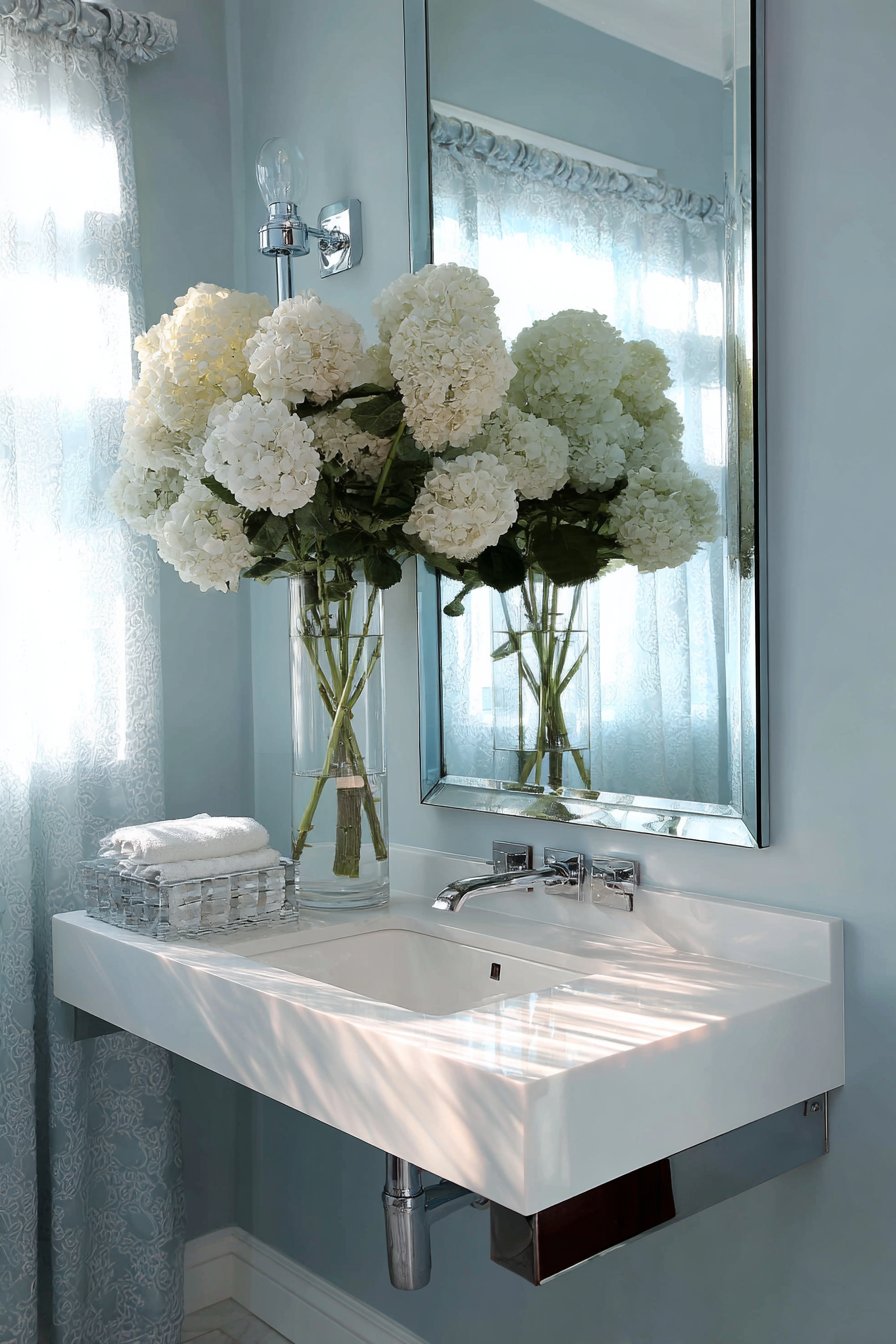 The beveled edges of the frameless mirror catch light at their angled surfaces, creating subtle sparkle without requiring ornate frames that would add visual weight in a small space. This minimalist approach allows the mirror to seemingly disappear into the wall while still serving its essential functions of reflecting light and providing grooming functionality. The pale gray-blue walls create a subtle coastal atmosphere without competing with the mirror’s reflective properties—the soft color appears even more luminous when doubled through reflection.