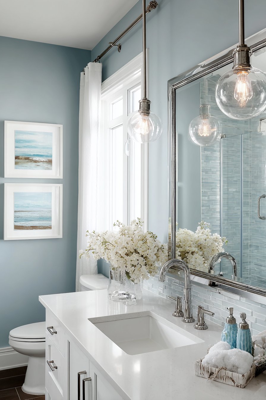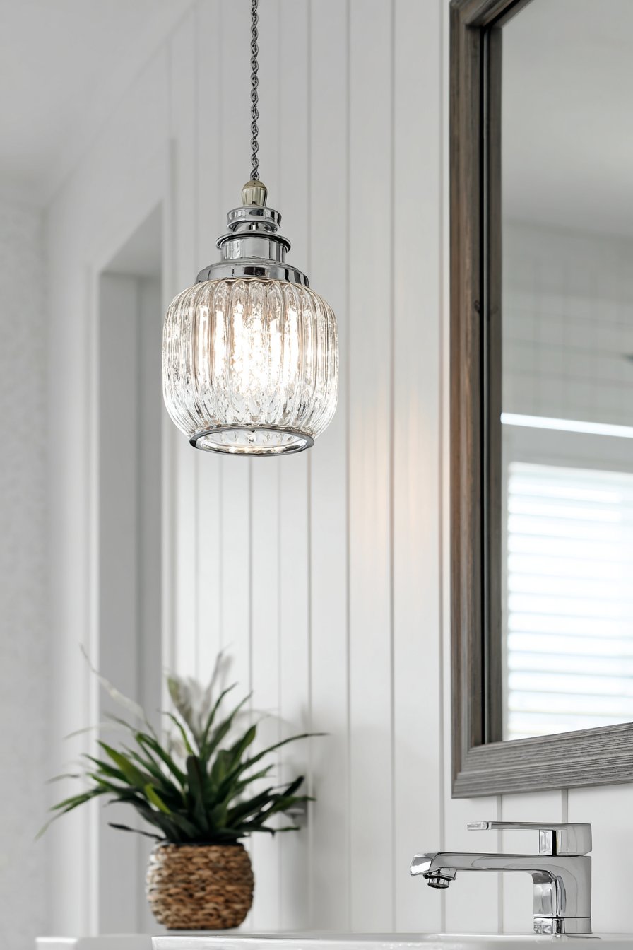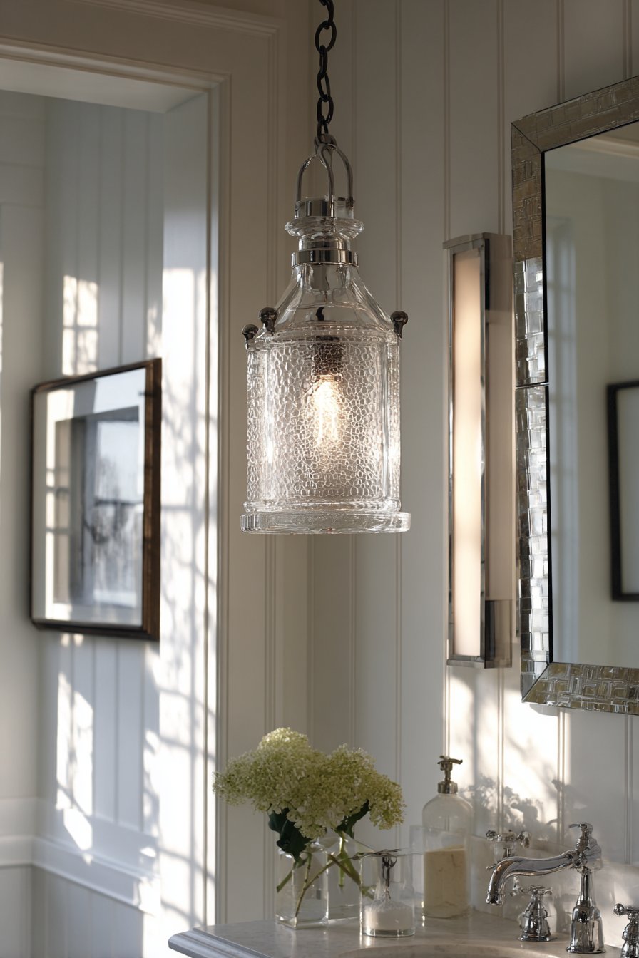 The pendant light makes a bold statement in a small space, proving that size constraints shouldn’t limit your design ambitions—sometimes a larger fixture creates better proportion and impact than multiple small lights. The seeded glass diffuses the bulb’s glare while creating subtle sparkle that mimics how light plays across ocean water, reinforcing the coastal theme through thoughtful material selection. The chrome finish ties into other fixtures throughout the bathroom, maintaining the cohesive finish scheme essential for polished design.
