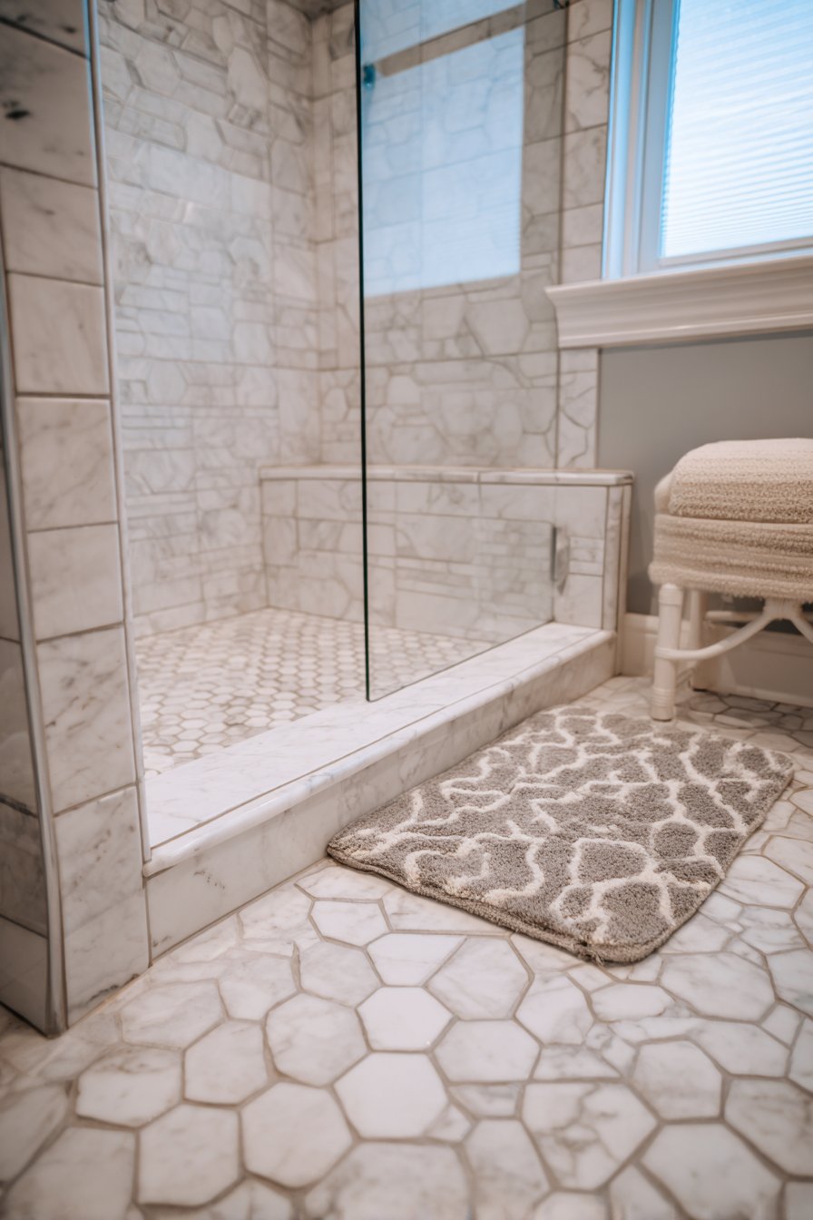 The curbless shower design represents a significant advantage in small bathrooms, eliminating the physical and visual barrier of a traditional shower threshold. This seamless transition creates a more spacious, accessible bathroom while also facilitating easier cleaning since there’s no raised curb to navigate with mops or to trap soap scum. The natural marble veining provides subtle visual interest that prevents the white floor from appearing flat or sterile, while the hexagonal pattern adds geometric intrigue that elevates the design beyond basic grid layouts.