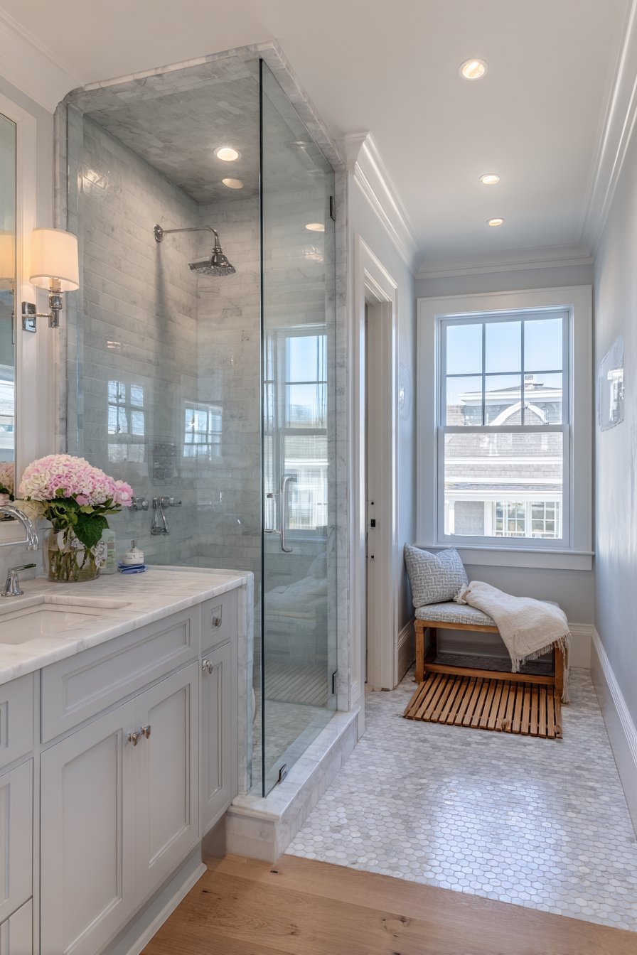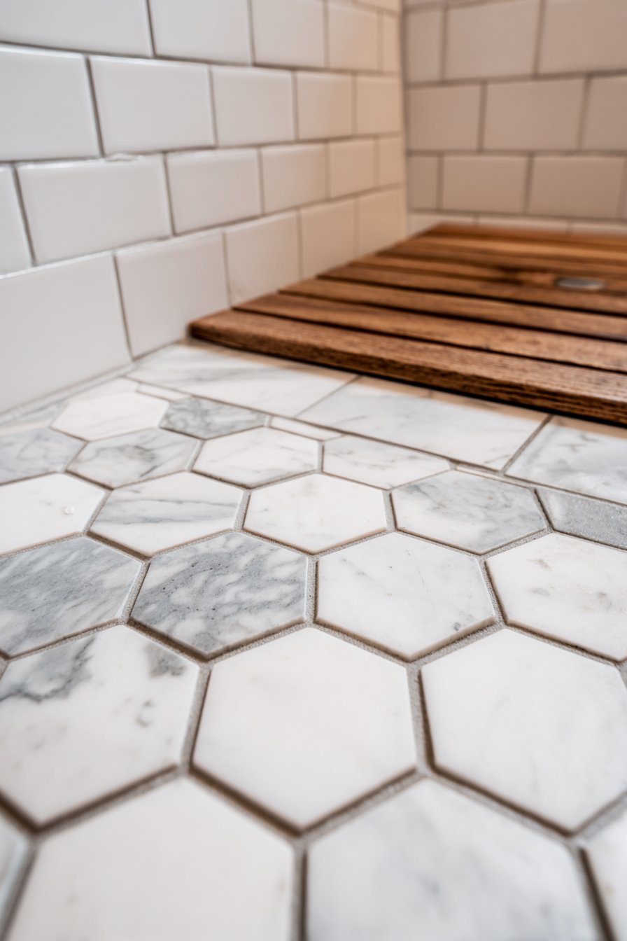 Large white subway tiles cover the shower walls with light gray grout providing subtle definition without creating harsh contrast. The marriage of hexagonal floor tiles and rectangular wall tiles demonstrates how different geometric shapes can work together successfully when they share color palettes and maintain appropriate scale relationships. A teak shower mat introduces warmth and natural coastal character while providing comfortable, non-slip footing—the rich wood tones create welcome contrast against the predominantly white and gray palette.
